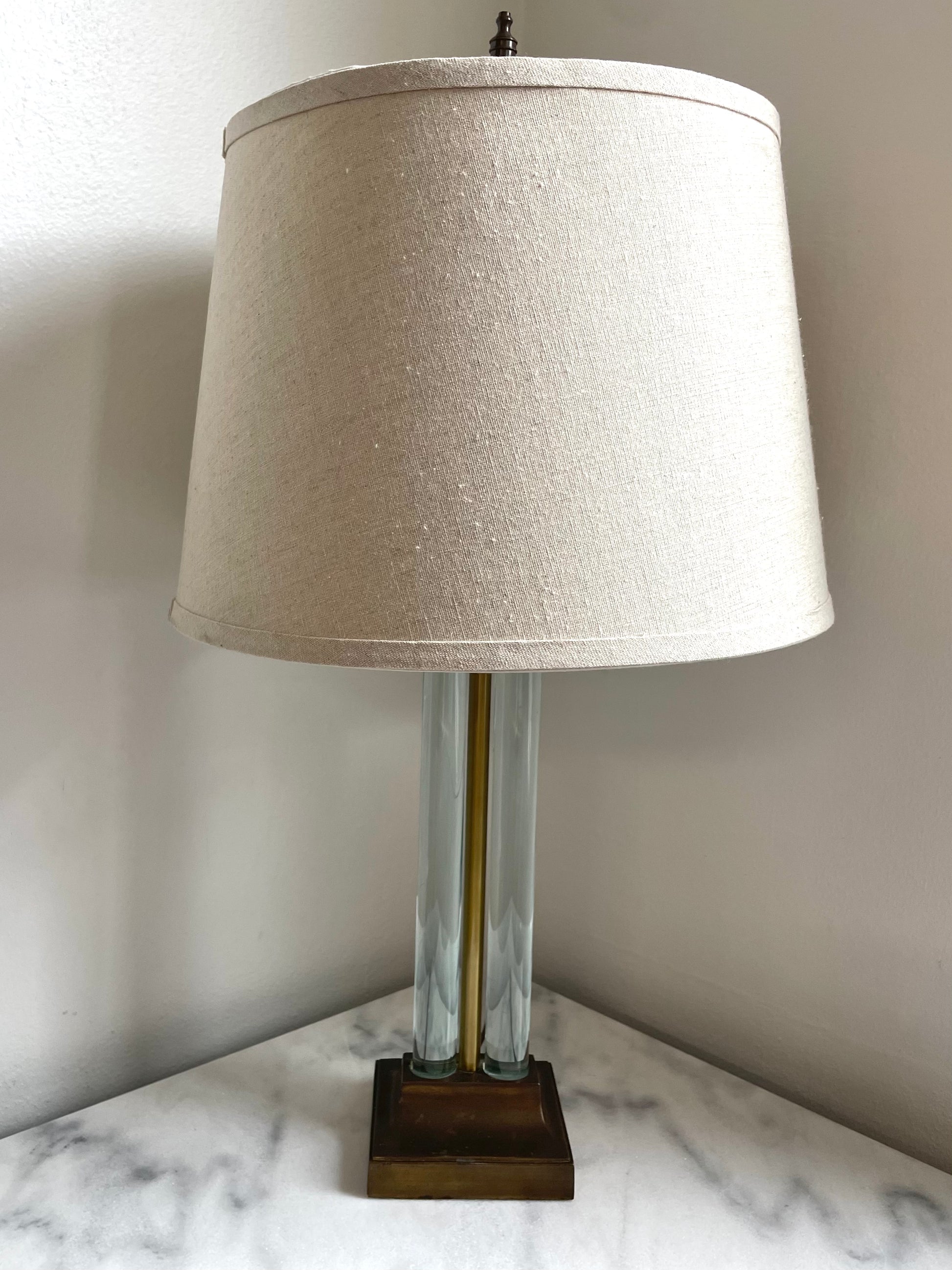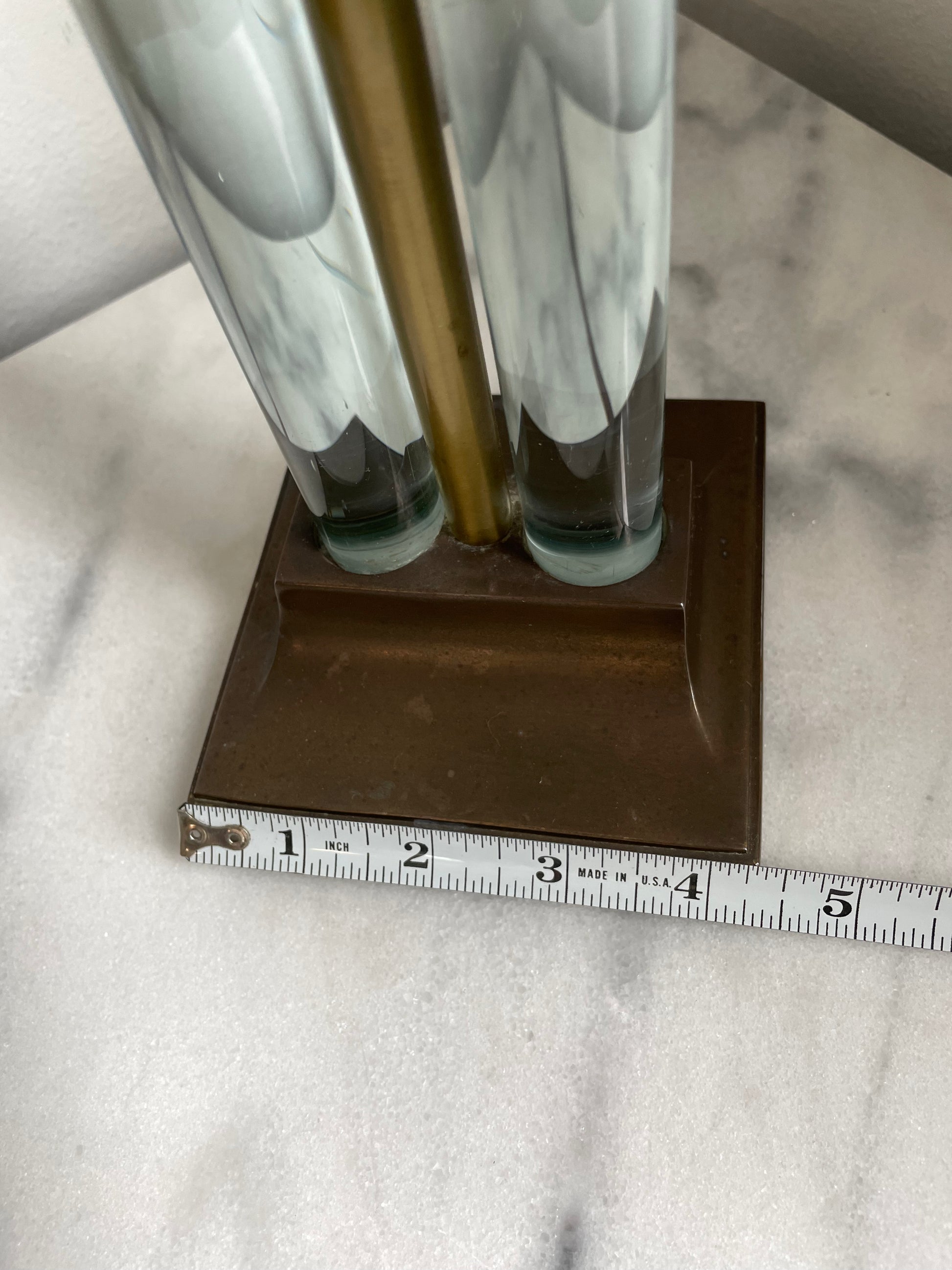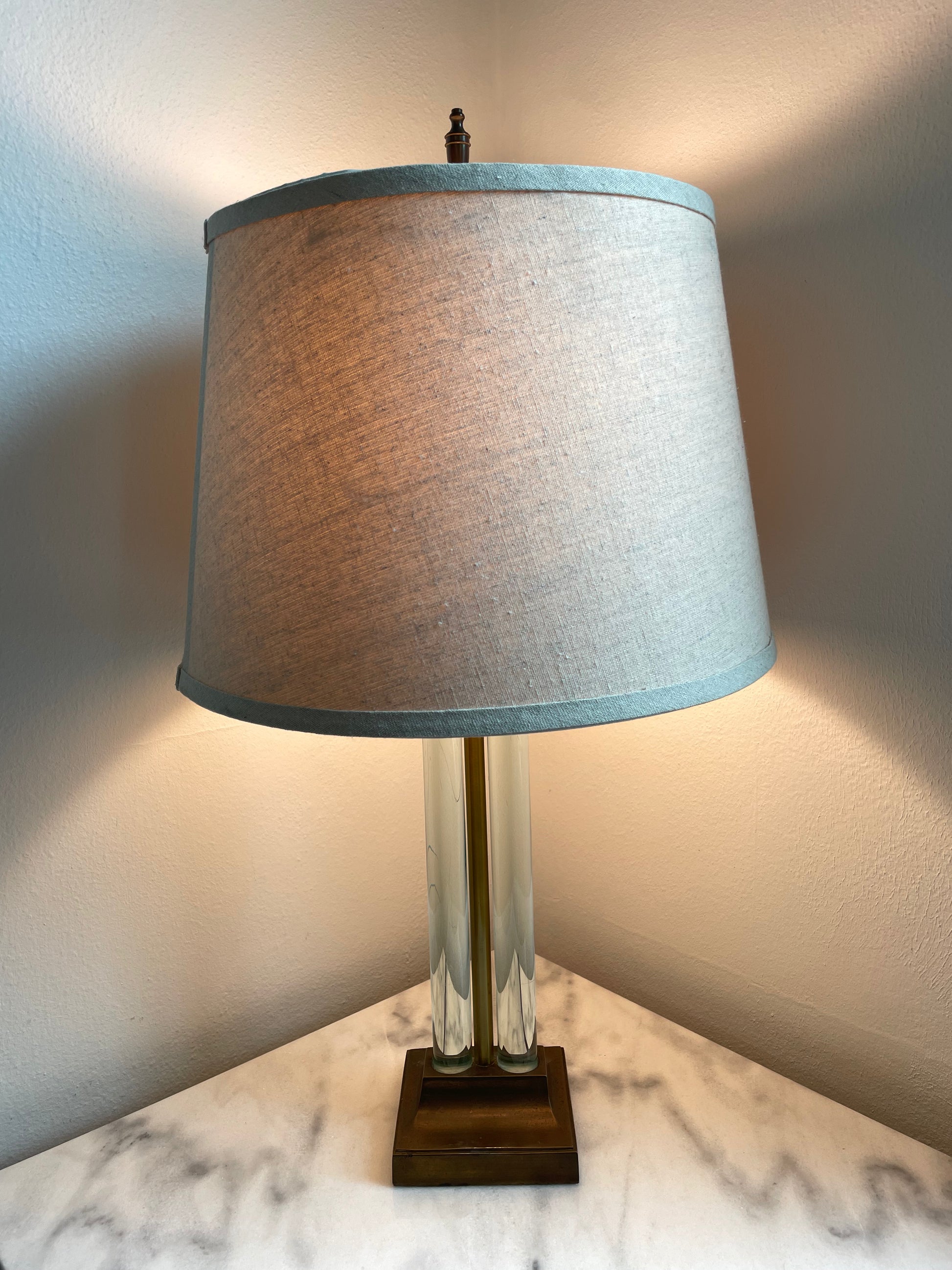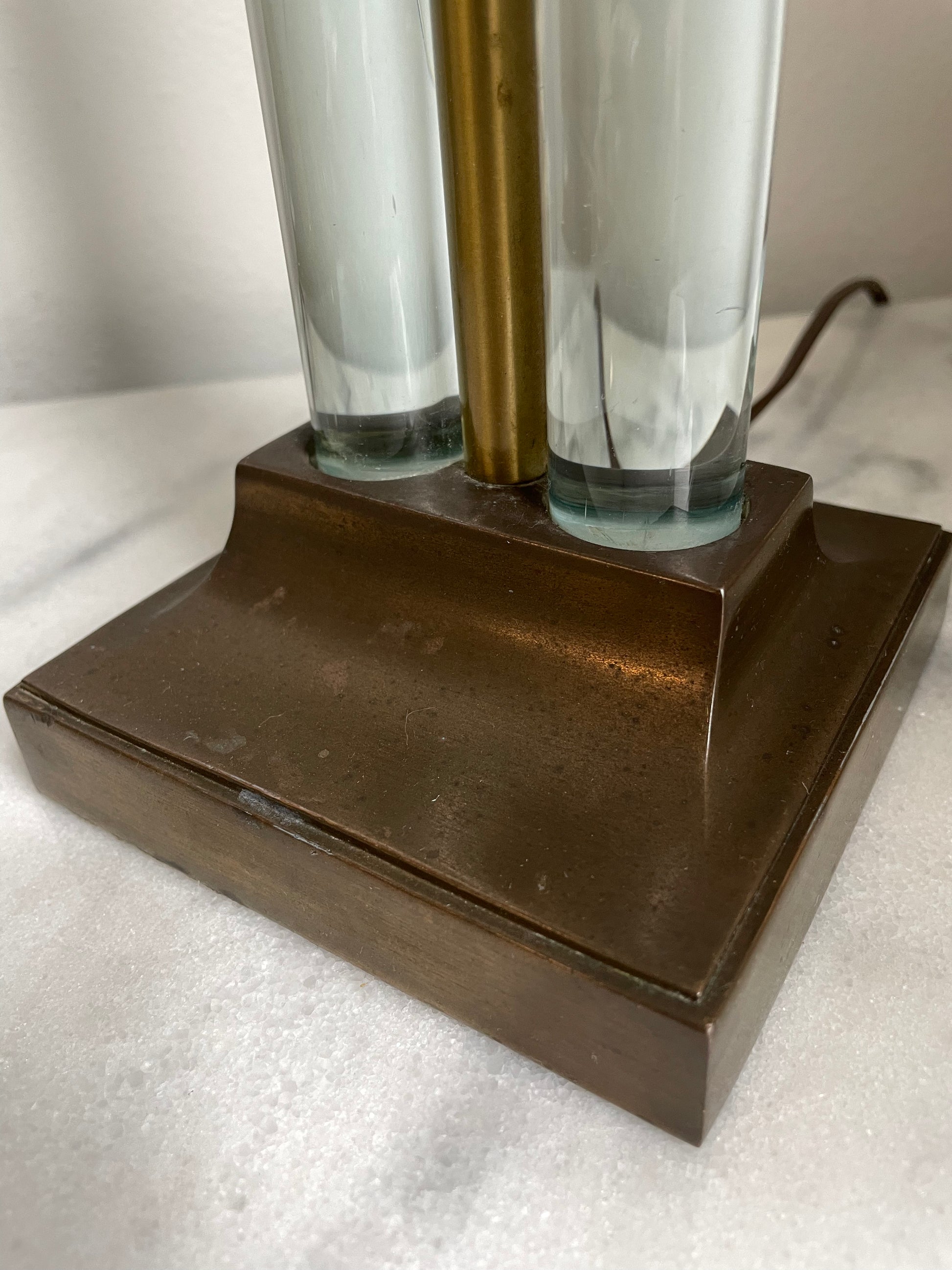 An elegant table lamp designed by Gilbert Rohde- one of the pioneers of modern design in America- for MSLC (Mutual Sunset Lamp Co), circa 1940. It features a tiered nickel base with a cylindrical column rising from the center flanked by two translucent glass rods. This table lamp blends perfectly with any style of interior from traditional to contemporary.