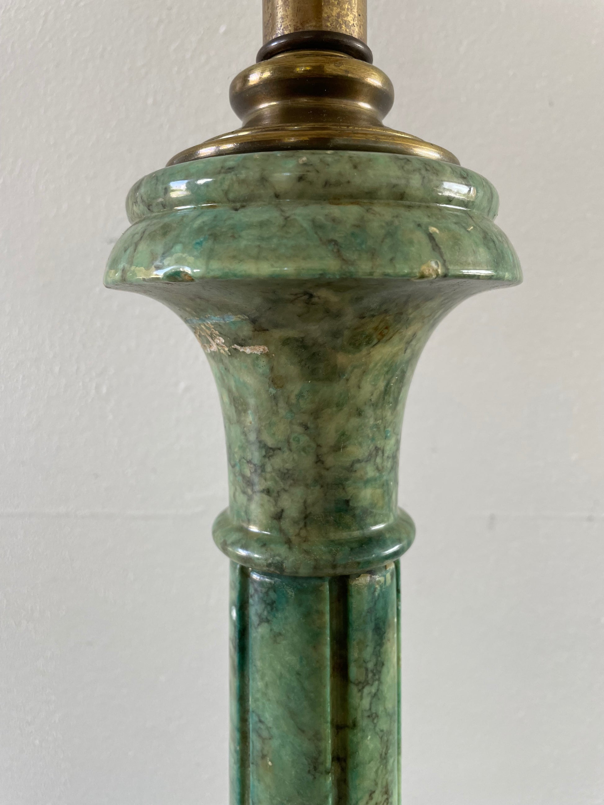 Vintage 1940's Italian Neoclassic hand carved green alabaster and brass column table lamp. Elegant, tall and slender fluted column on square brass base.
