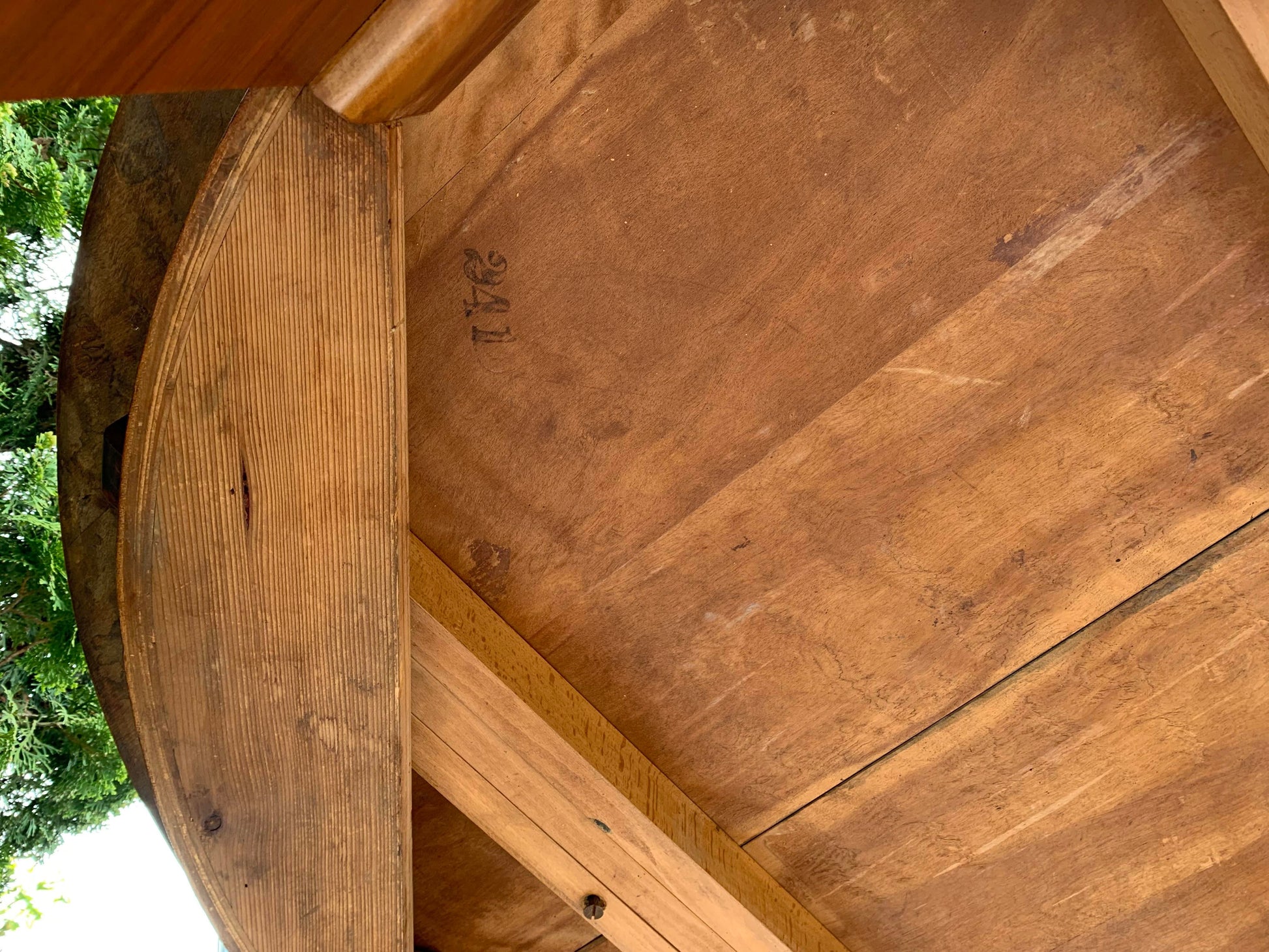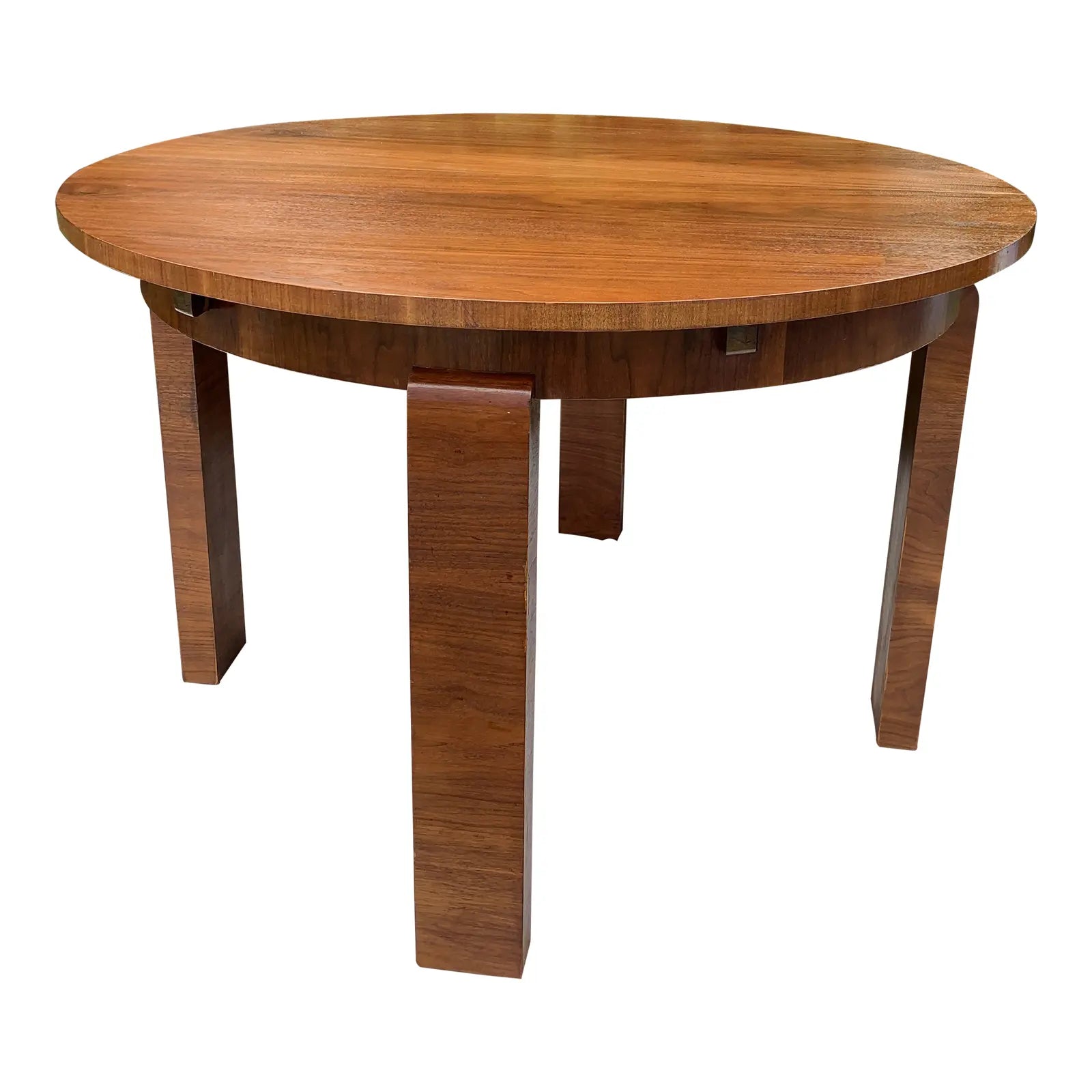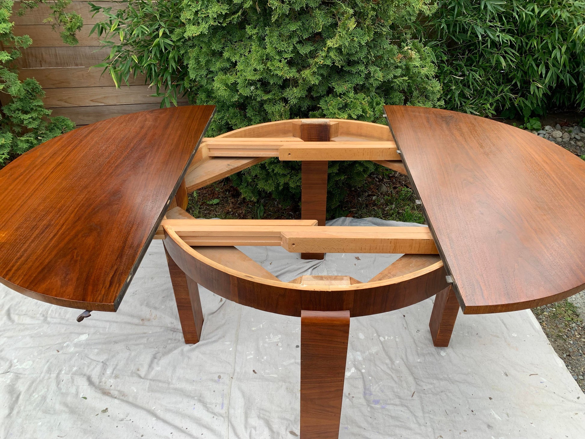 Fantastic Art Deco era circular walnut expandable dining table with waterfall leg design. The extra leaf for the table extension is stored outside of the table and is a different wood. Table slides to open easily to 71in wide. The wood is in remarkable shape for its age. We can't pinpoint the exact decade but somewhere between 1930s-50s. Only stamp found is a number under both the table and the leaf.