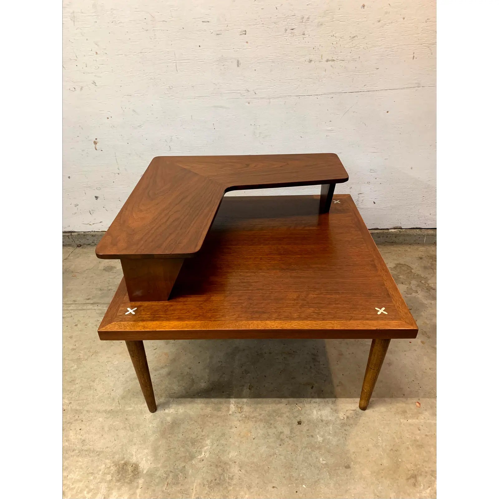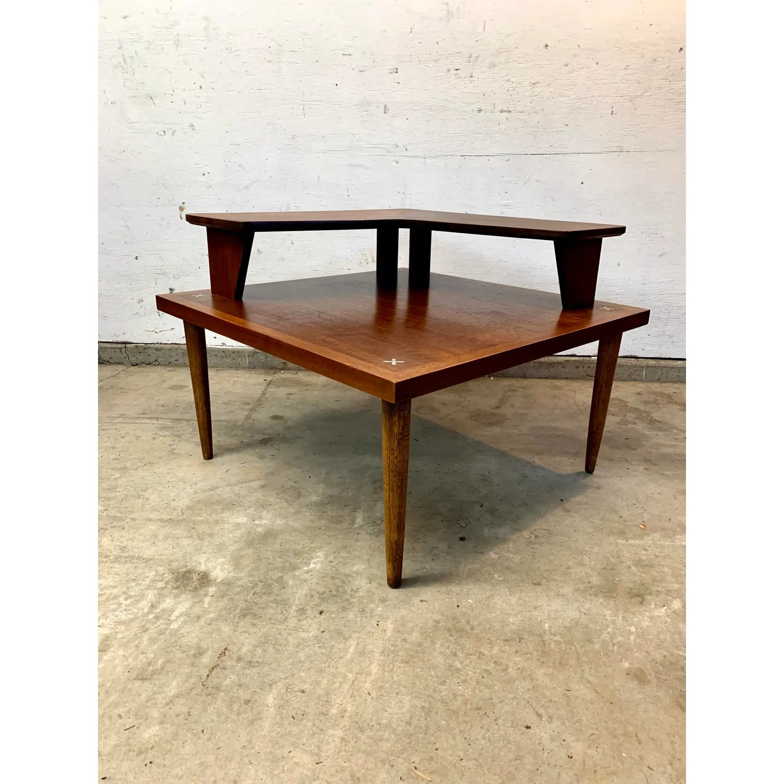 Mid Century Two Tier Corner table. Stylish mid-century modern Merton Gershun for American of Martinsville end table. Recently refinished walnut grain looks incredible. Features unique X-shaped ornamental inlays in brushed aluminum.