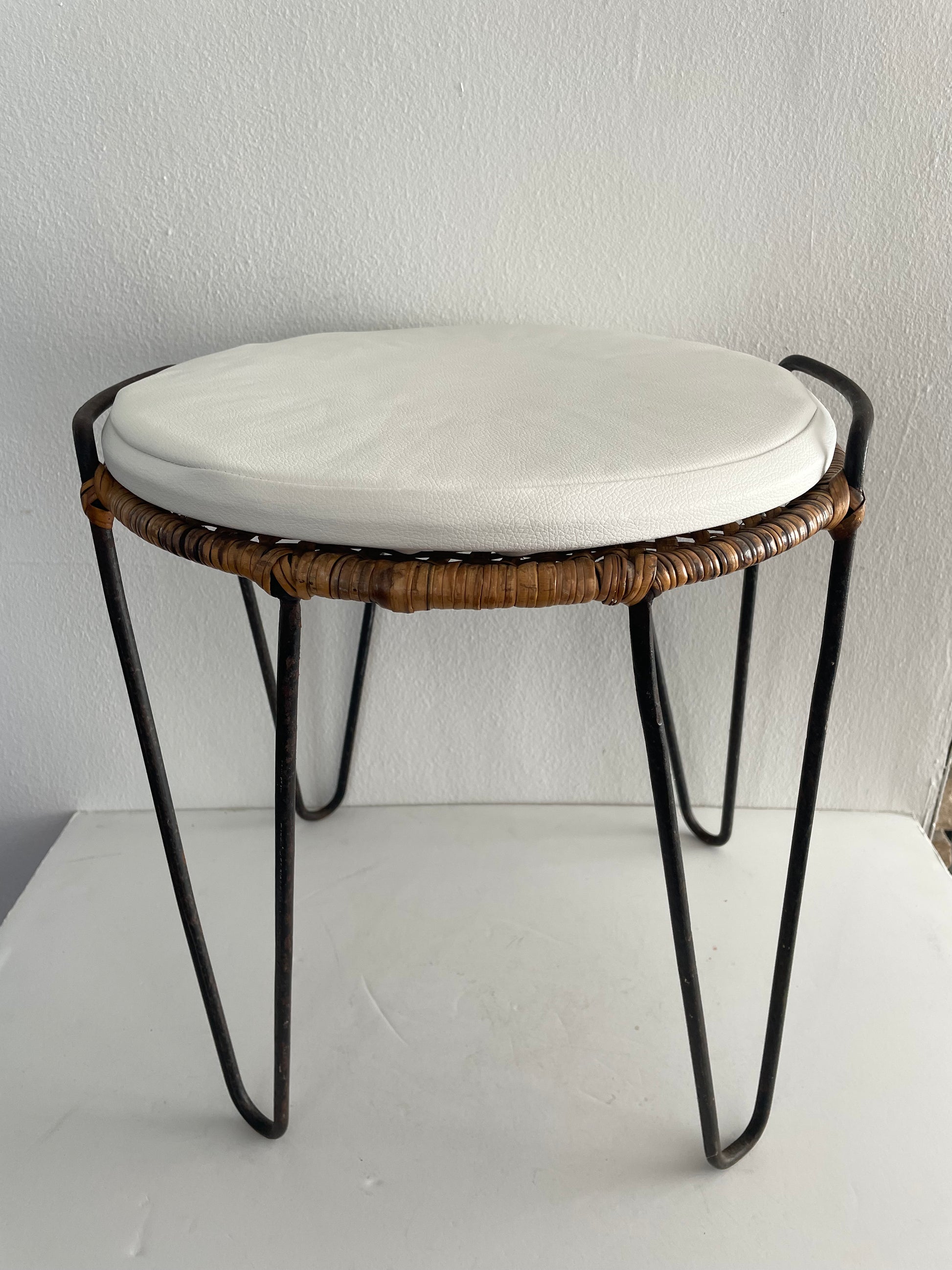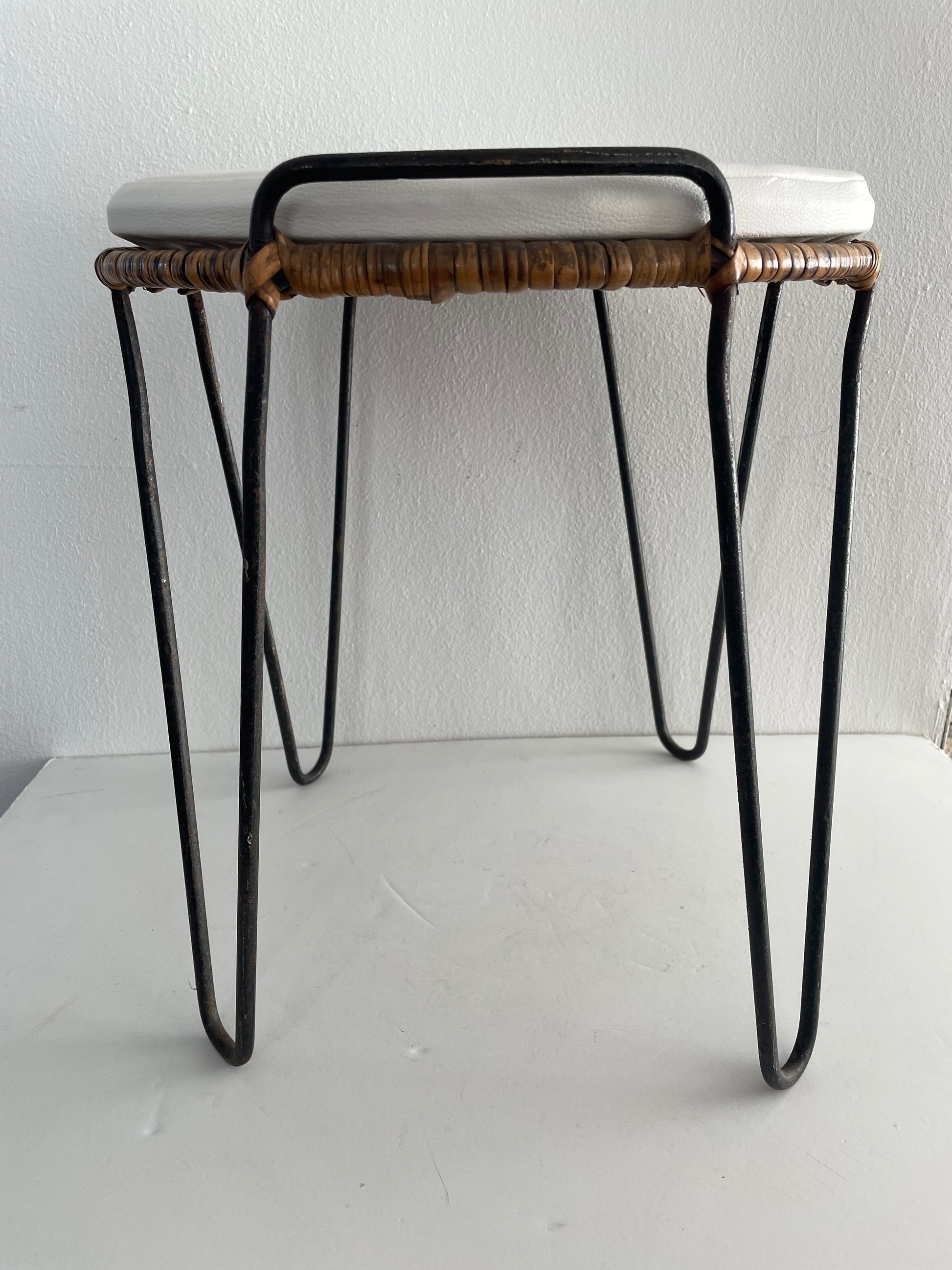 Iron hairpin and cane rattan stool seat/side table attributed to designer Tony Paul, circa 1950s. In good vintage condition with original seat top covered with new white pleather cushion wrap. Dimensions are 14.5" diameter x 16" height.