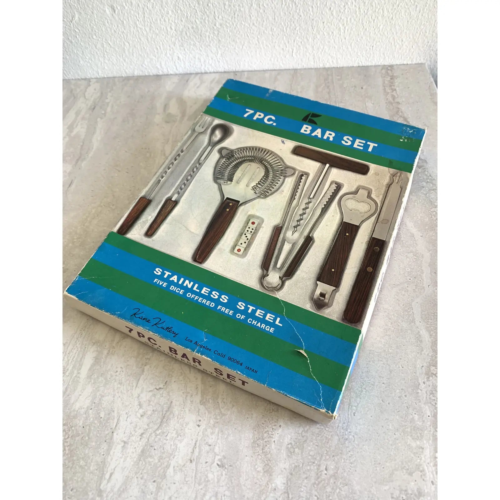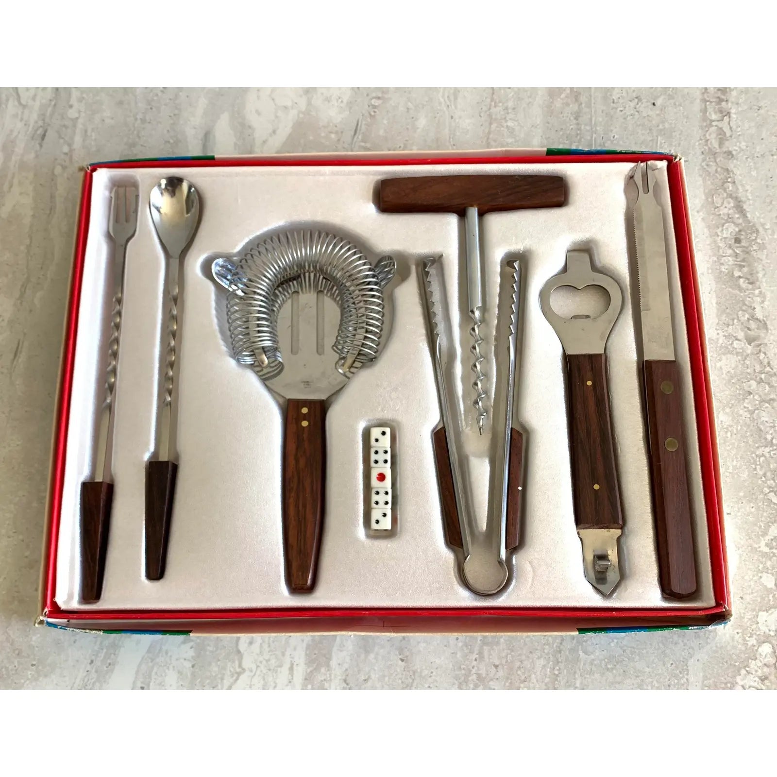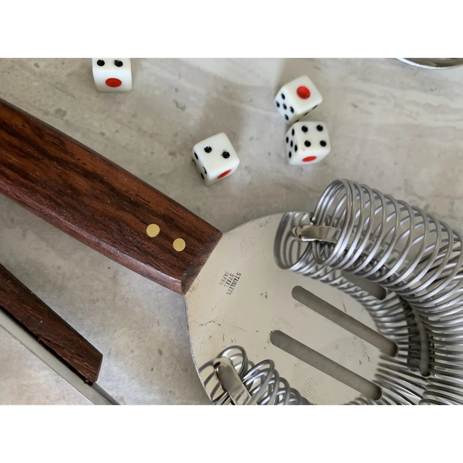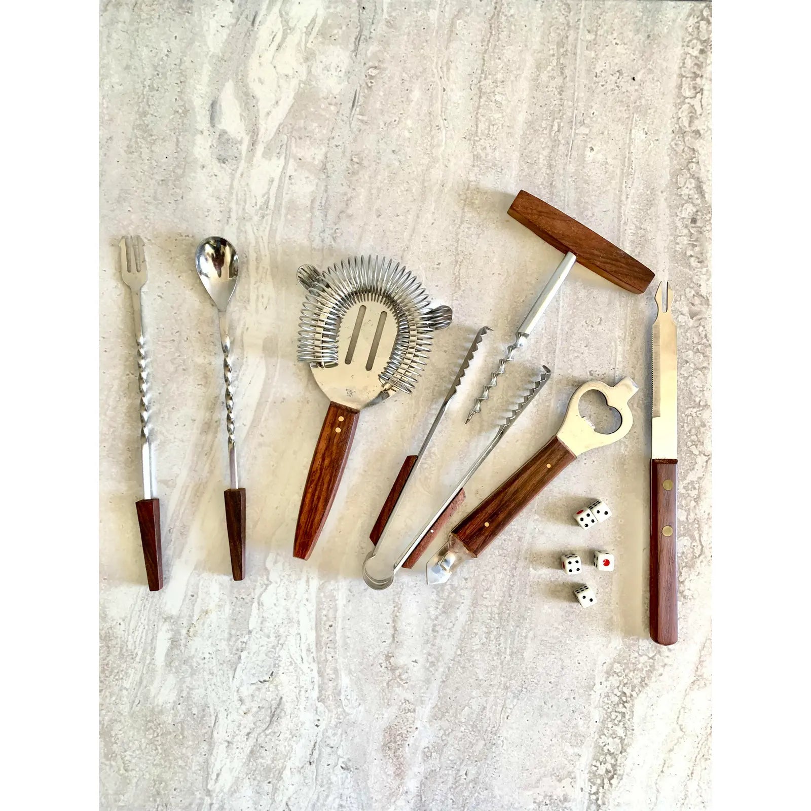 1960s Mid-Century Modern Japanese Rosewood Handled Barware With Mini Dice- 7 Pieces