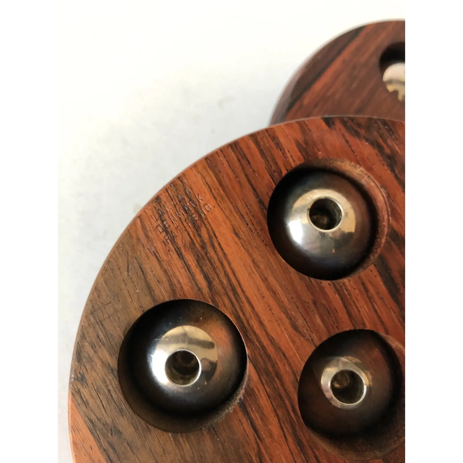 Gorgeous mid century modern pair of Danish candle holders made from solid rosewood with silver plated steel ball holders that pop out and are reversible to accommodate either 1/2" or 1/4" taper candles. Rare pair of Danish Modern Nissen Rosewood 6 Piece Candle Holders.