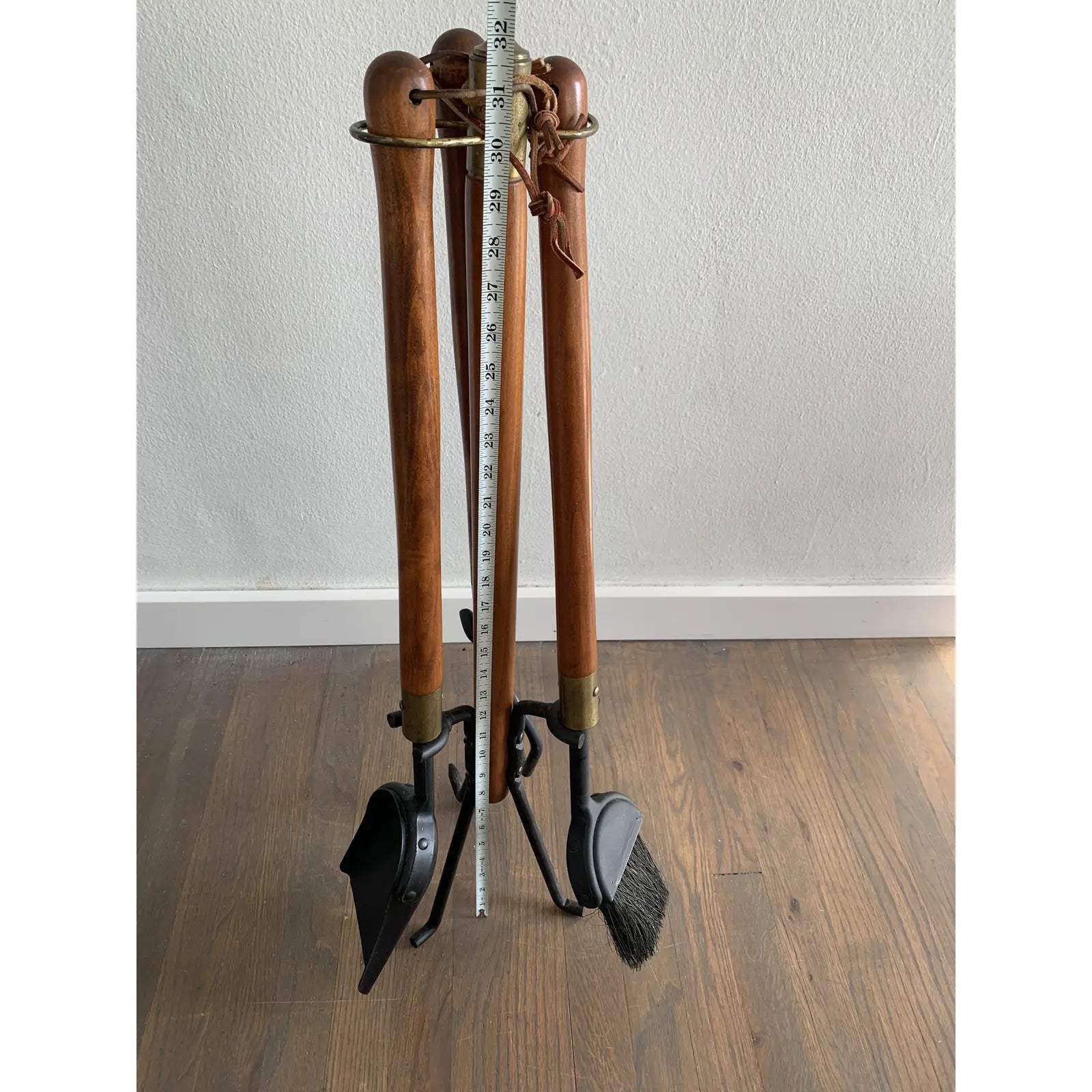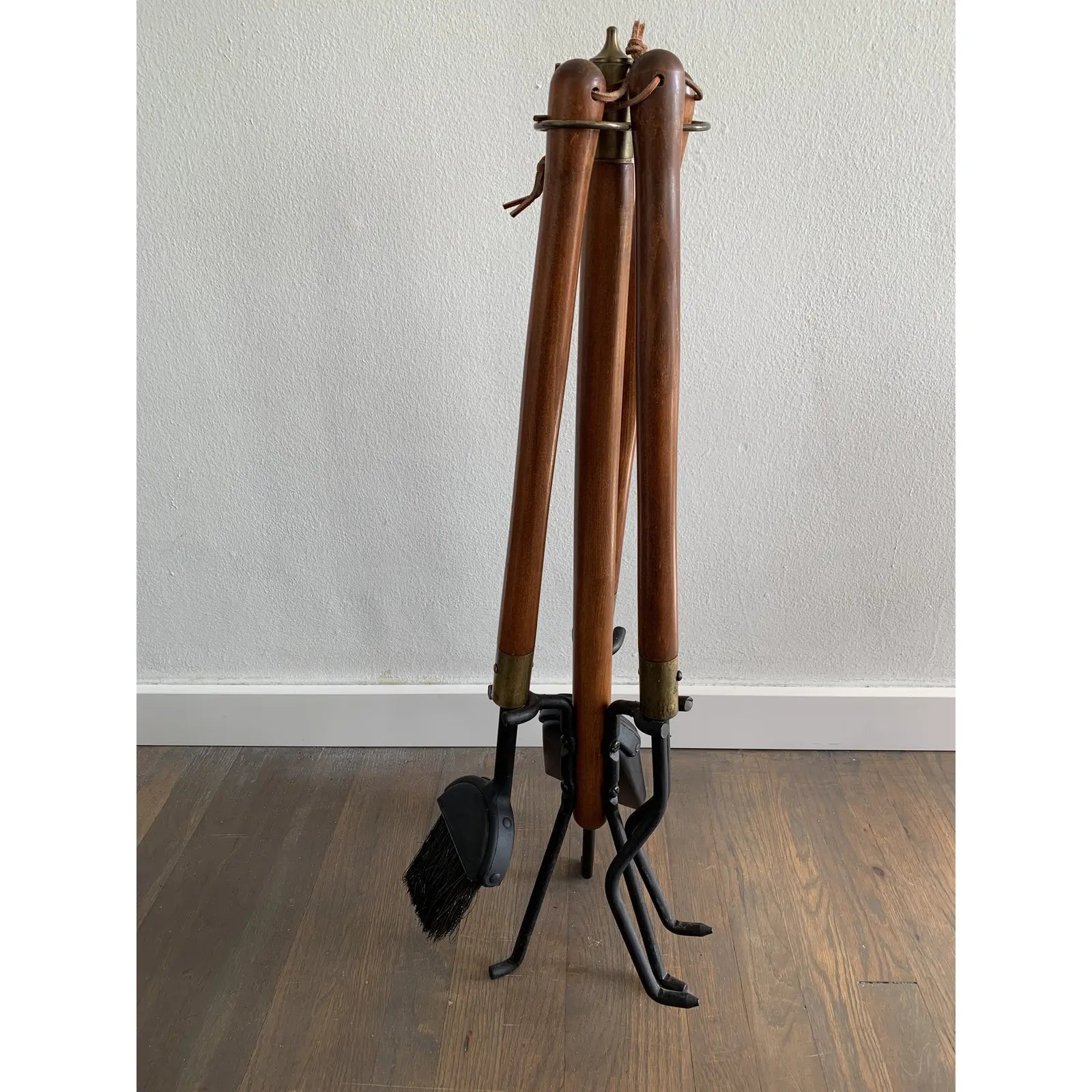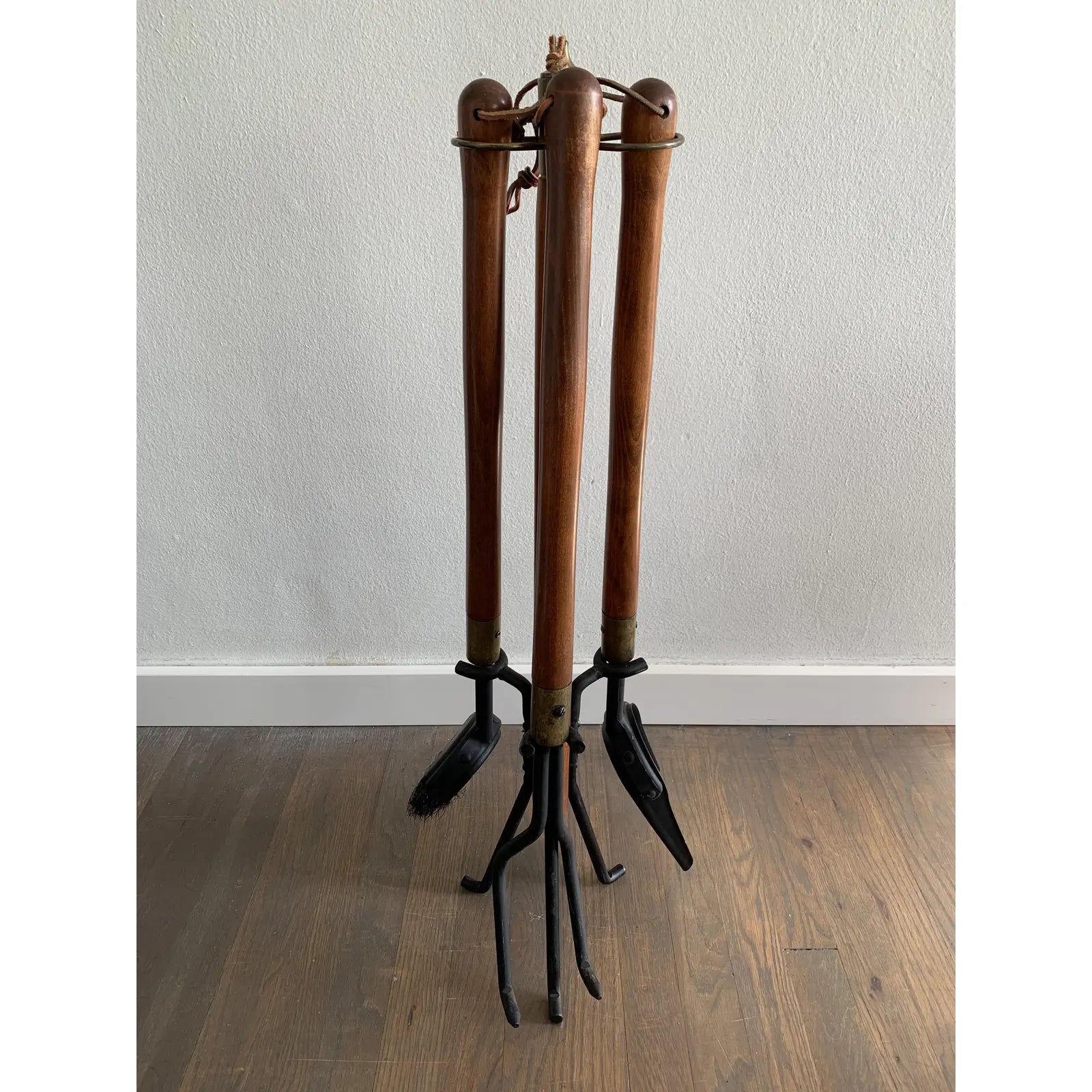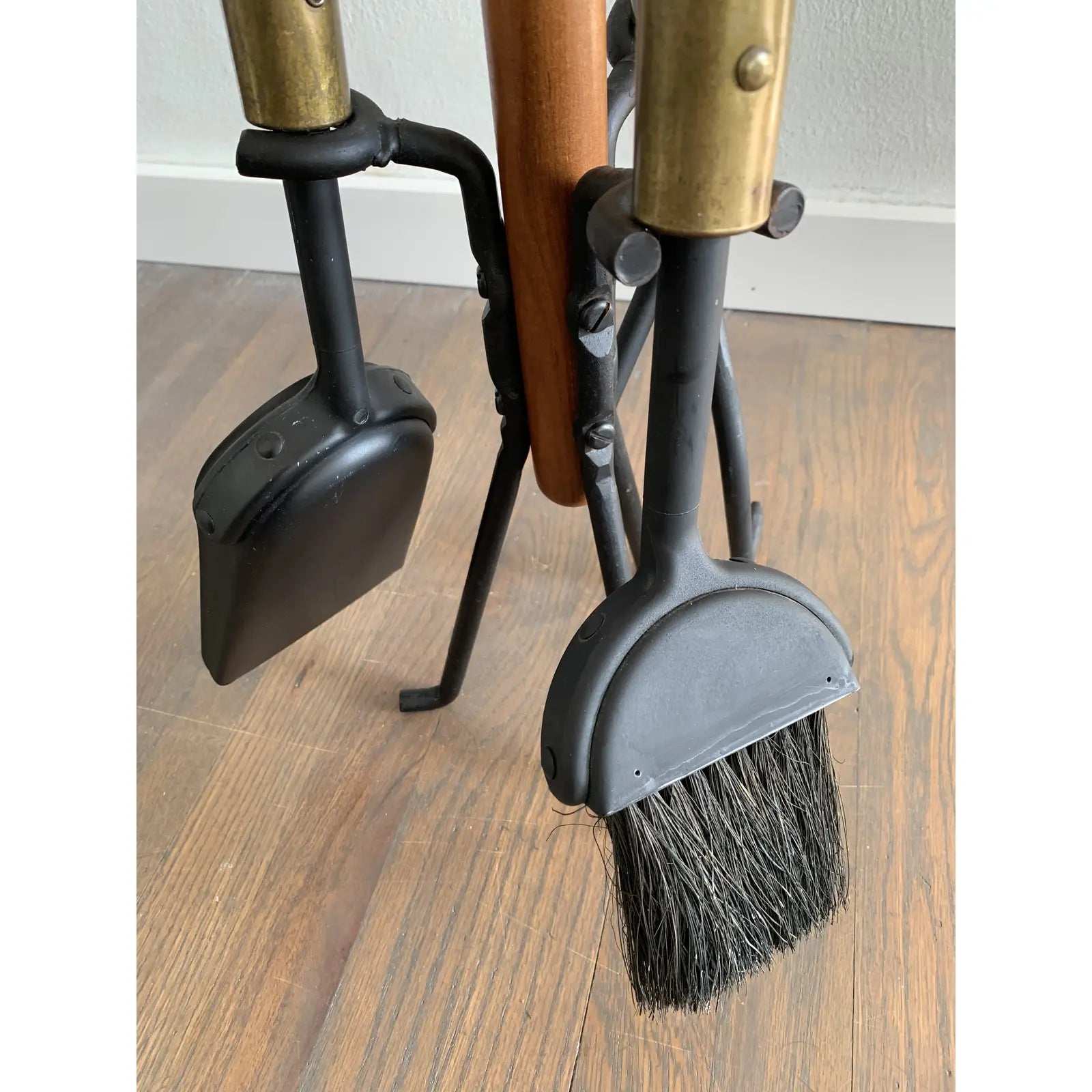 Classic mid century modern three piece teak and iron set of fireplace tools with stand. Sturdy sculpted teak wood handles with brass transitions on top of iron tools. This set includes tongs, broom and shovel. All hook/balance onto wood columned, brass topped holder with iron feet.