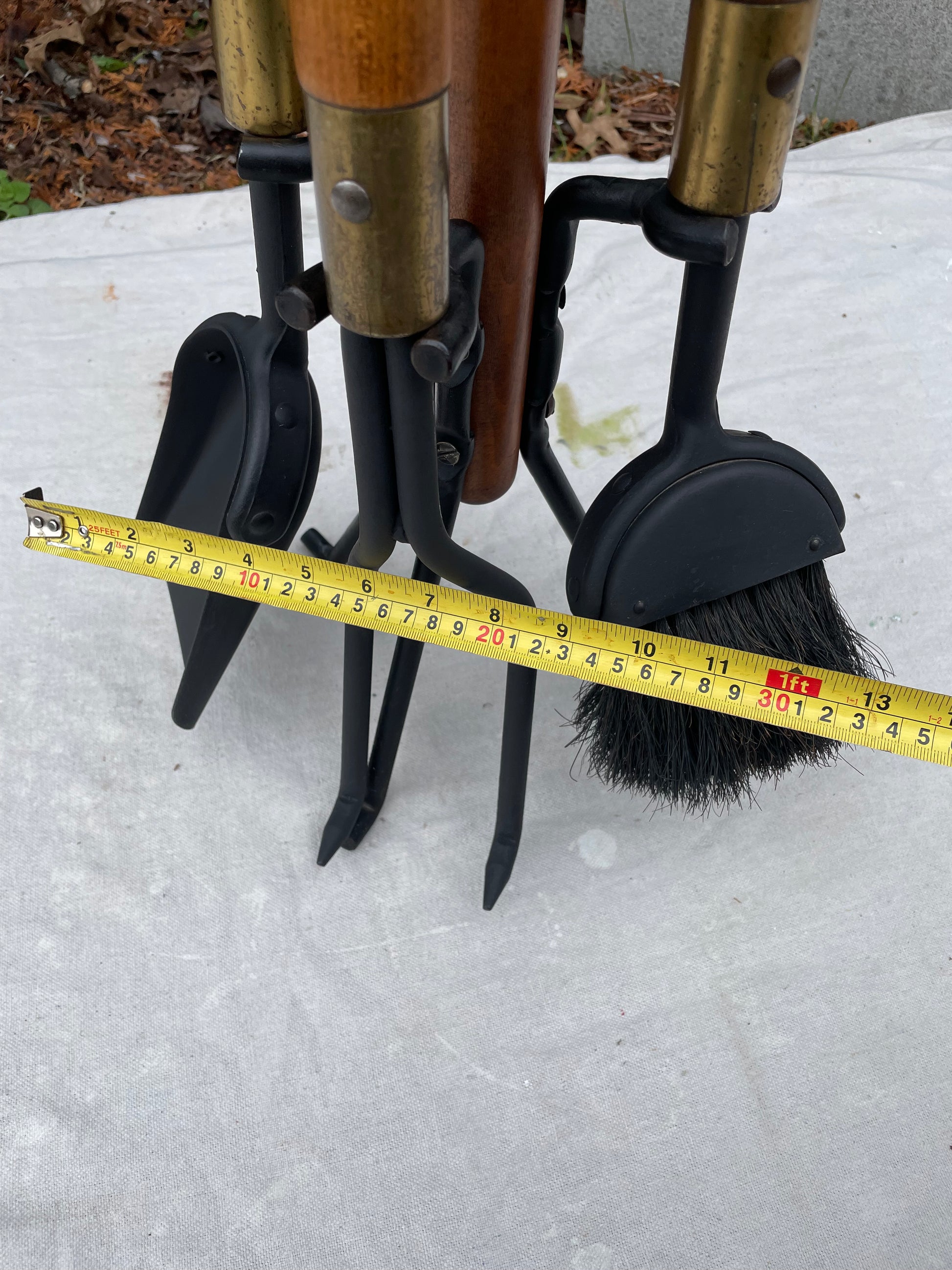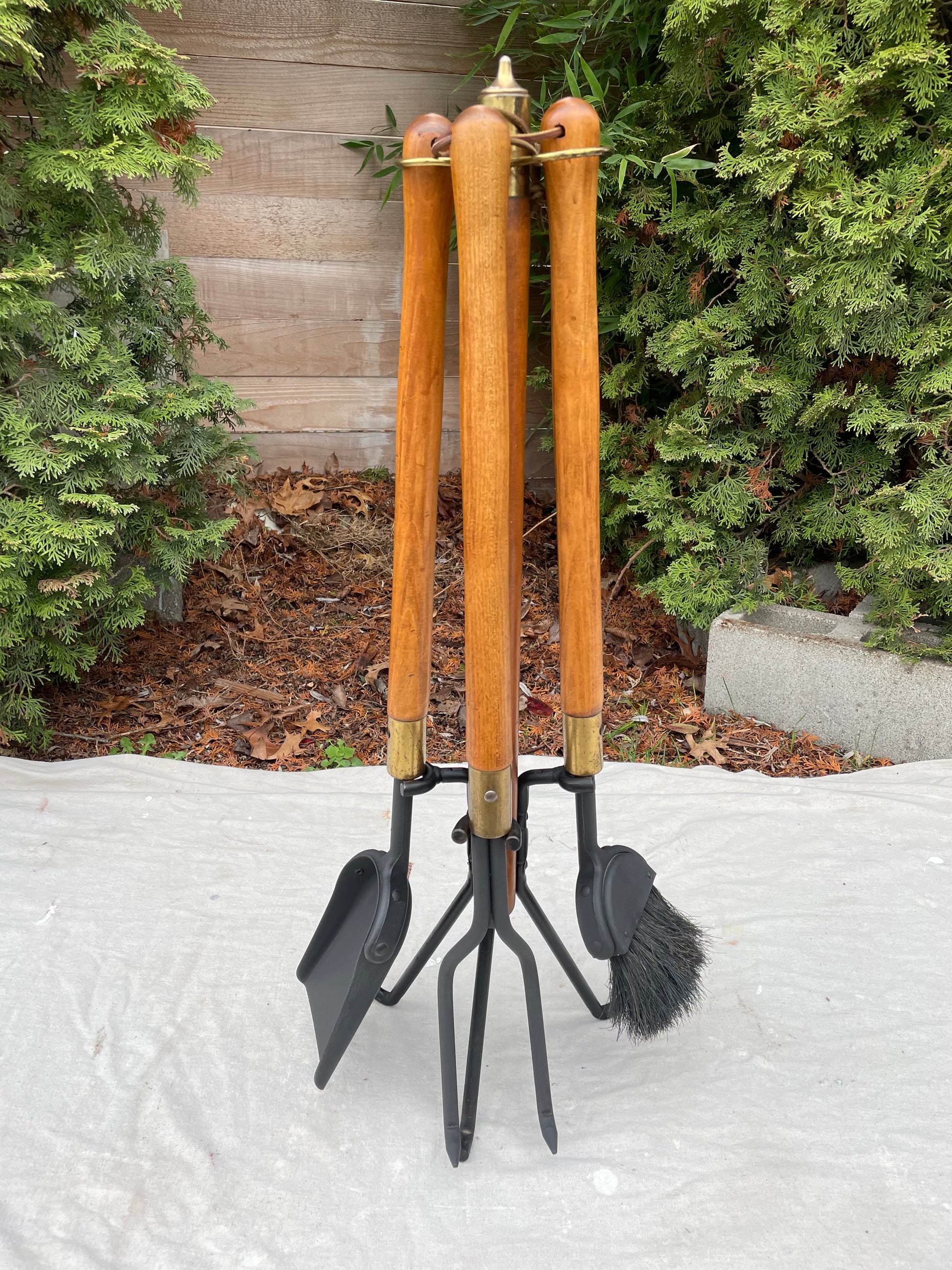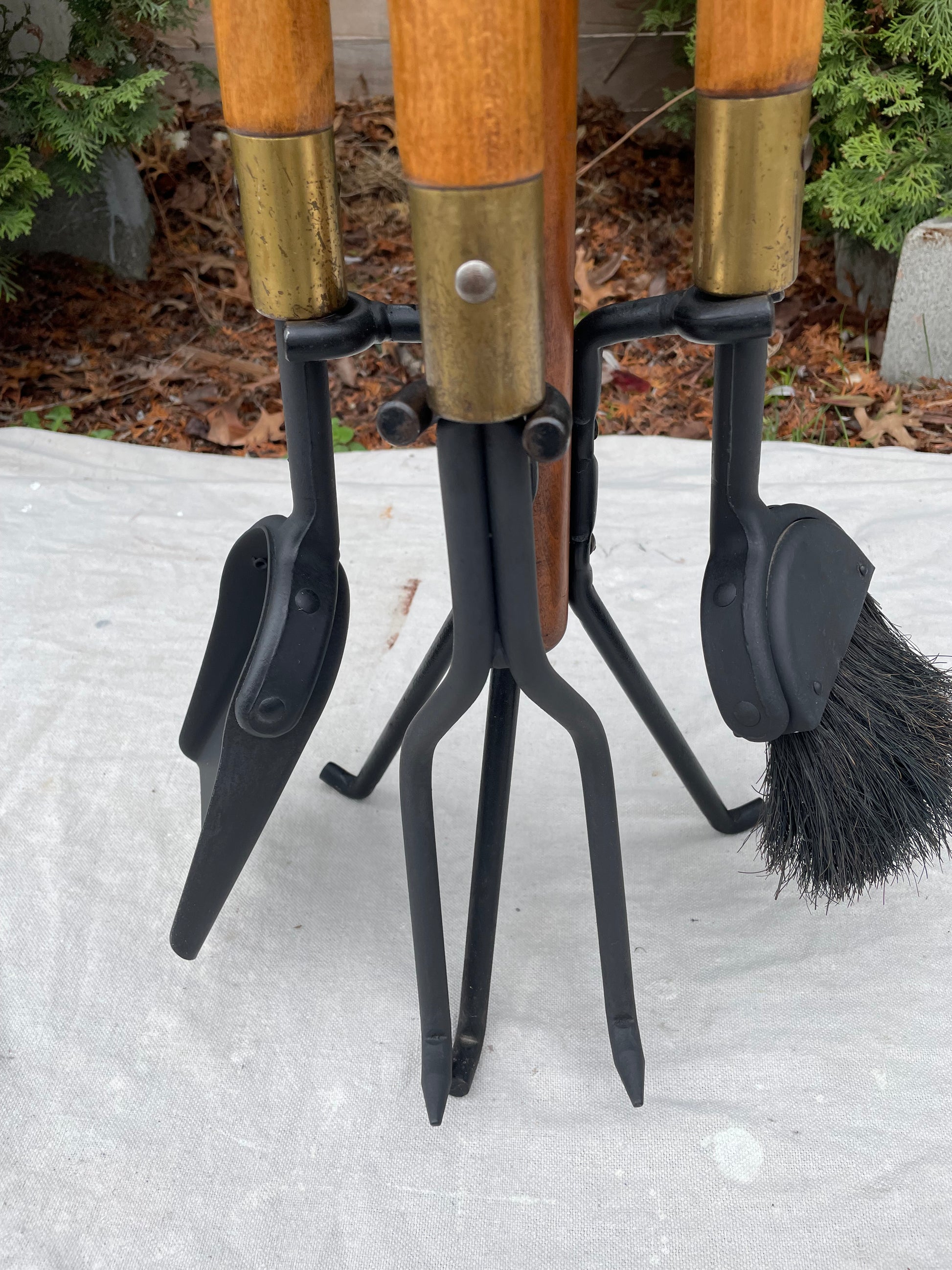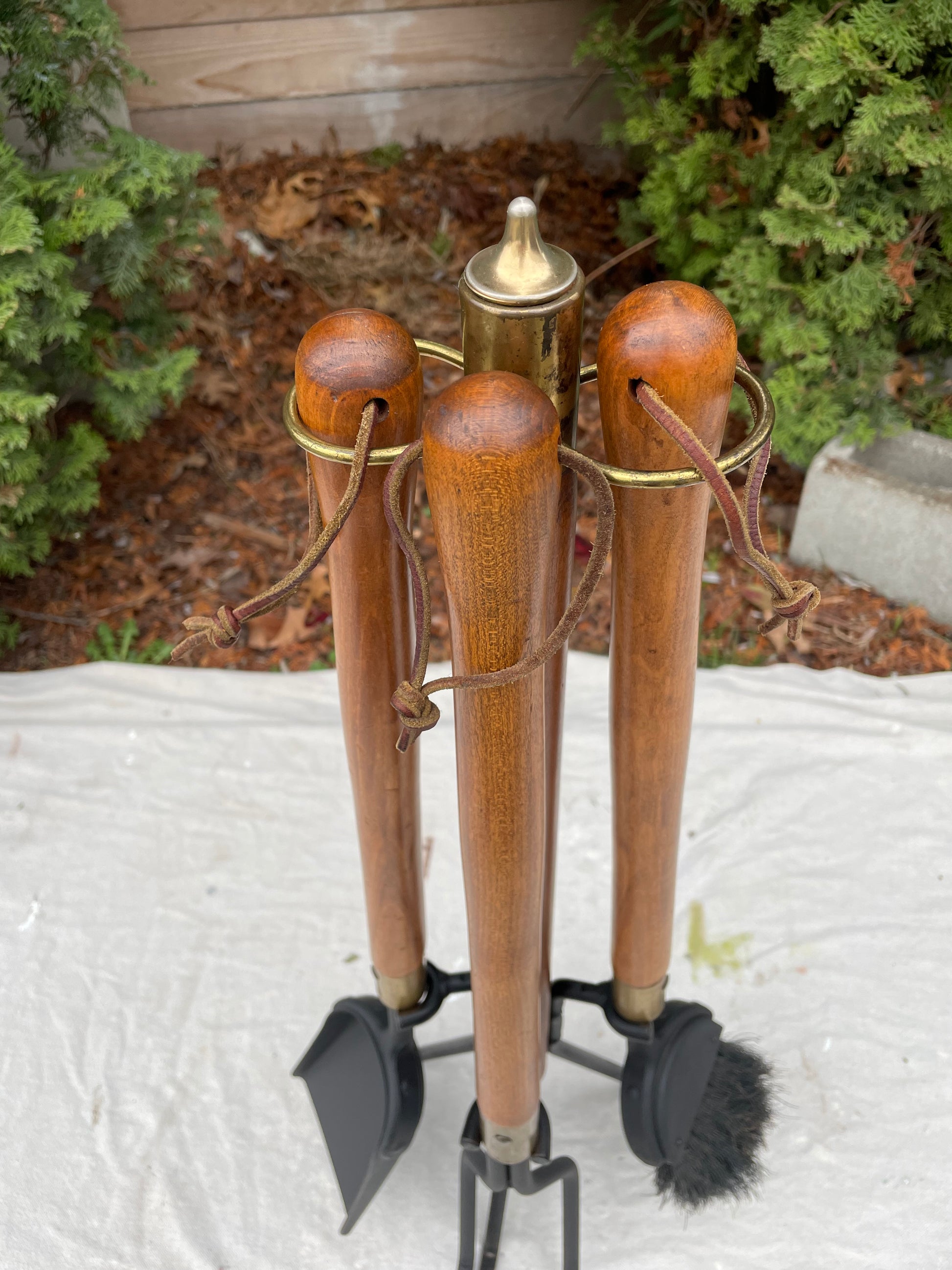 Classic mid century modern three piece wood and iron set of fireplace tools with stand. Sturdy sculpted wood handles with brass transitions on top of iron tools. This set includes tongs, broom and shovel. All hook/balance onto wood columned, brass topped holder with iron feet.