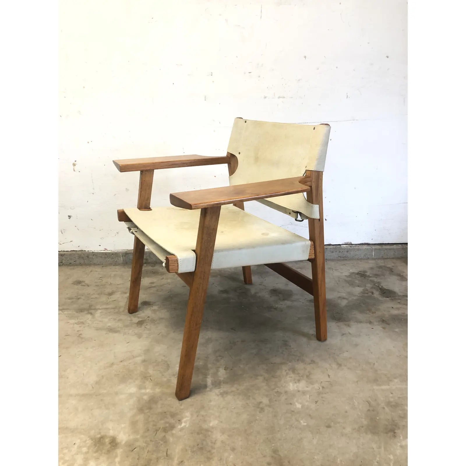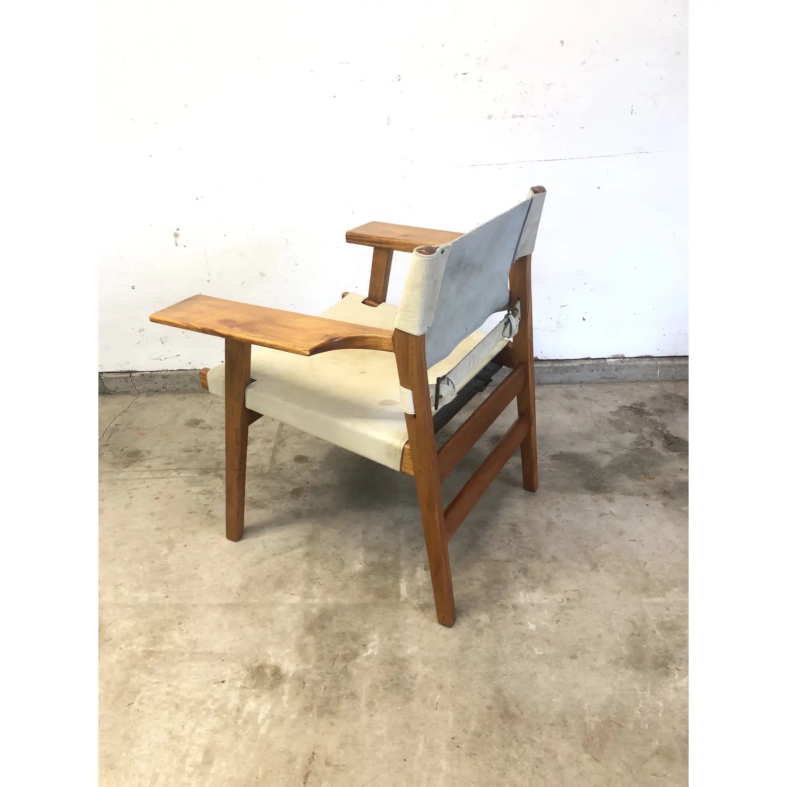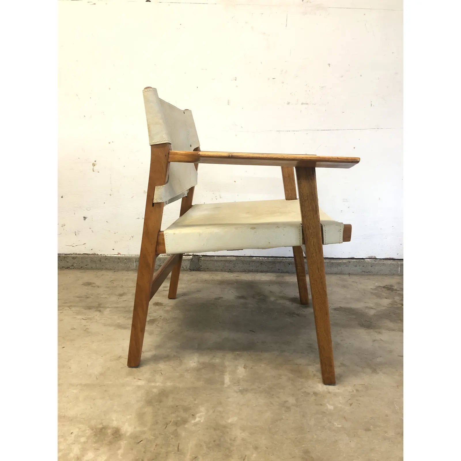 Borge Mogenson armchair in tropical wood with white/off white leather belted seat back. "Spanish Chair" from 1958 with the leather, the frame angles, and the scale of the "paddle" armrests.