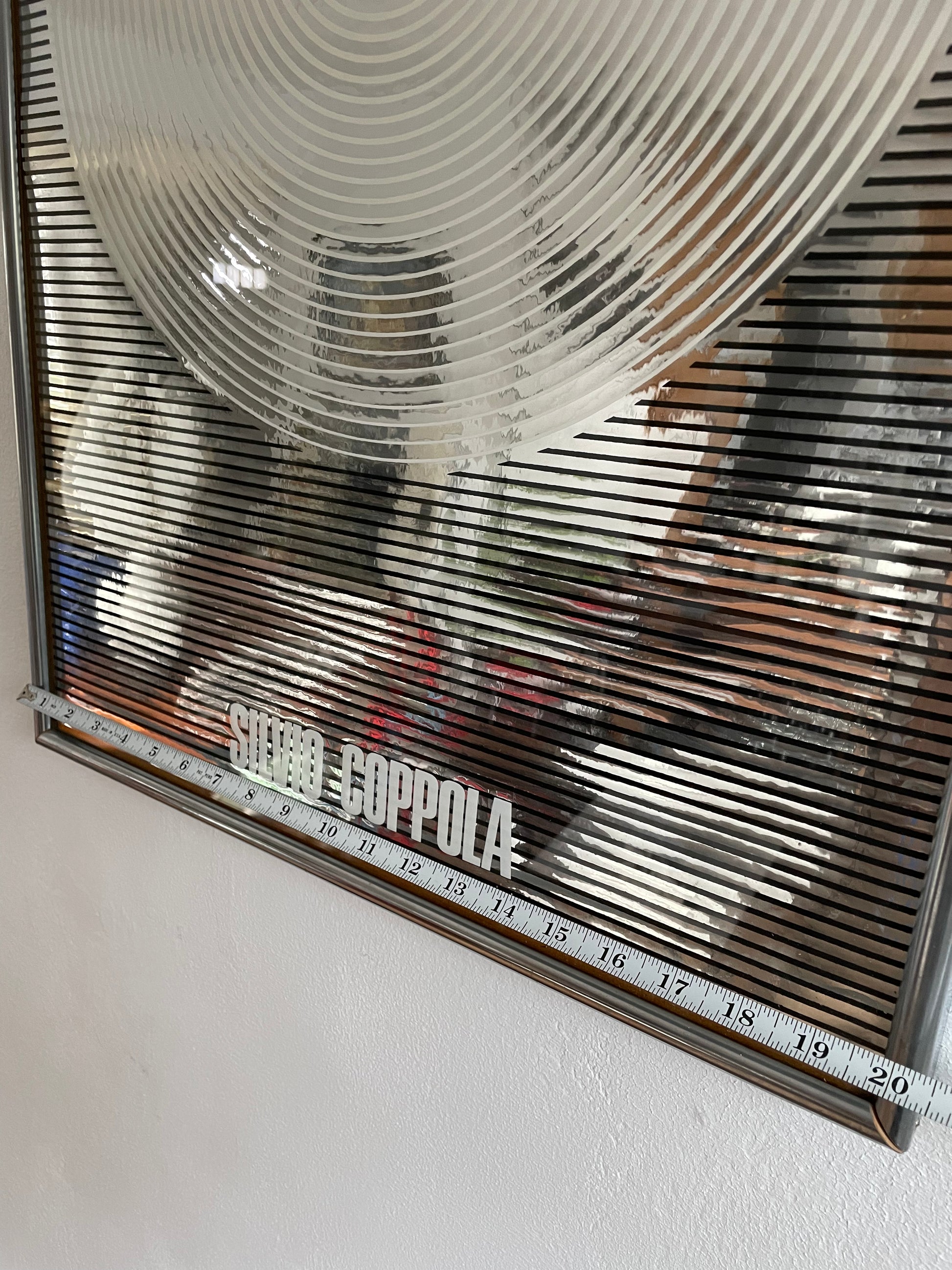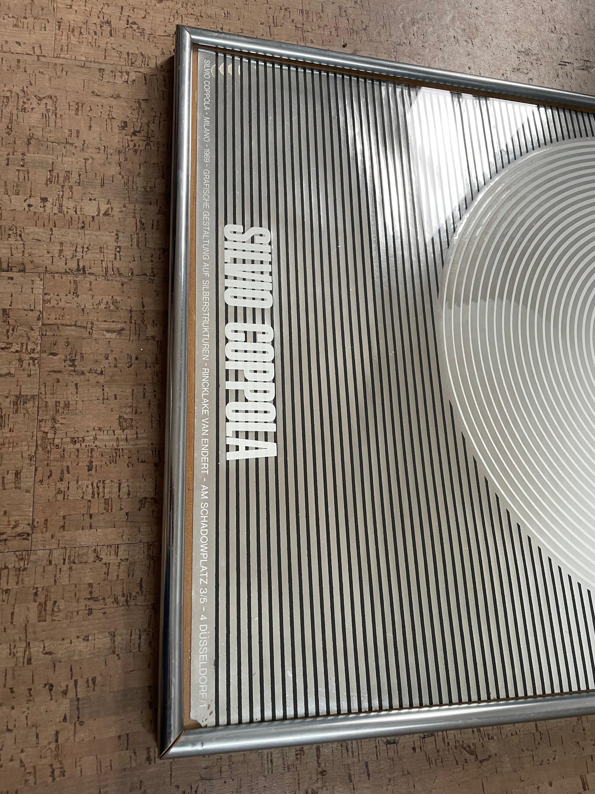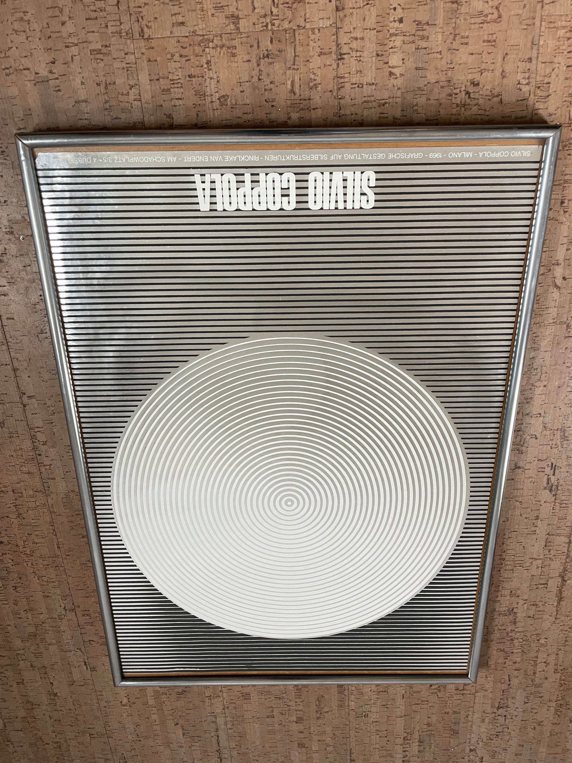 An original vintage reflective metallic framed graphic op art poster by Silvio Coppola, Milano, Italy. Framed in a silver-tone frame.
