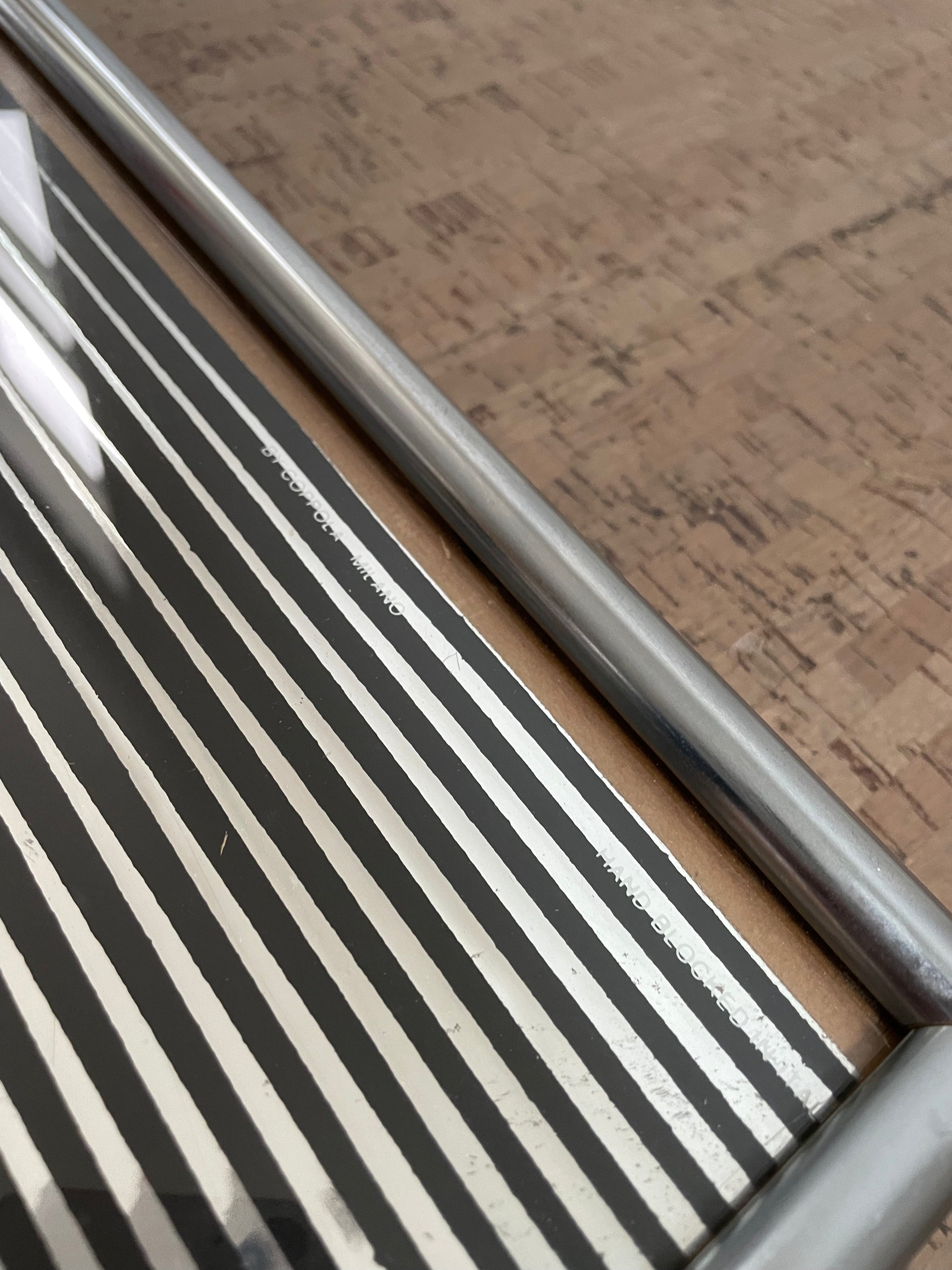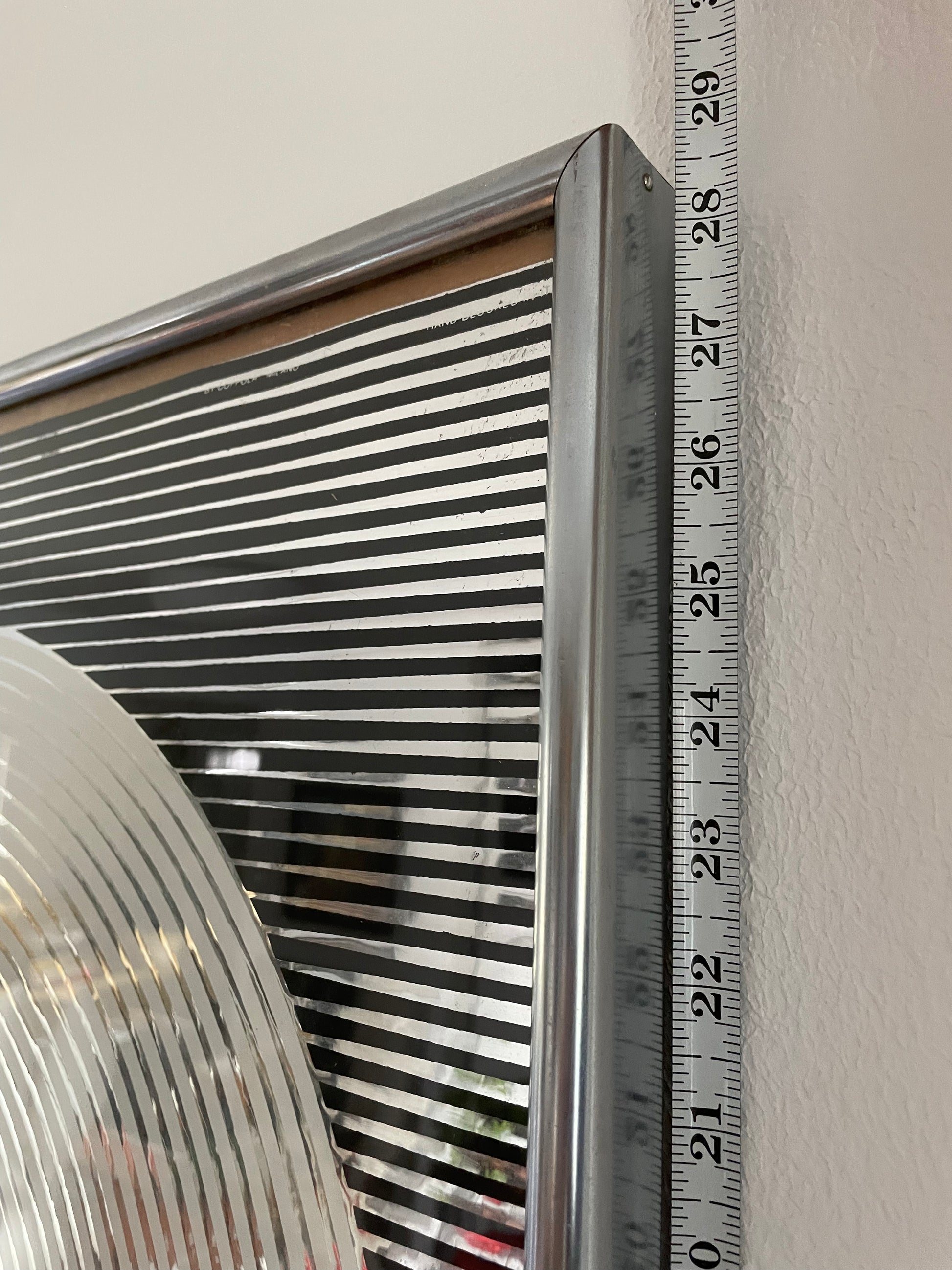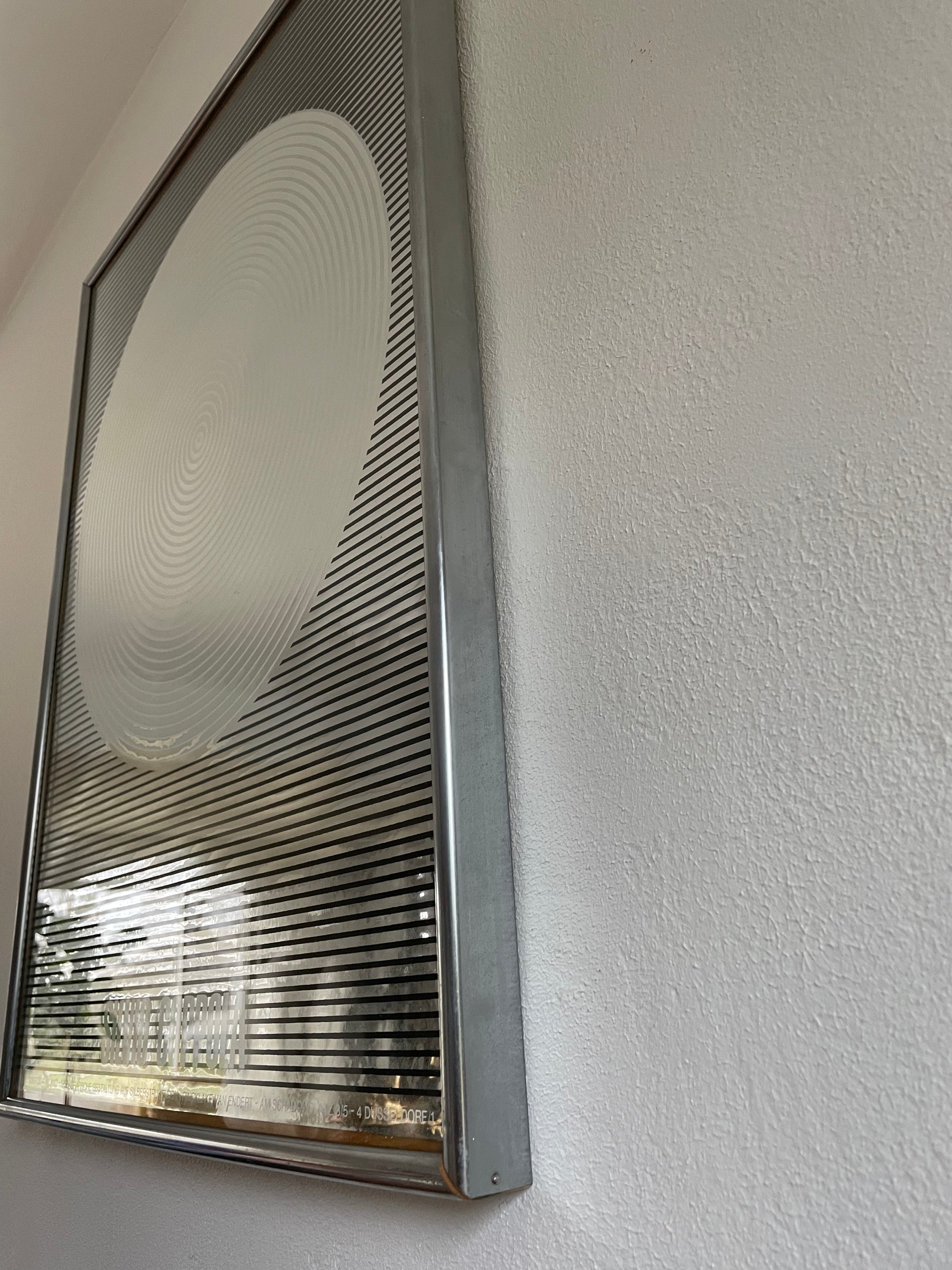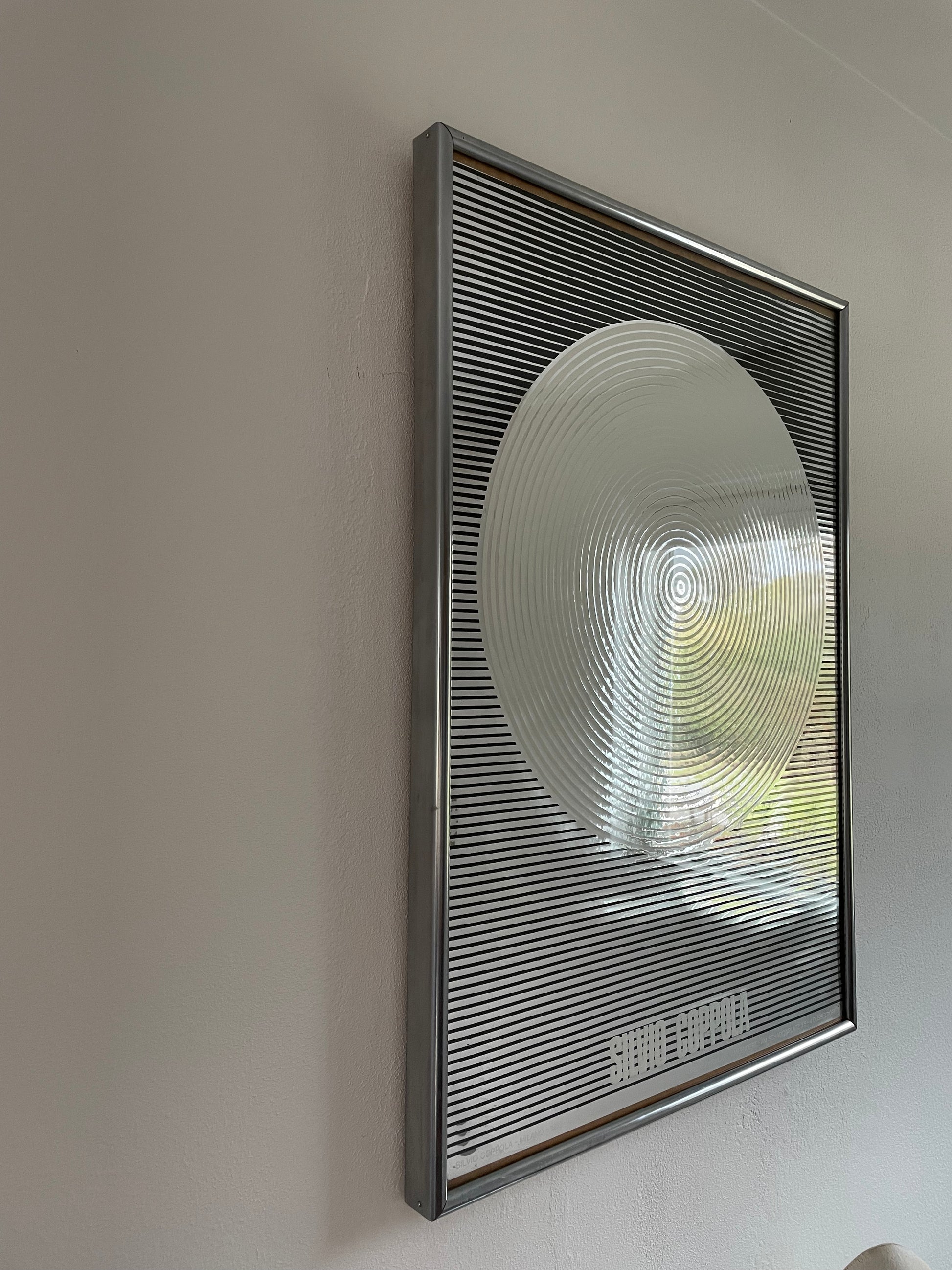 An original vintage reflective metallic framed graphic op art poster by Silvio Coppola, Milano, Italy. Framed in a silver-tone frame.