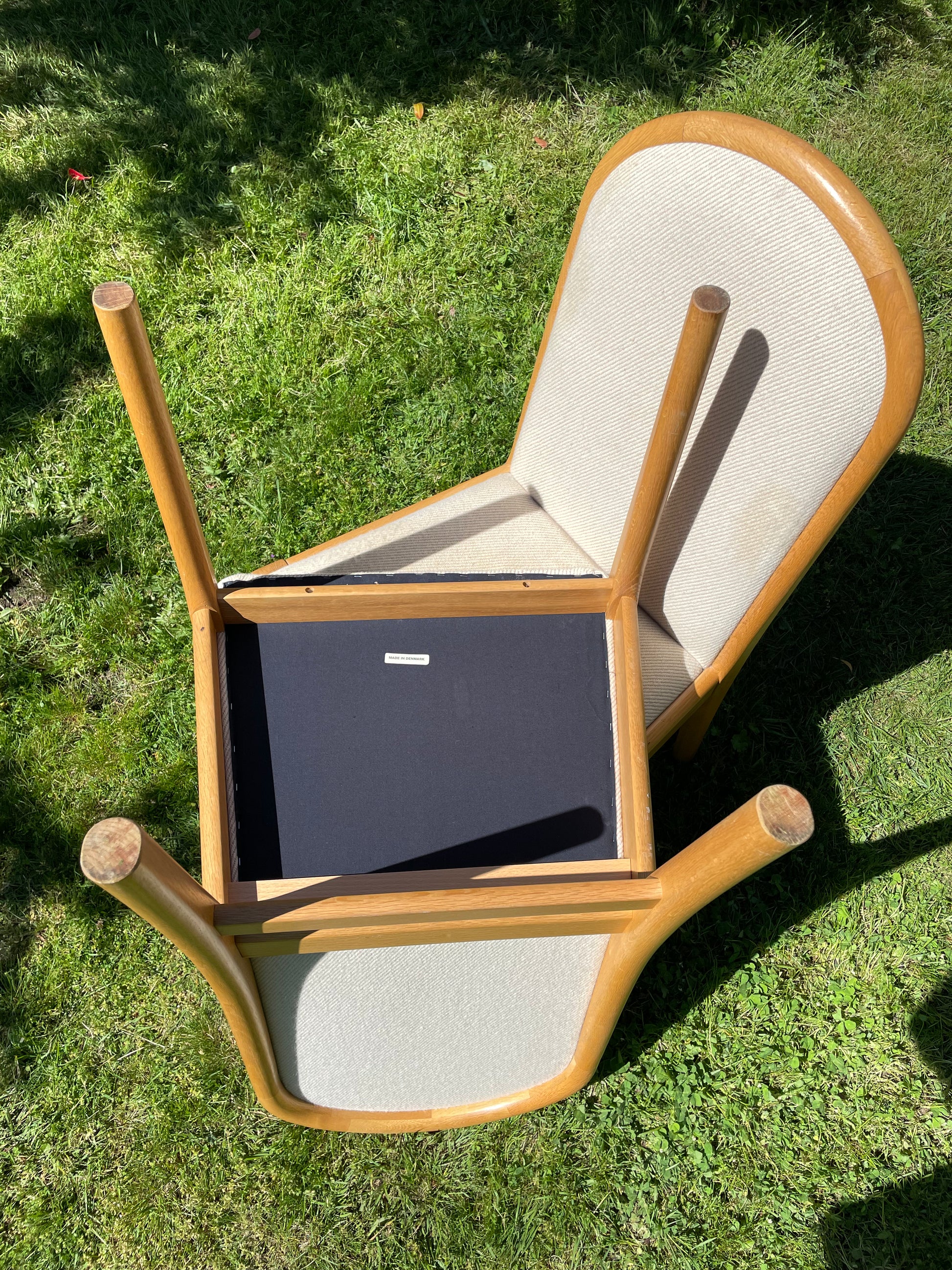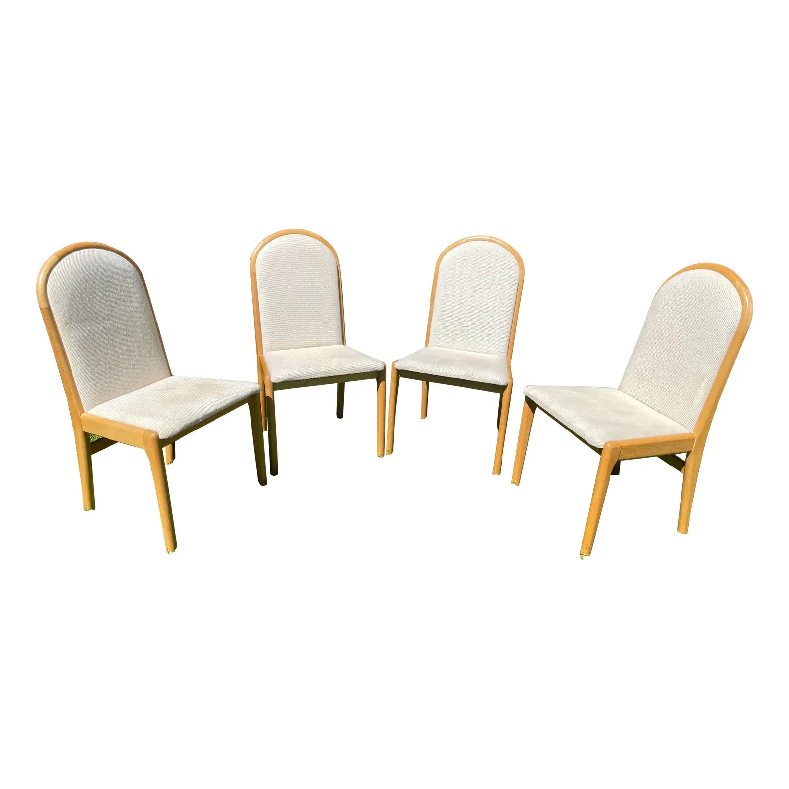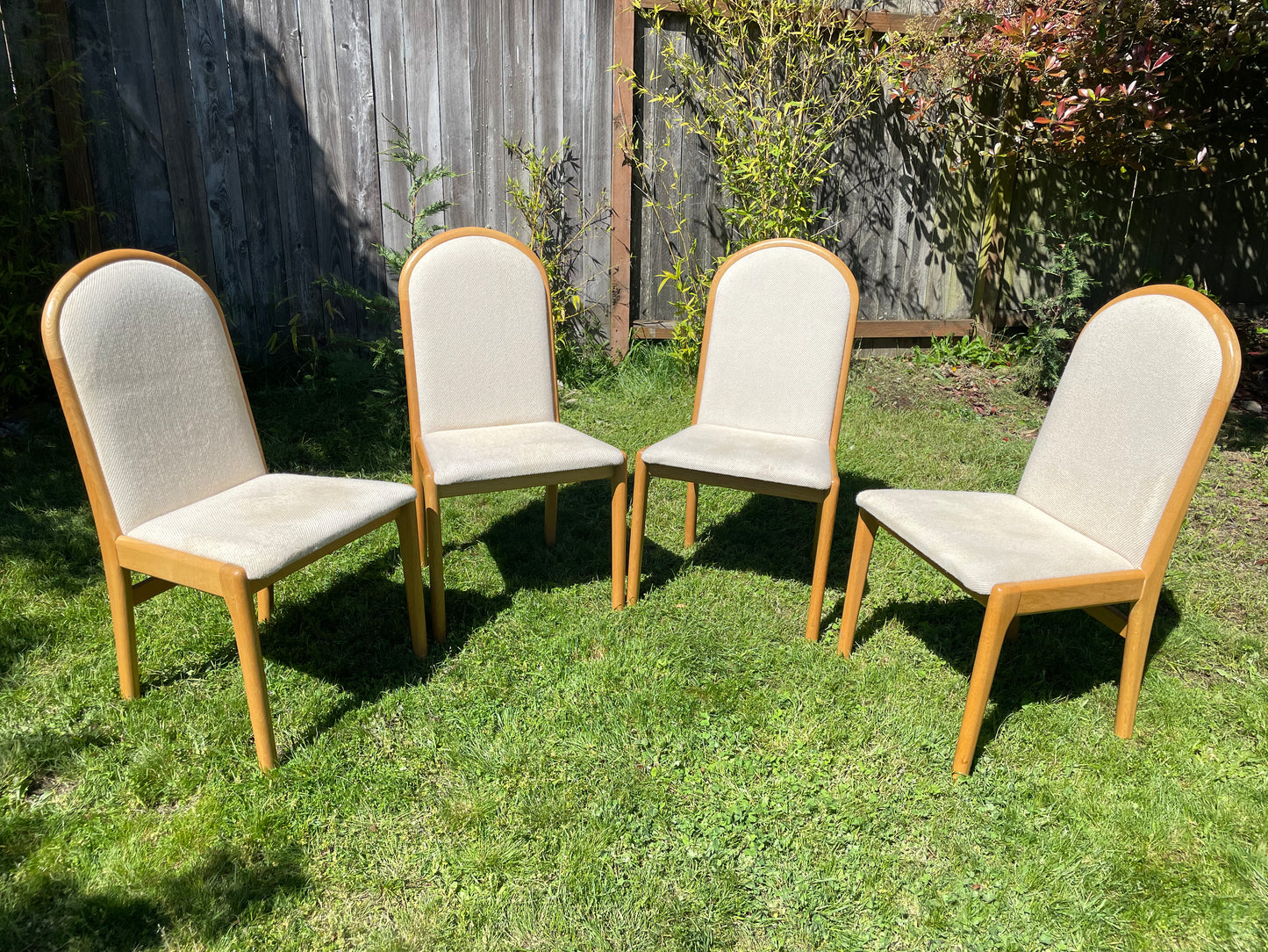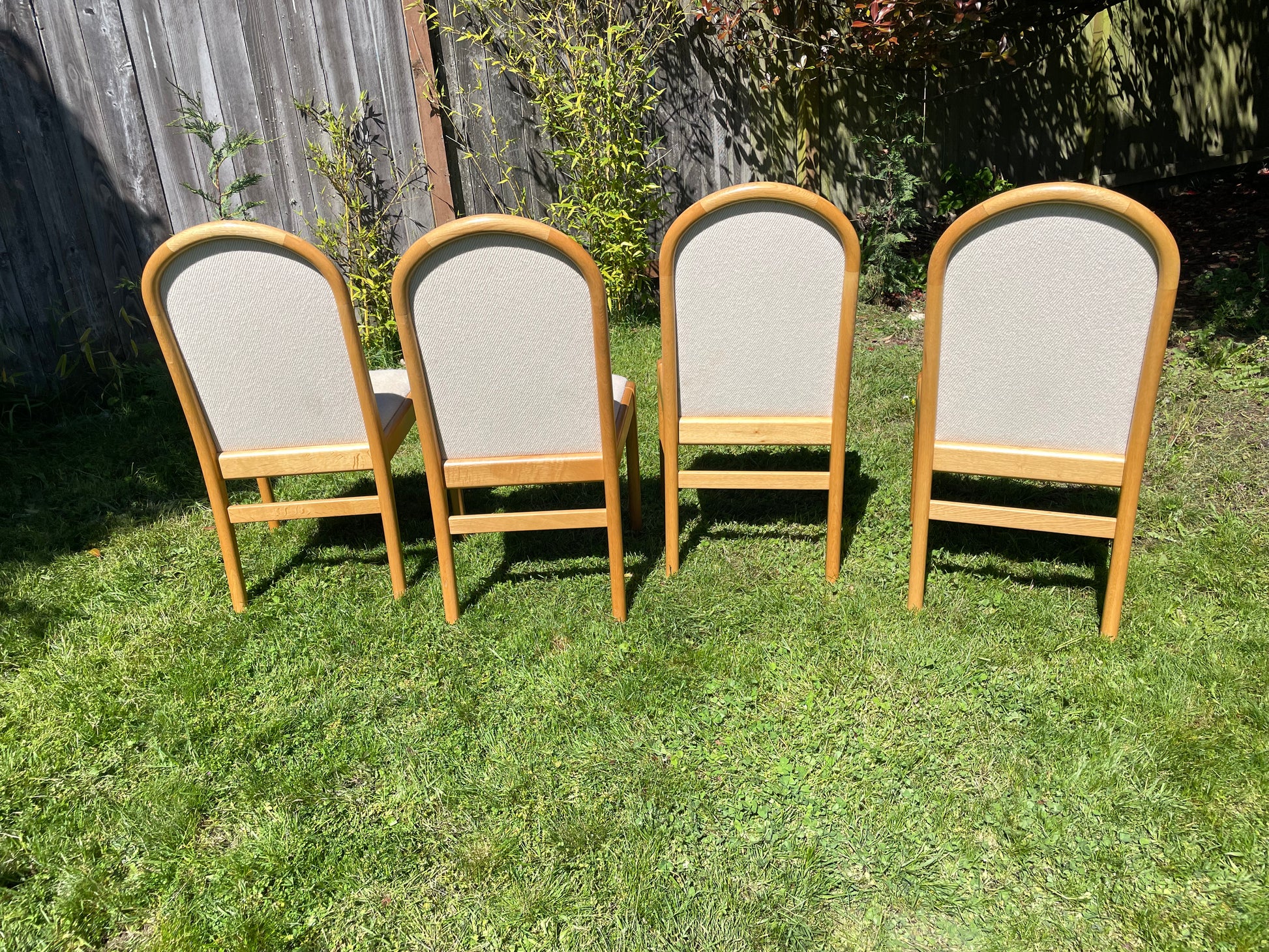 Set of 4 Scandinavian rounded high back upholstered dining chairs. Good condition. Wear consistent with age and use. Beautiful and somewhat rare blonde wood round top dining chairs.