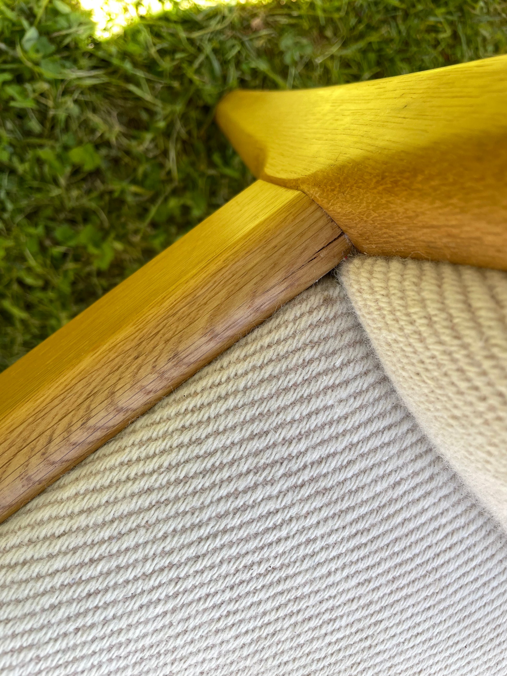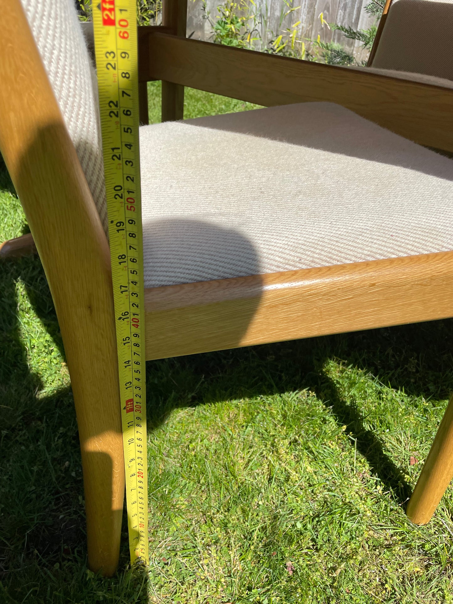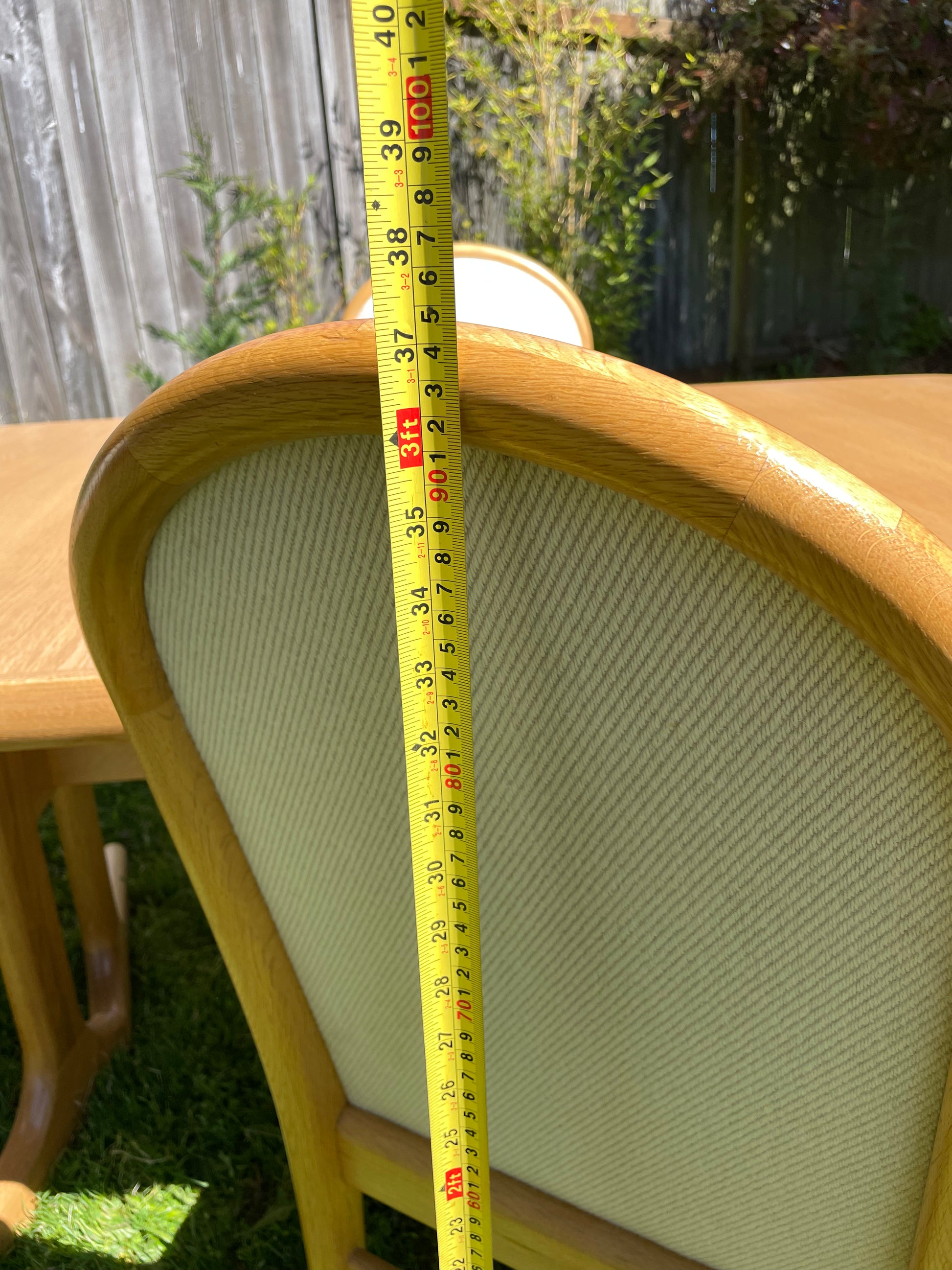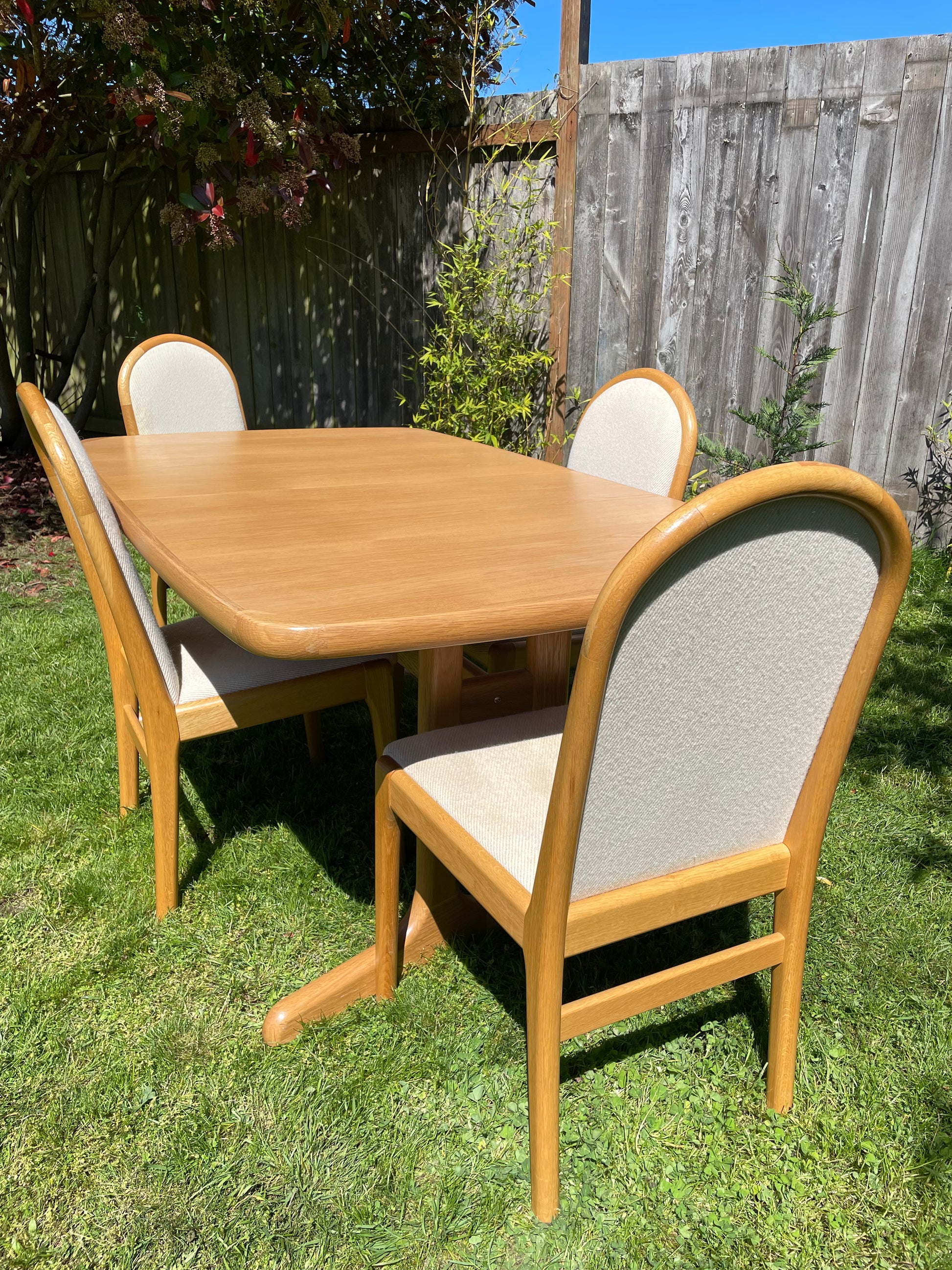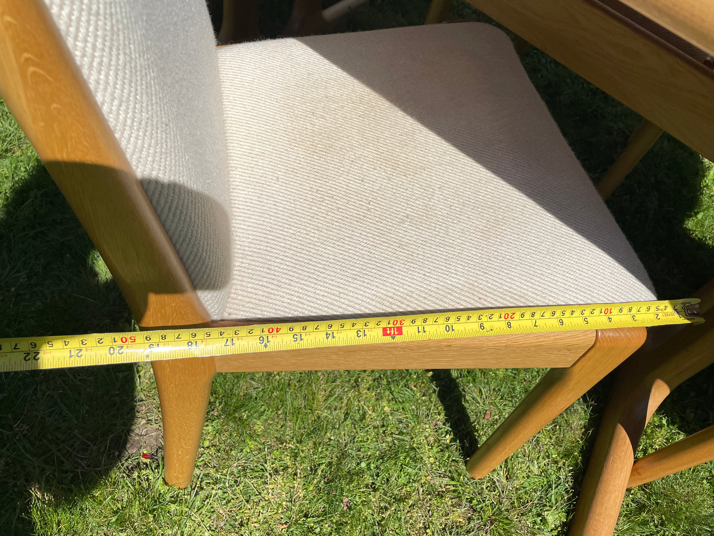 Set of 4 Scandinavian rounded high back upholstered dining chairs. Good condition. Wear consistent with age and use. Beautiful and somewhat rare blonde wood round top dining chairs.