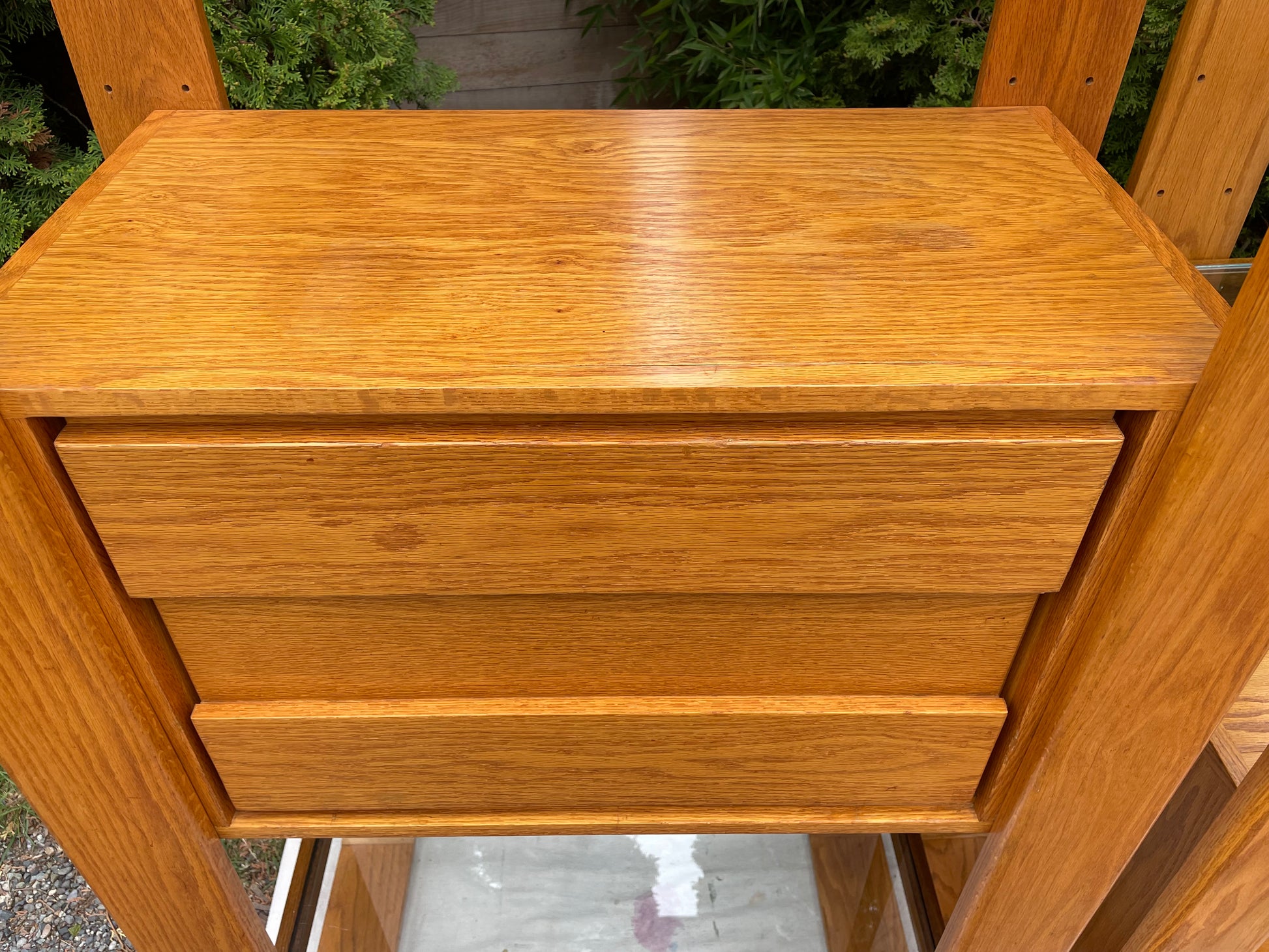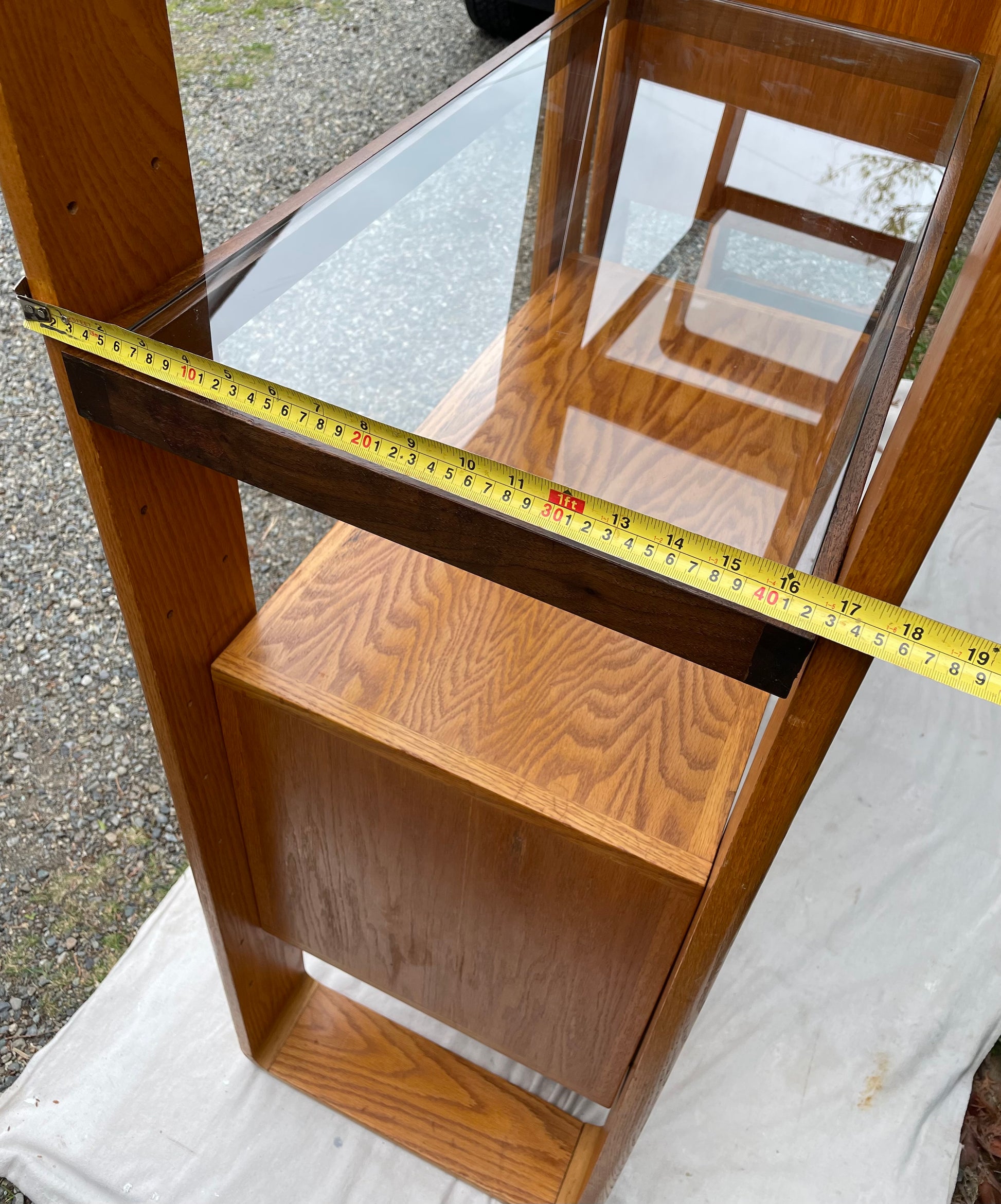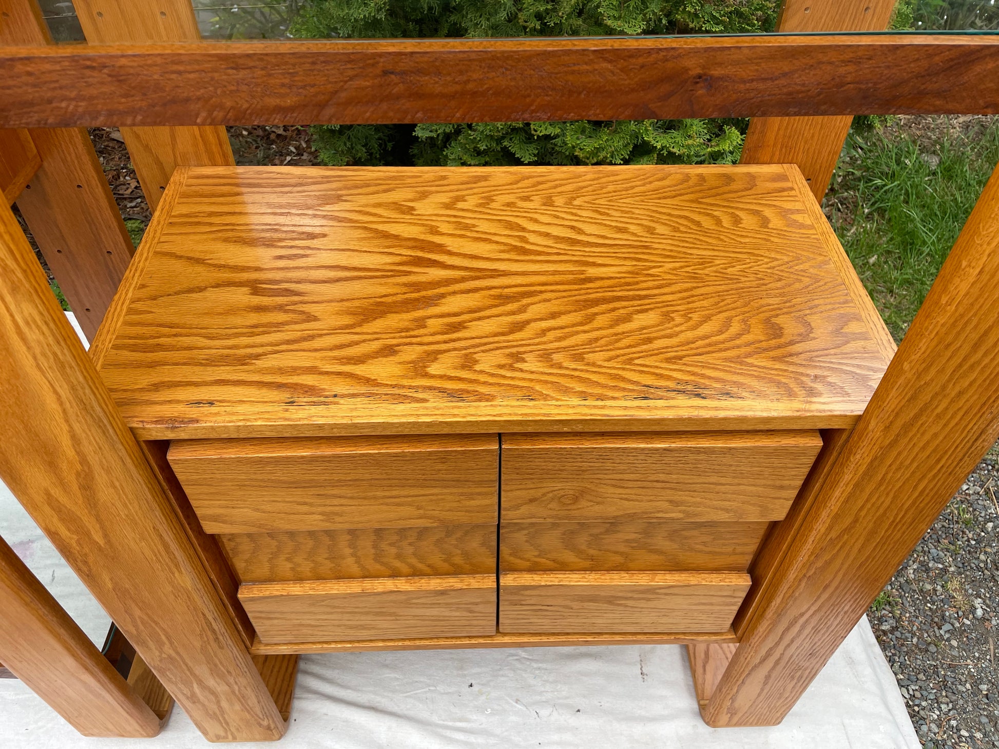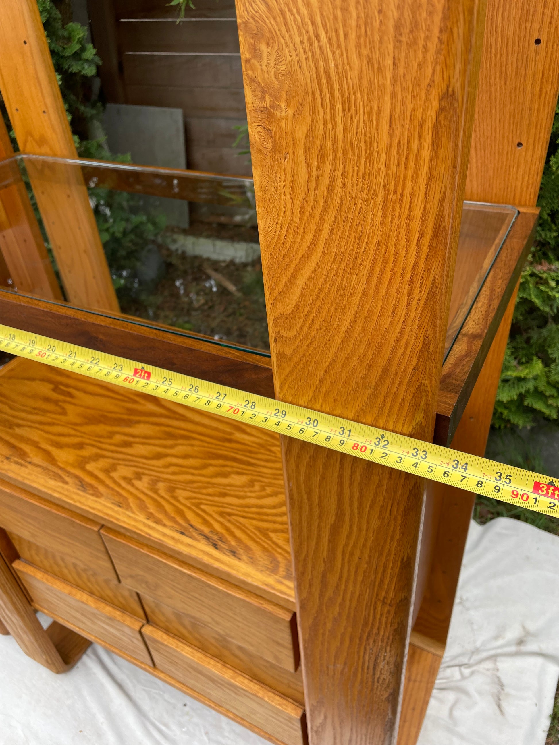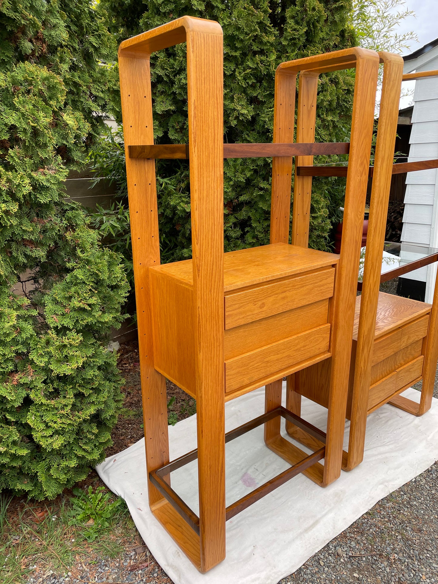 A 1970s oak modular standalone shelving unit, designed by Lou Hodges for California Design Group. The unit’s modular nature makes versatile to use as one or two standalone pieces, or you can add additional shelving in between the two to extend it into a three-part unit. This set is unique because it features walnut shelving with inset glass which nicely contrasts the oak.