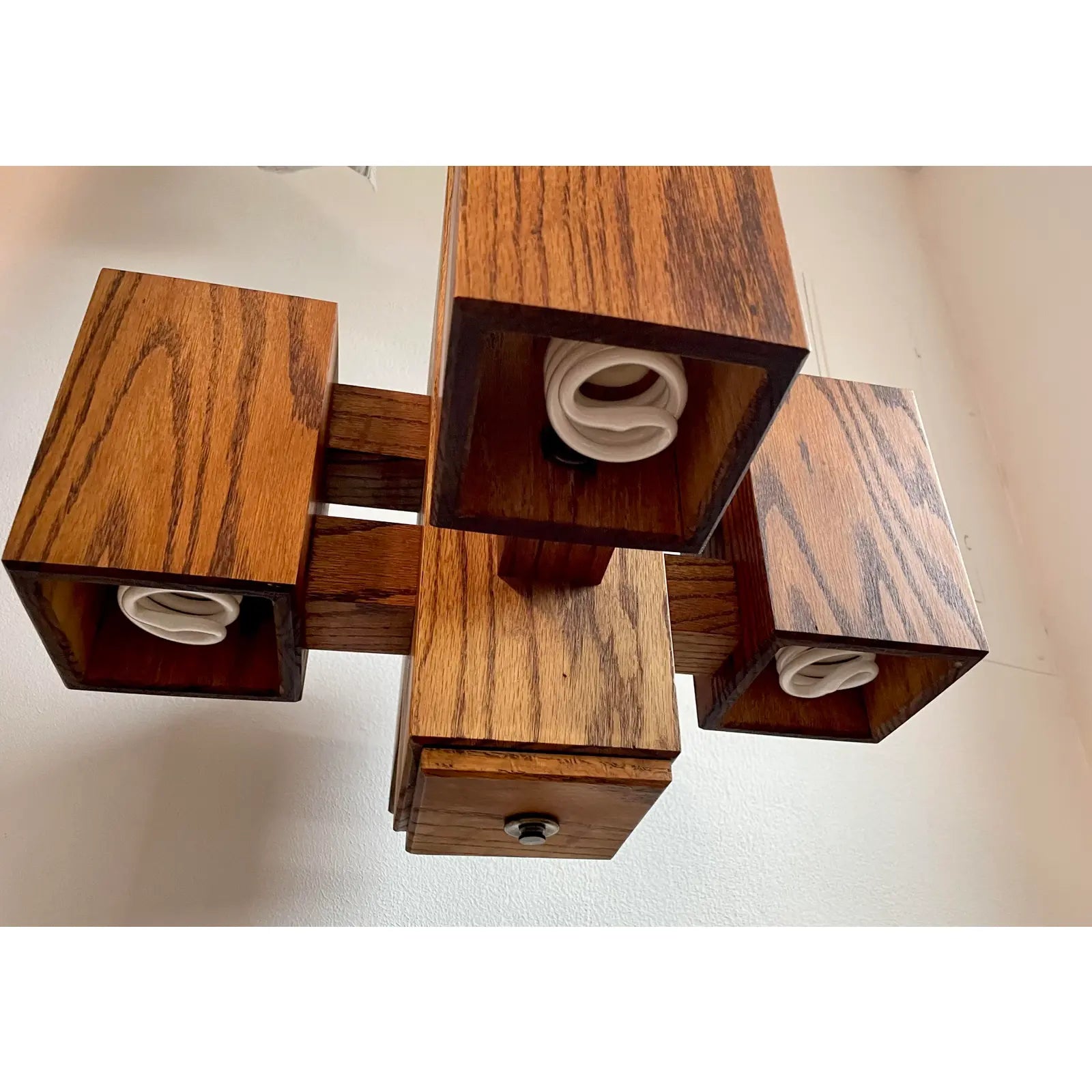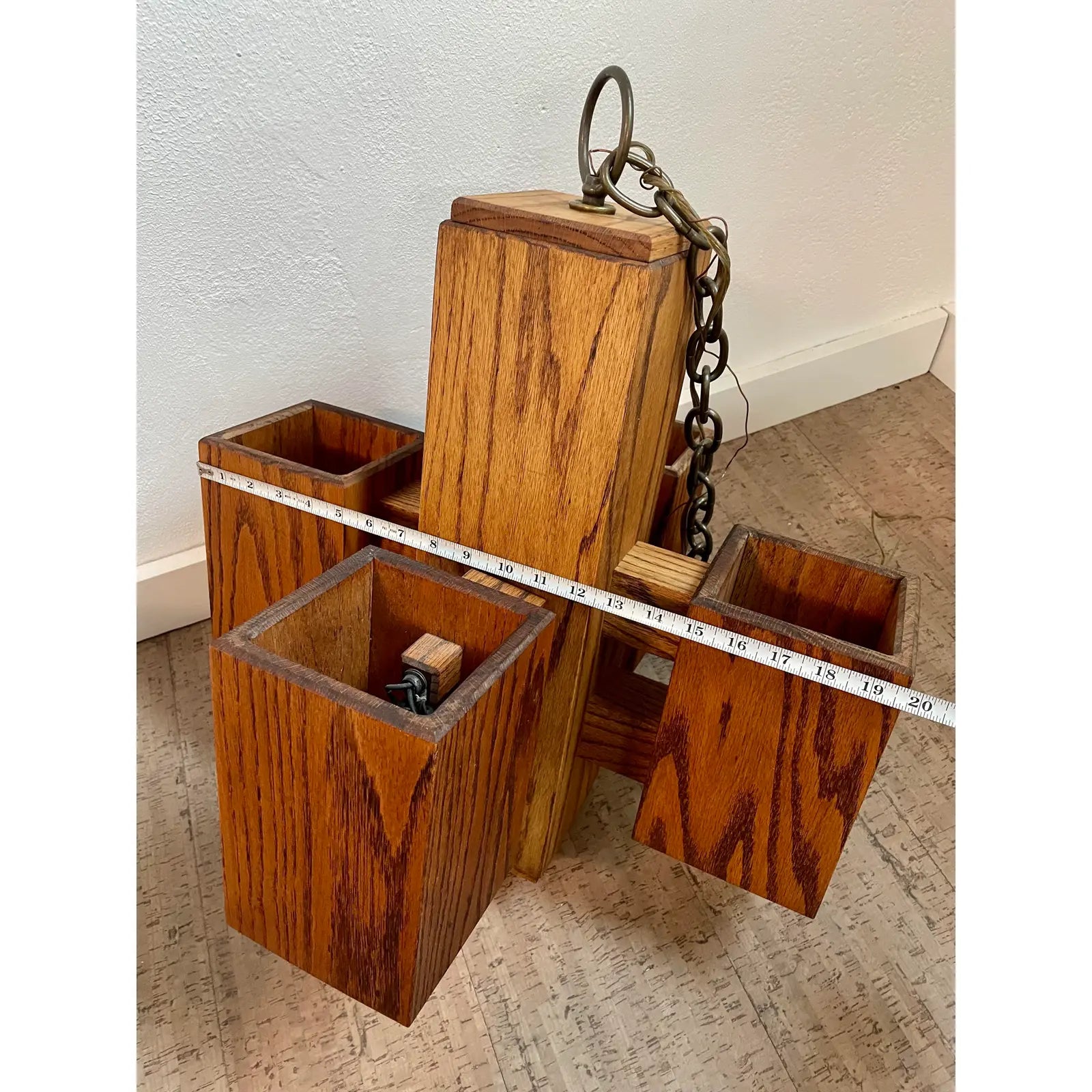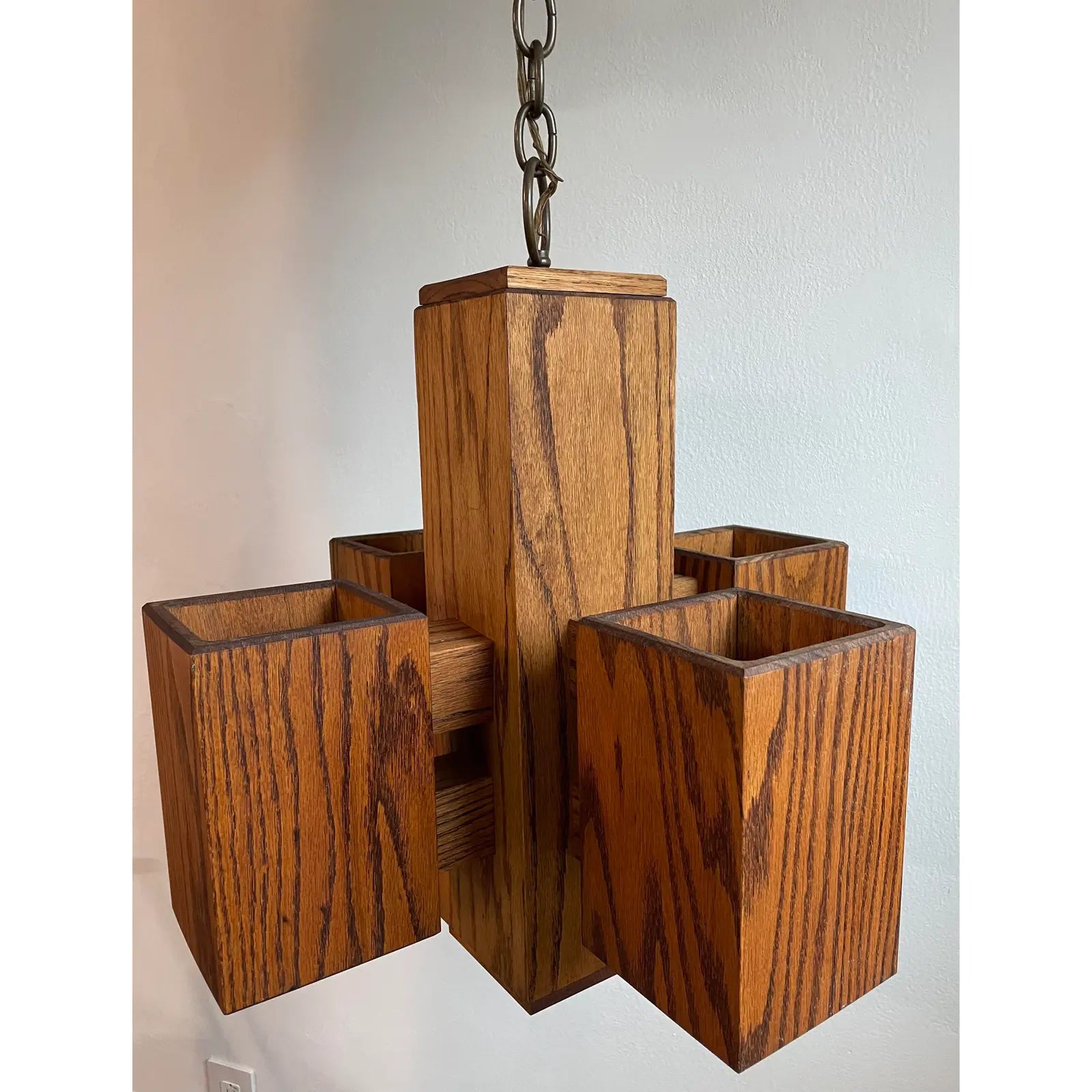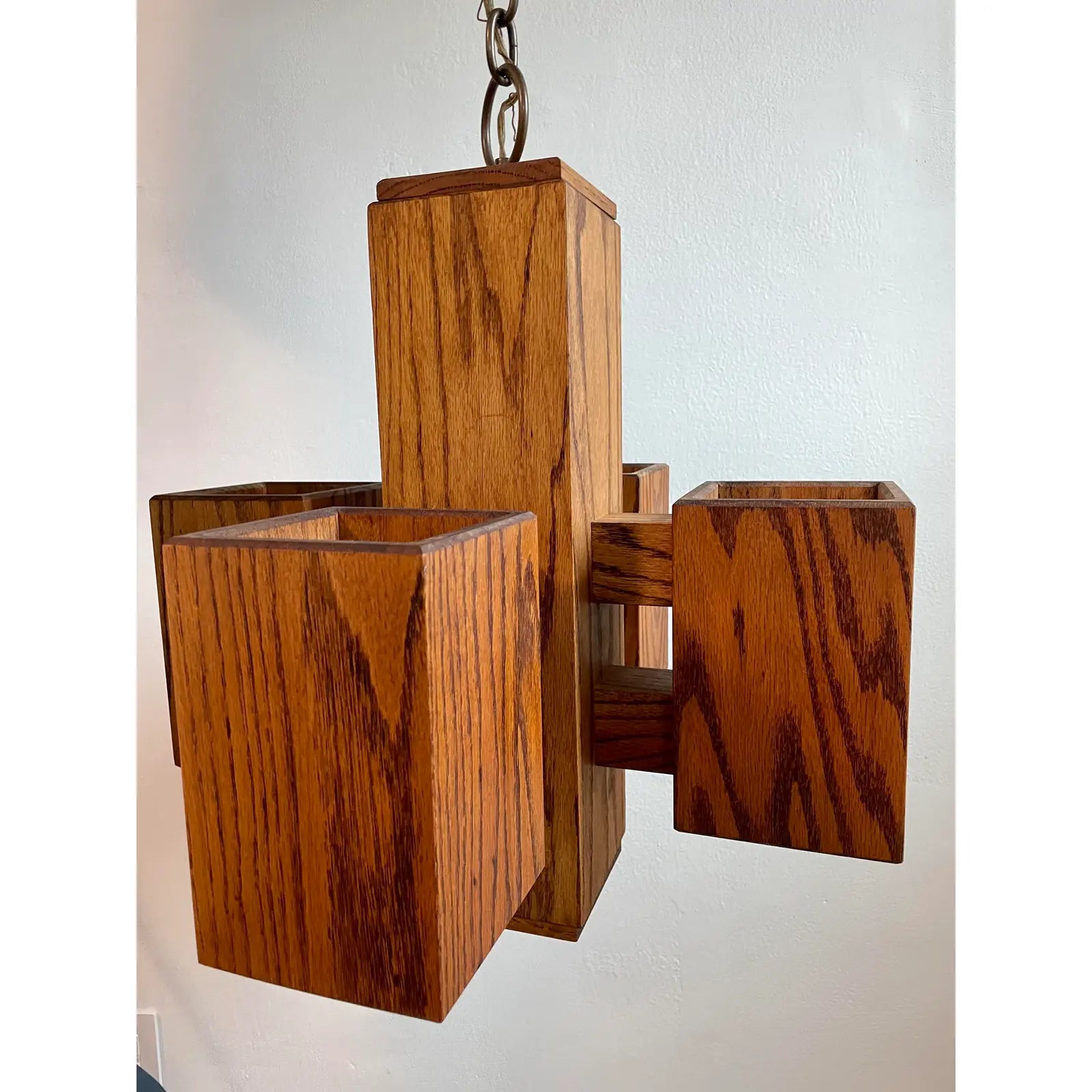 A vintage modernist style swag chandelier light fixture featuring architectural geometric box-form construction. The lamp features four lights and rich oak grain with a soft matte finish. The design resembles those in the style of Robert Sonneman and Frederick Raymond.