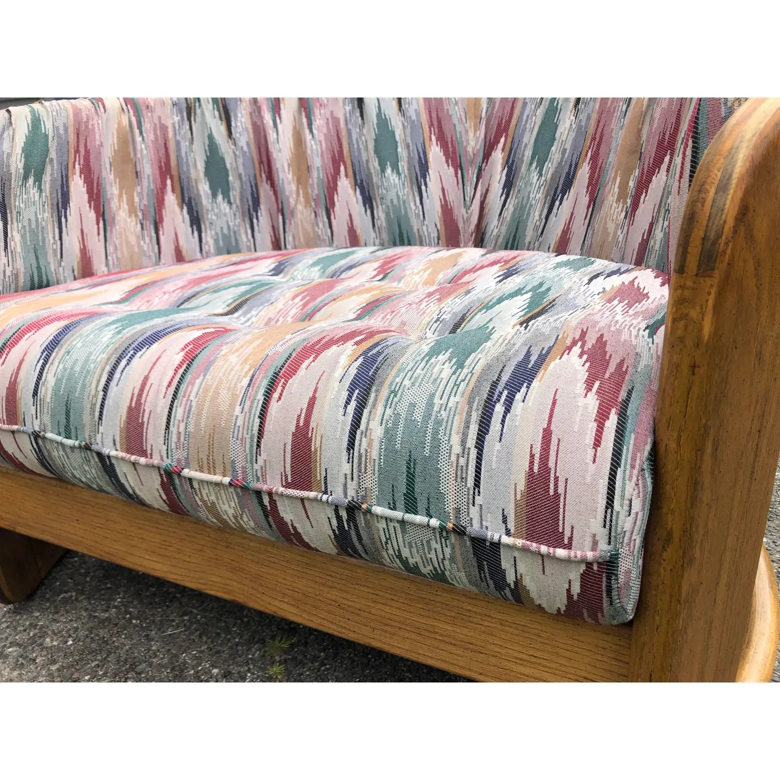Modern oak spindle Howard large lounge chairs with original fabric and cushions. Seats can fit up to two people at once. Relaxed chevron zig zag pattern are ready to make any space light and cozy.