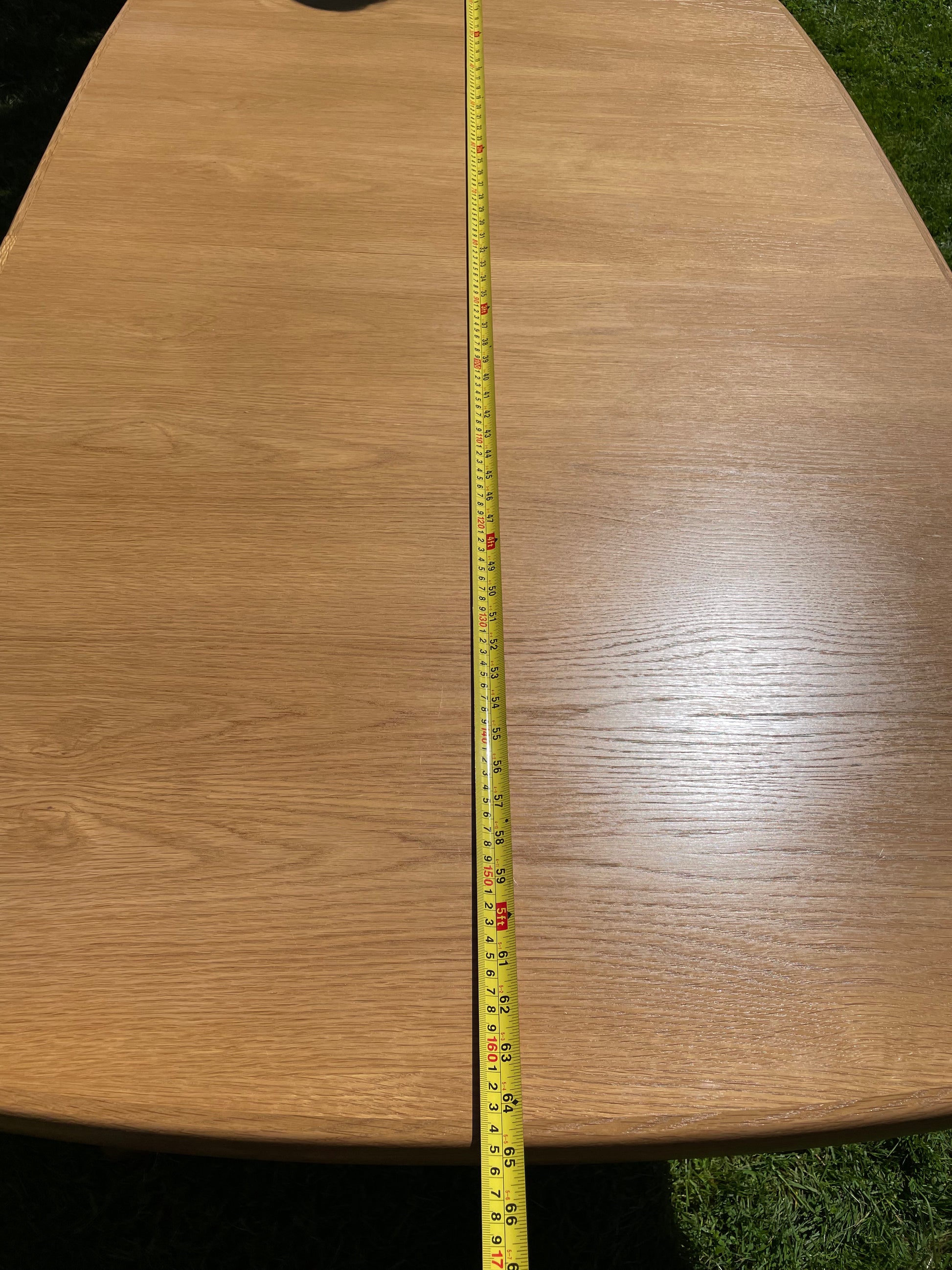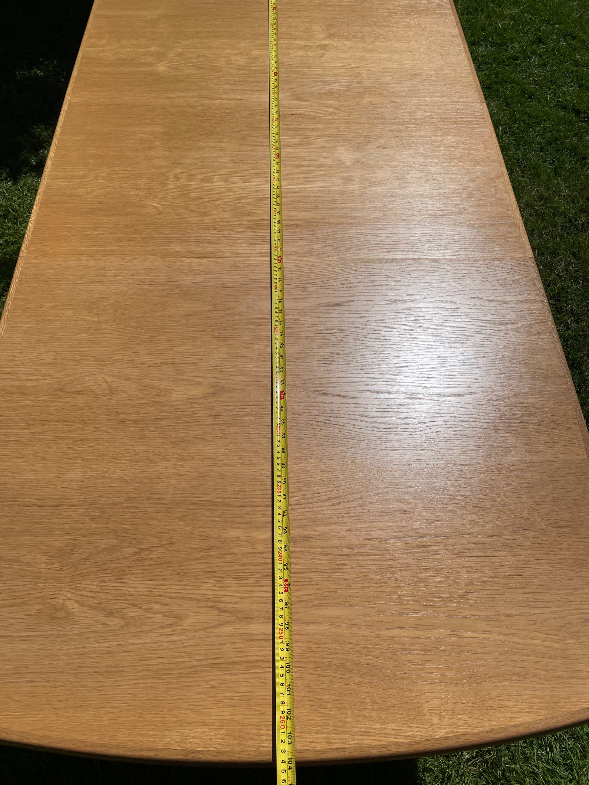 A stylish and functional light blonde wood Danish Modern dining table, extendable with 2 leaves.