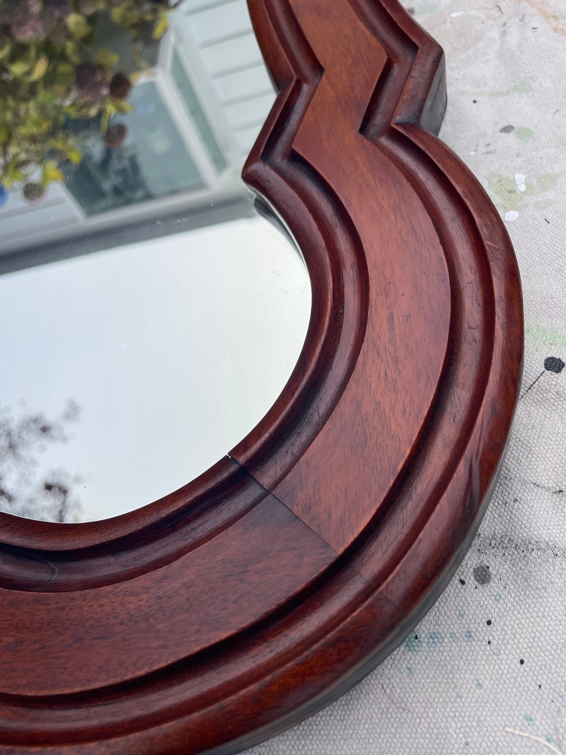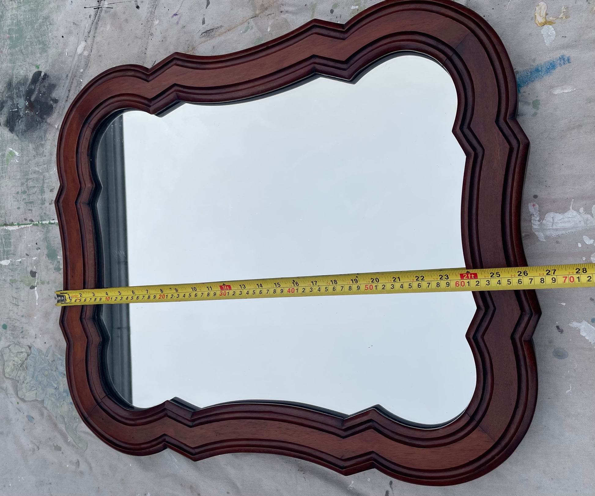 Timeless rounded mahogany wood mirror adds charm and warmth to any interior. This antique wall mirror featuring graceful scalloped edges and finely carved traditional motifs is crafted with warm, rich mahogany veneers over solid wood, this piece offers depth, character, and classic elegance. Its refined silhouette makes it perfect for an entryway, living room, dining room, or bedroom—an inviting statement piece that enhances both light and architectural warmth. A beautiful choice for collectors of traditional, historic, or Southern-style décor.