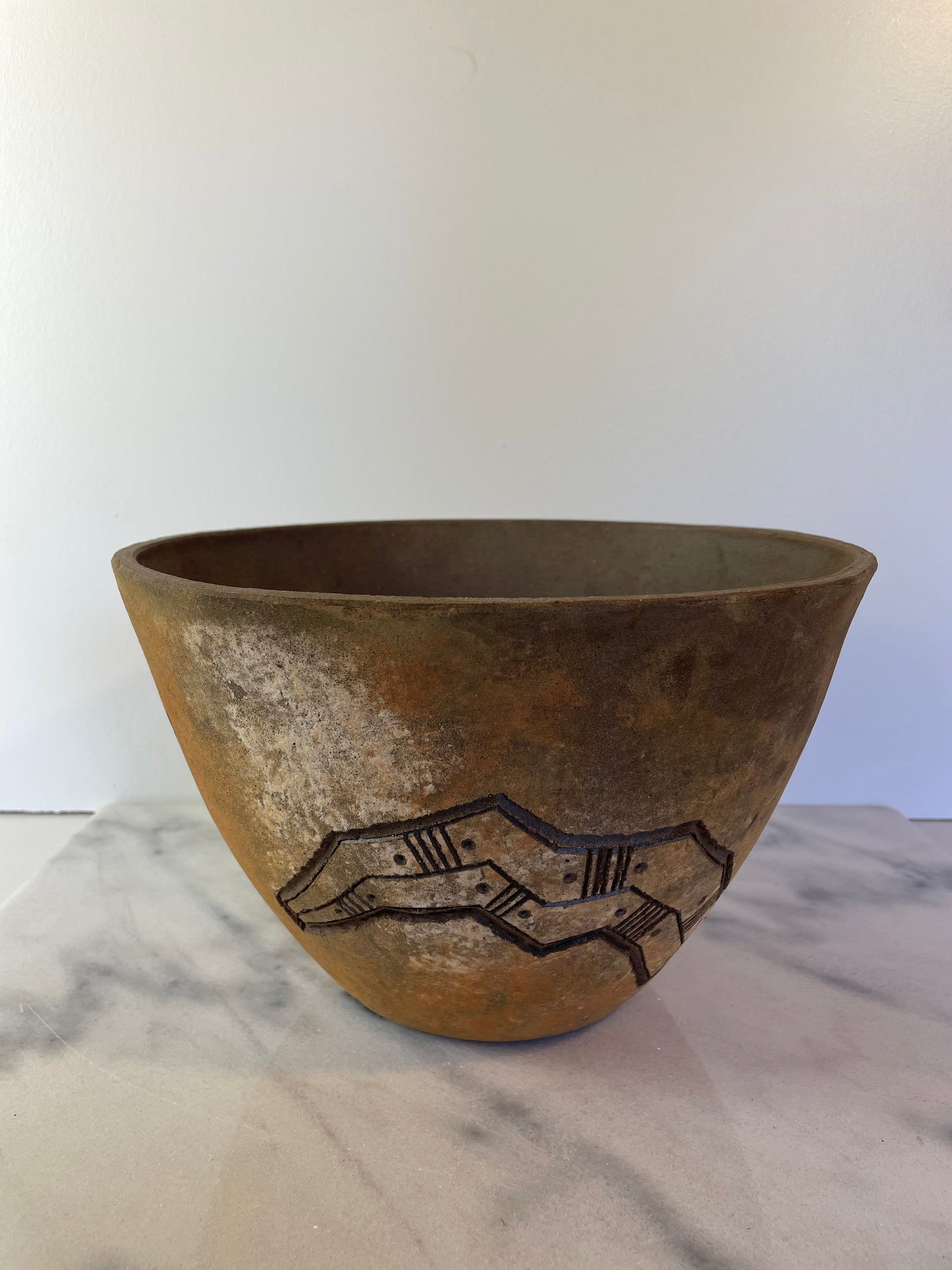 A vintage Cosanti Originals purchased by the seller from Arcosanti in 2017. This pot bears a unique design handcrafted by a skilled artisan with the techniques of Paolo Soleri. Good condition with minor signs of age.