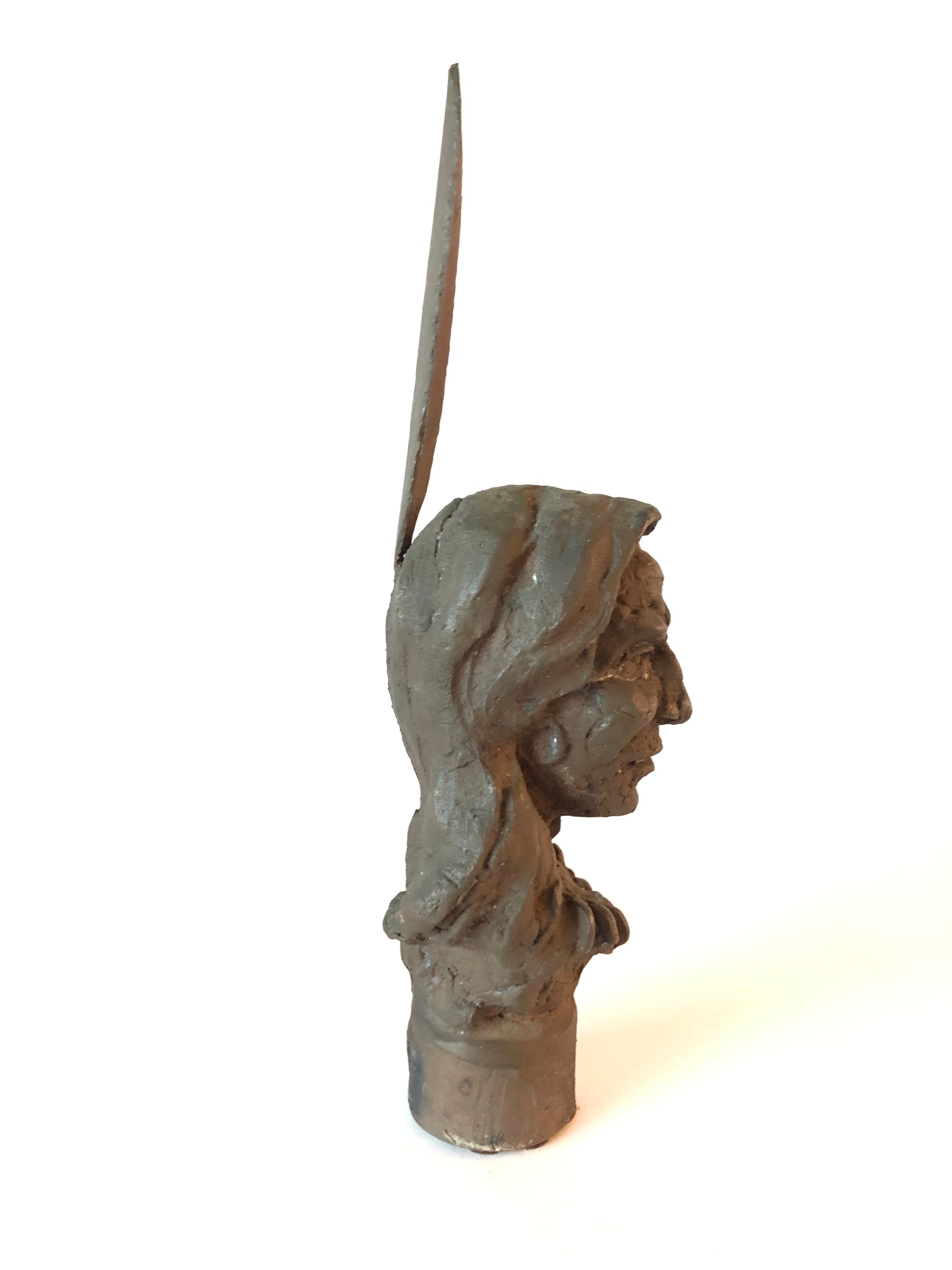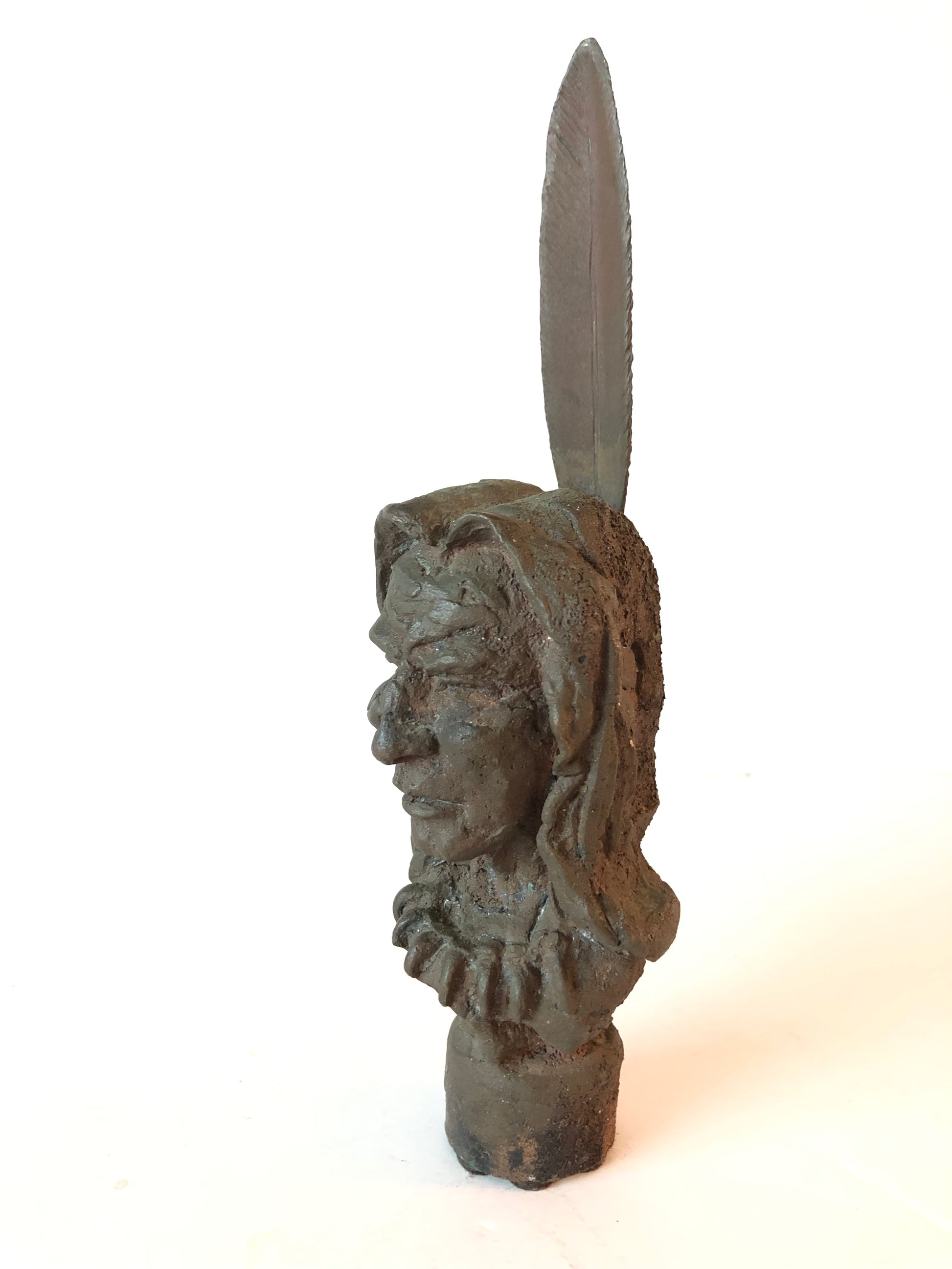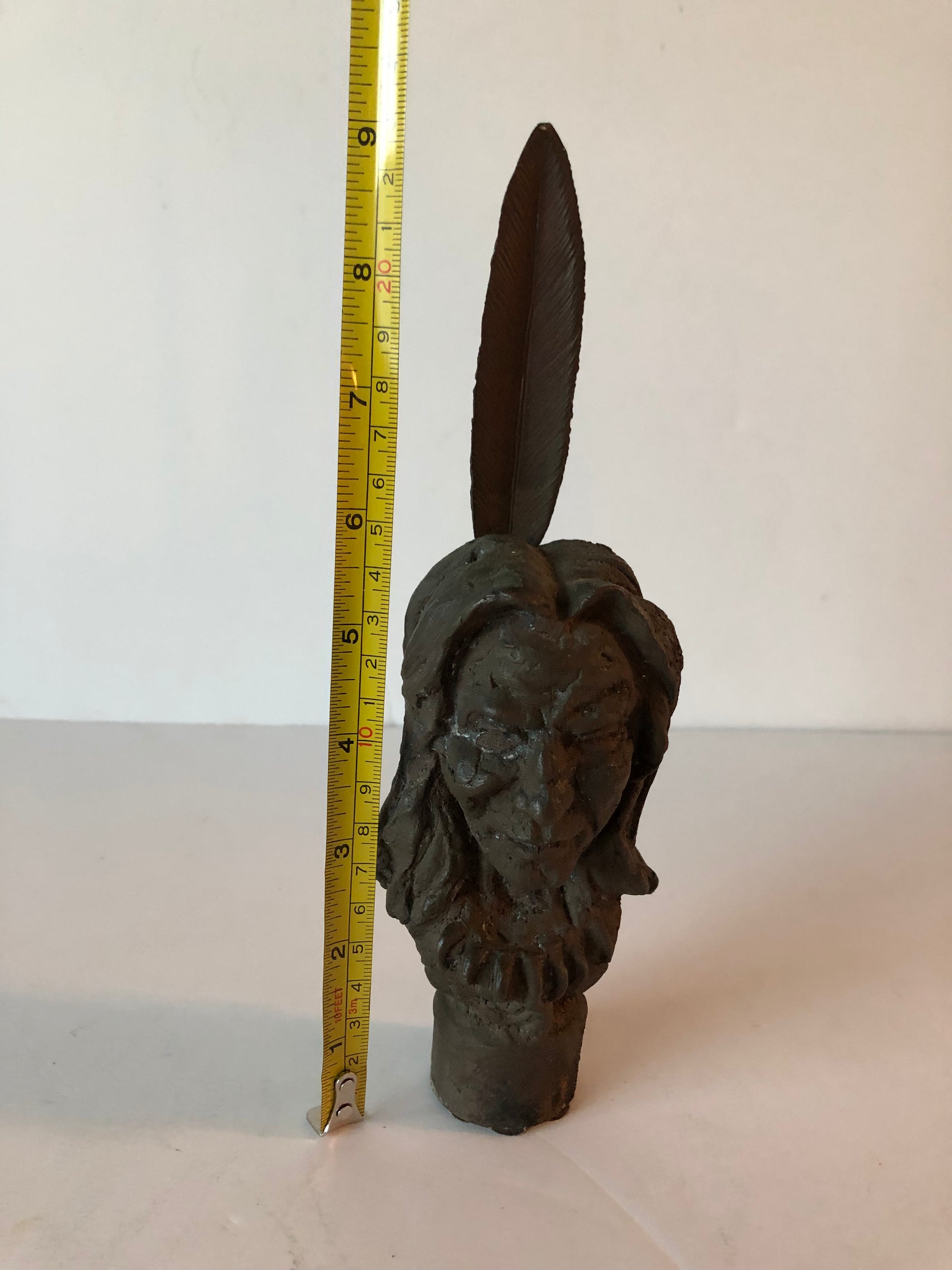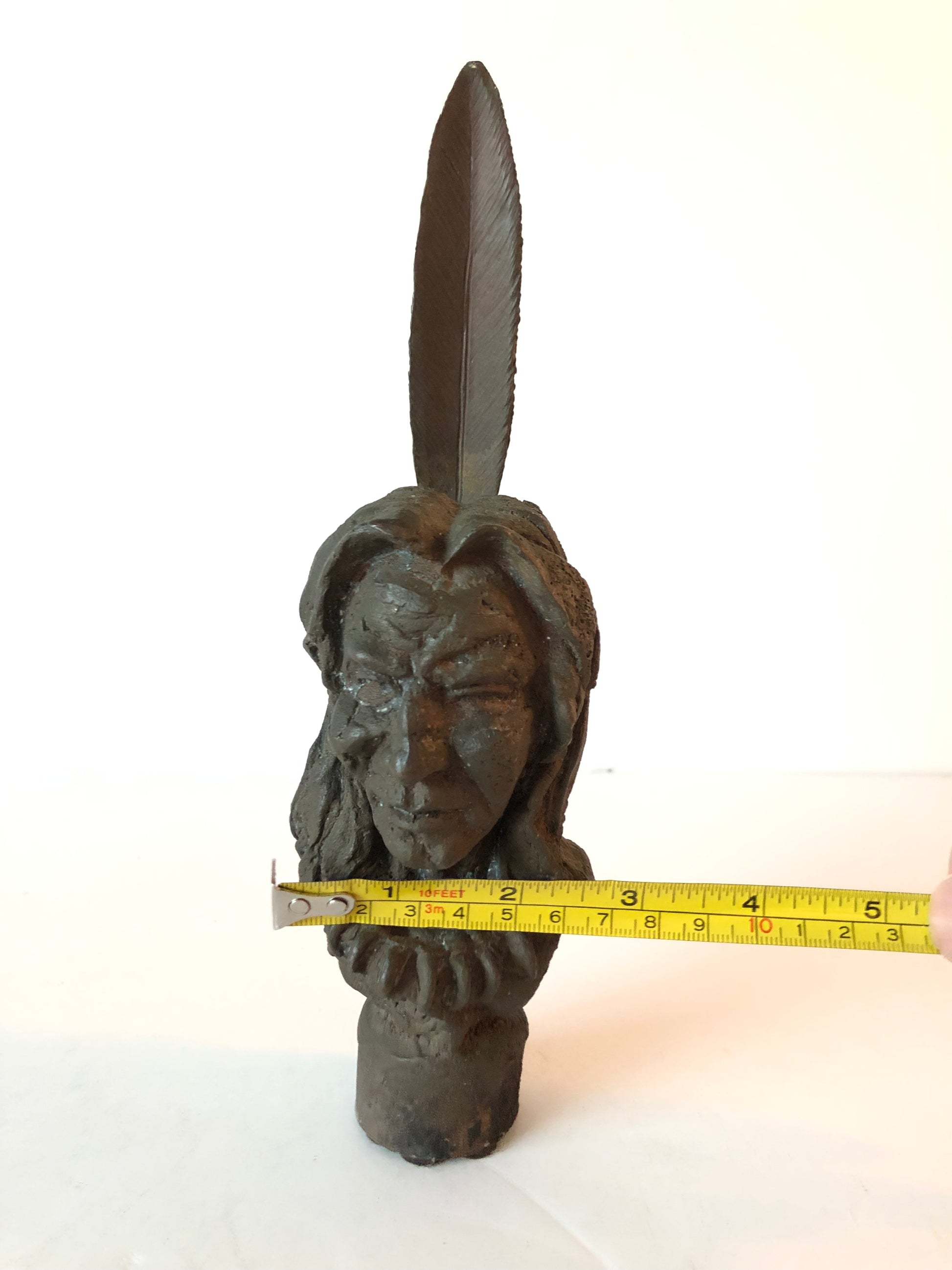 A heavy handmade bronze bust sculpture of a Native American Man with feather.