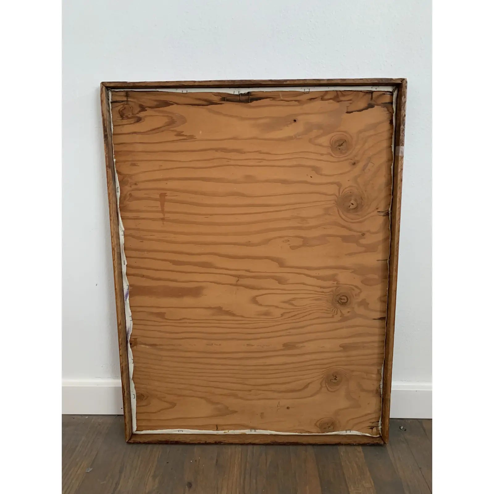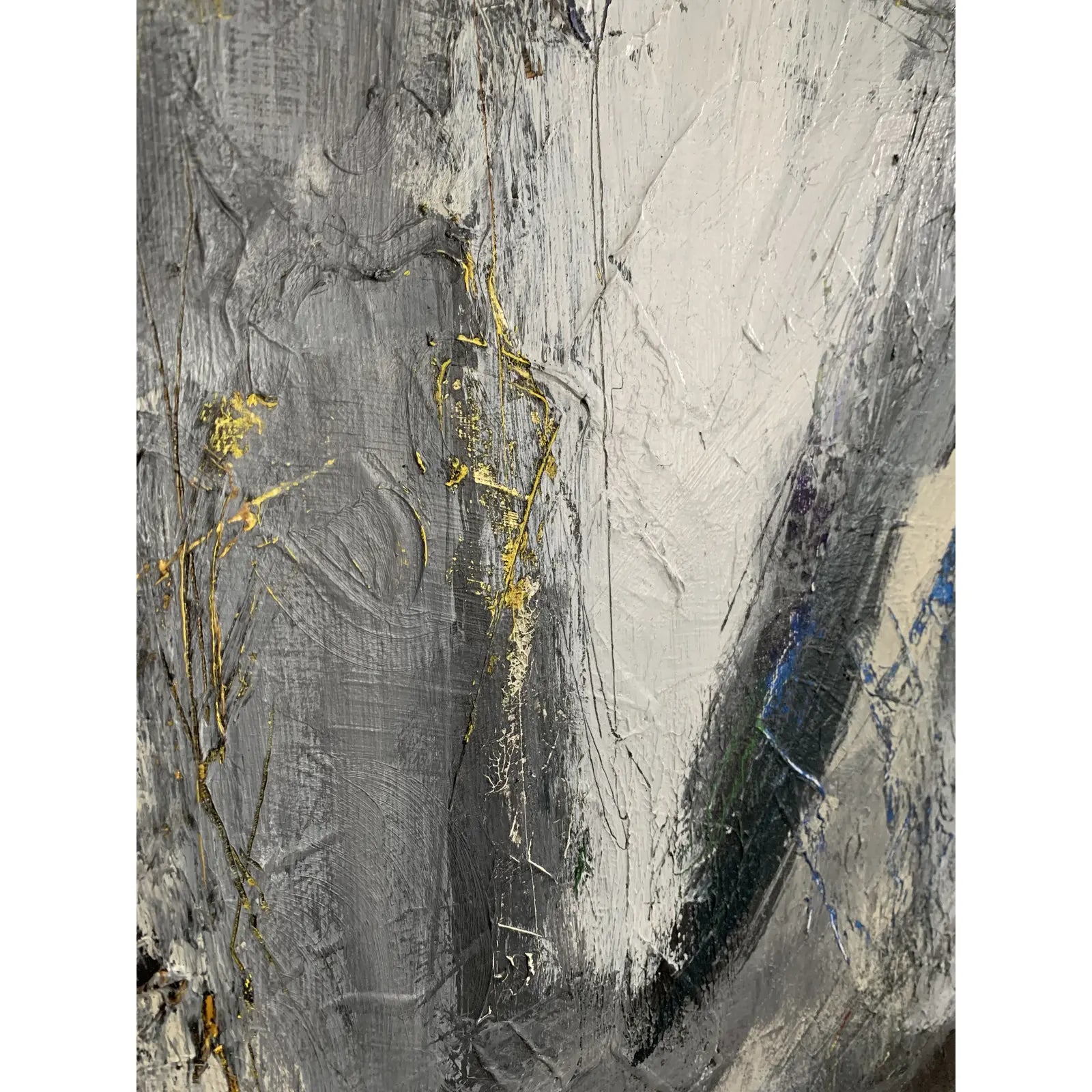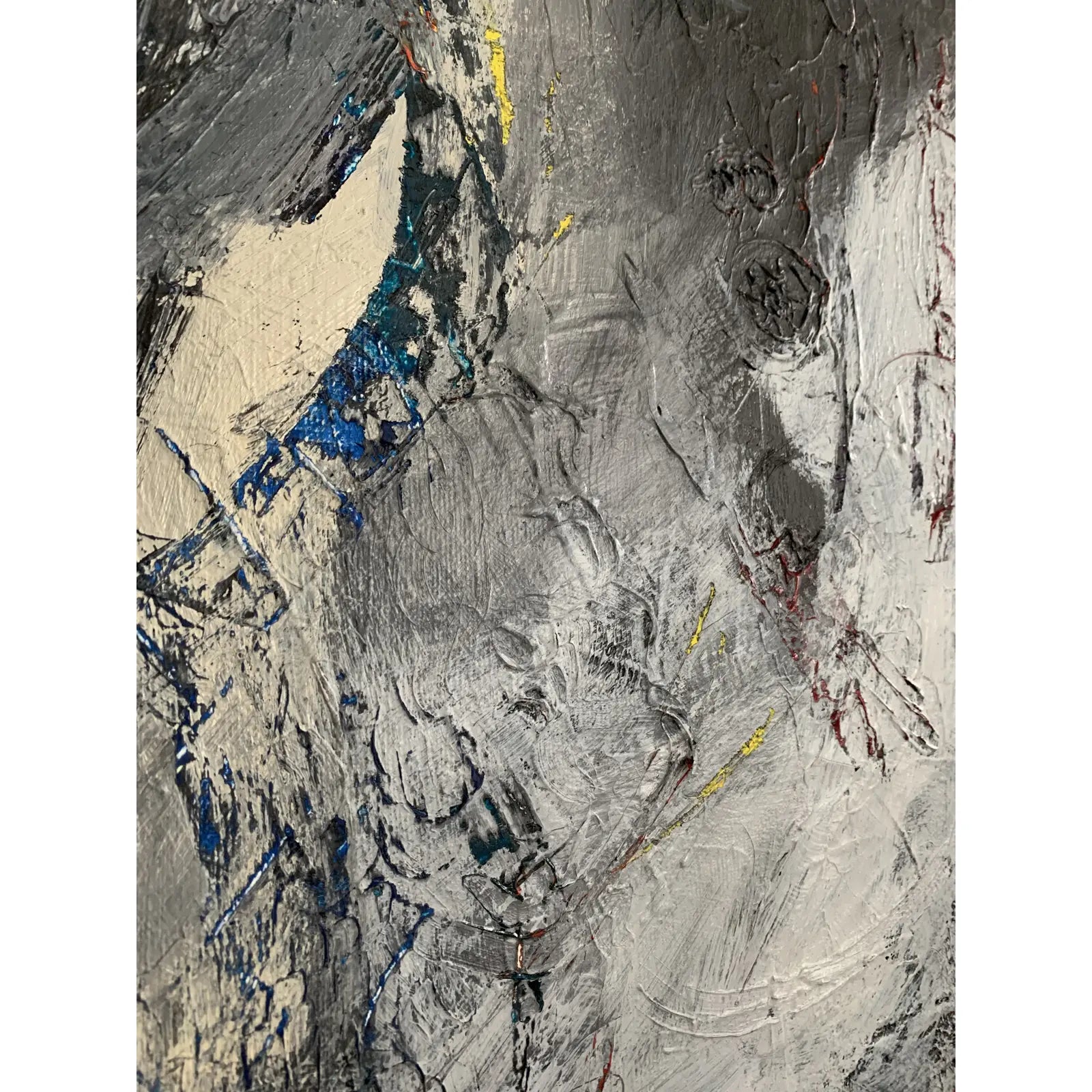 Abstract painting, painted over a vintage painting. The original colors show through layers of black, white, and gray. The painting was done on a plywood panel, and it is framed in the original simple wood frame.