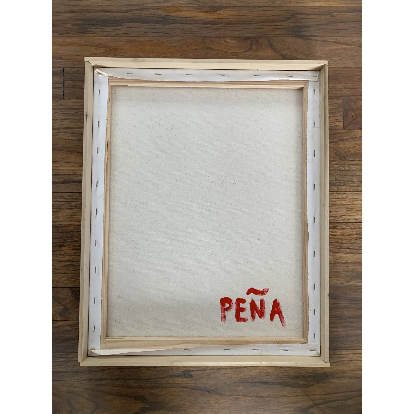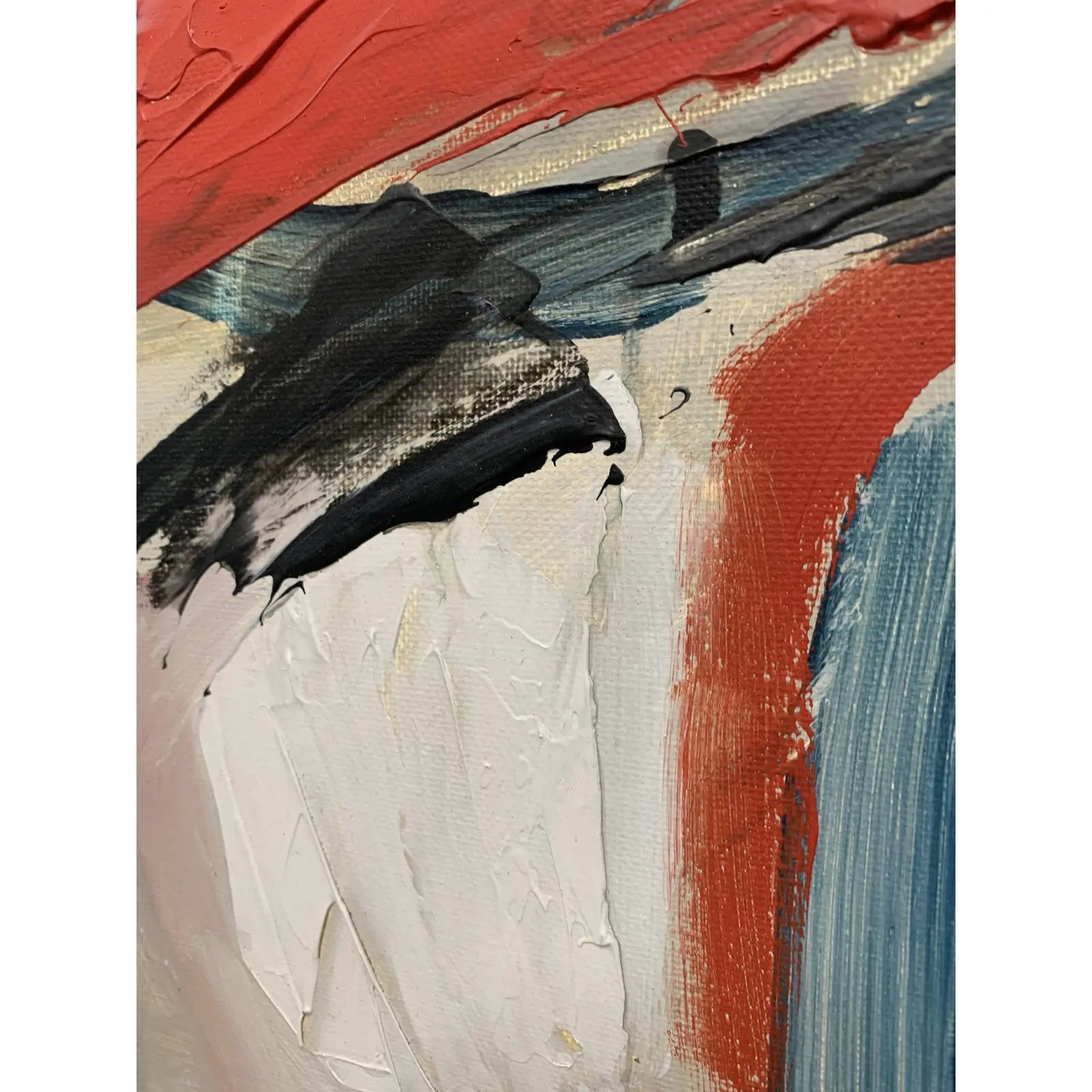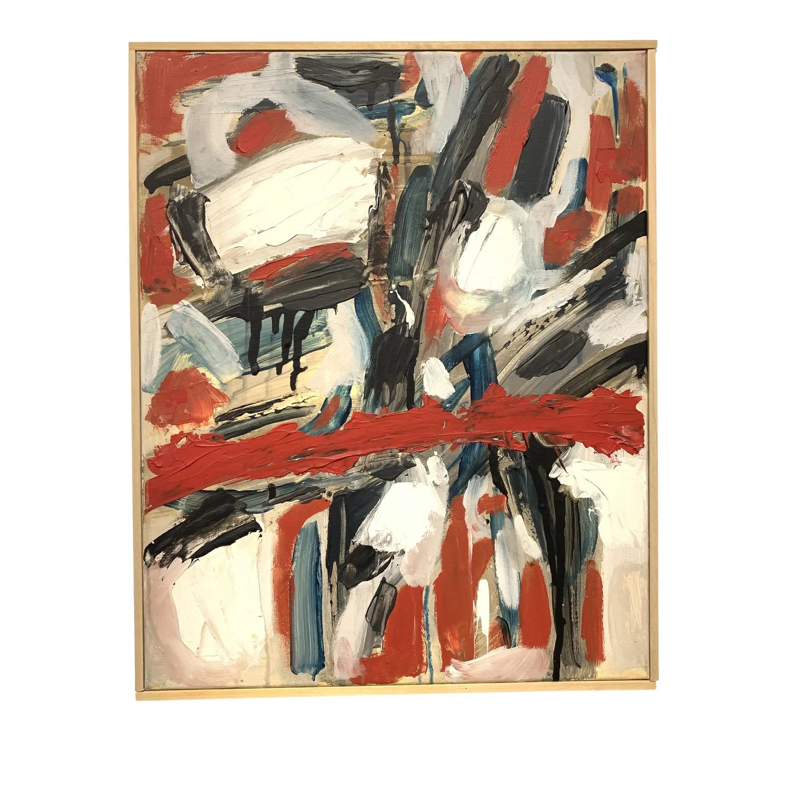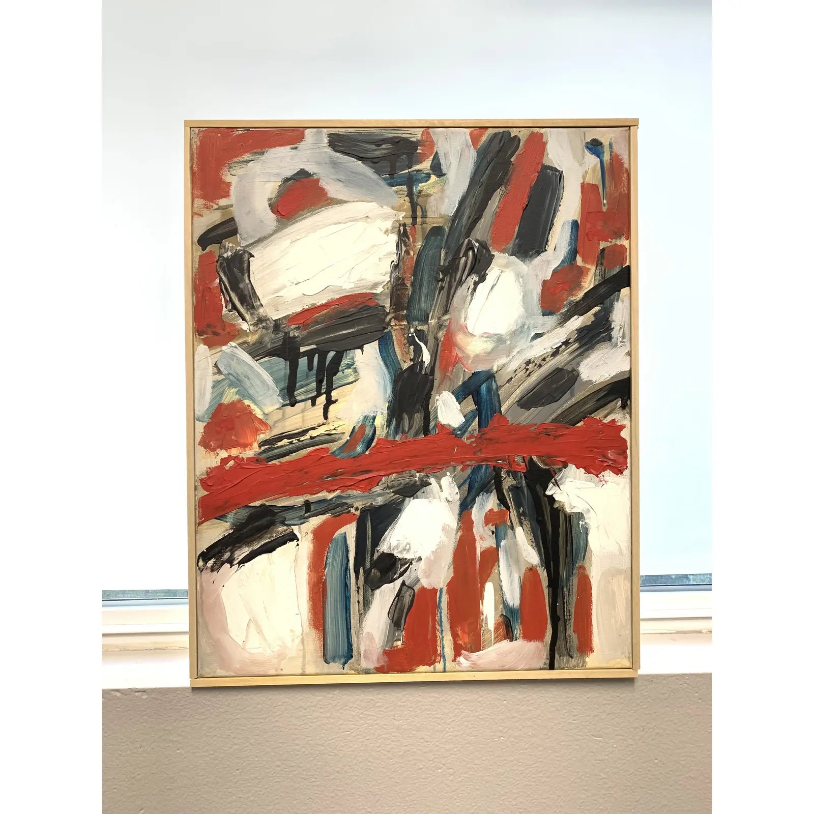 Abstract expressionist acrylic on canvas in red-orange and blue. The painting was framed in a simple wood frame by the artist. Painted in Oakland, CA, 2018.