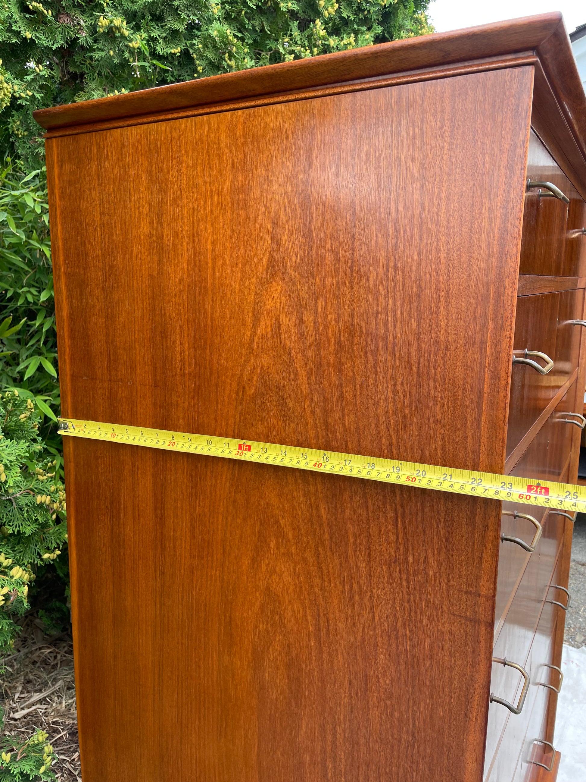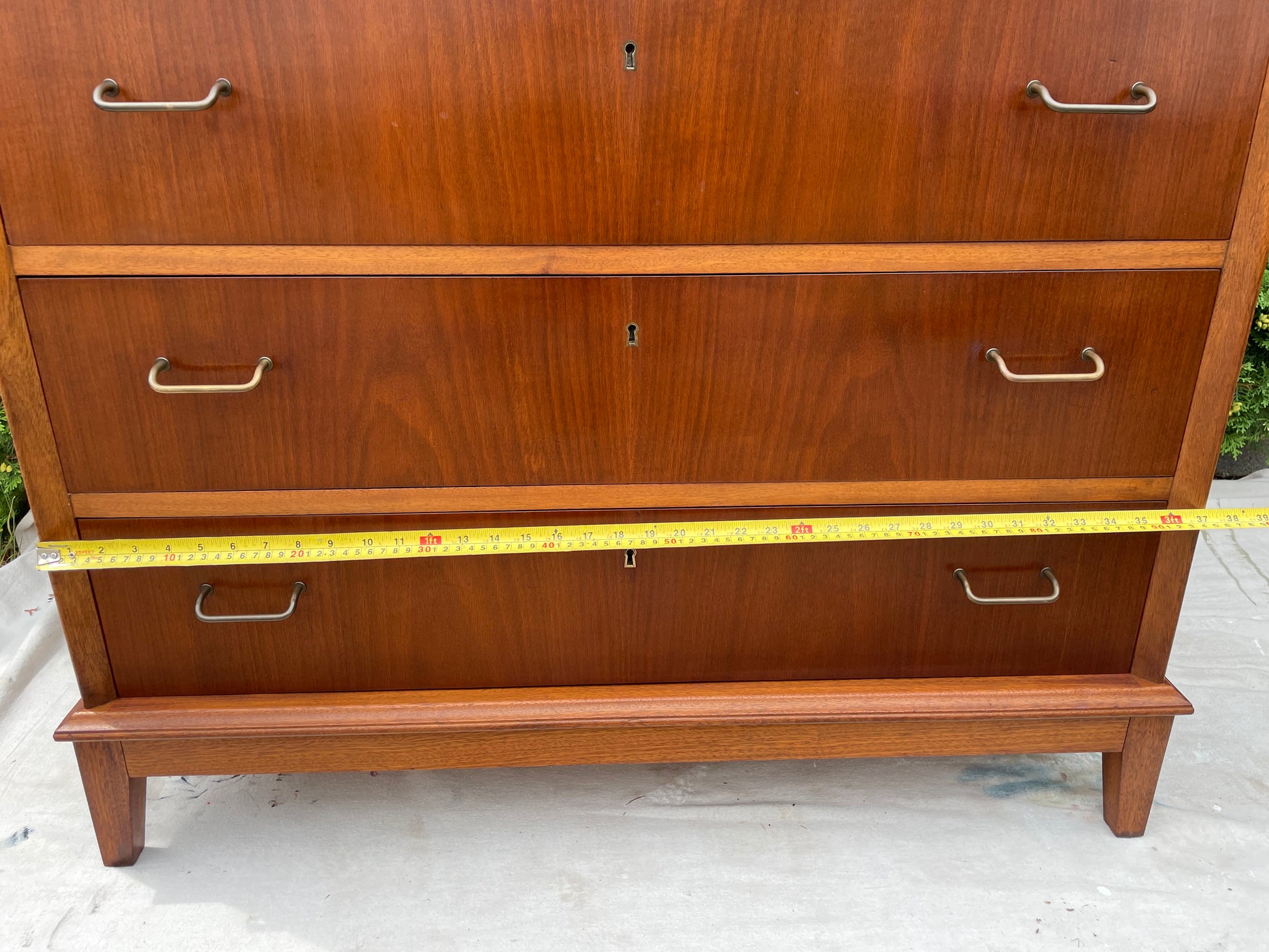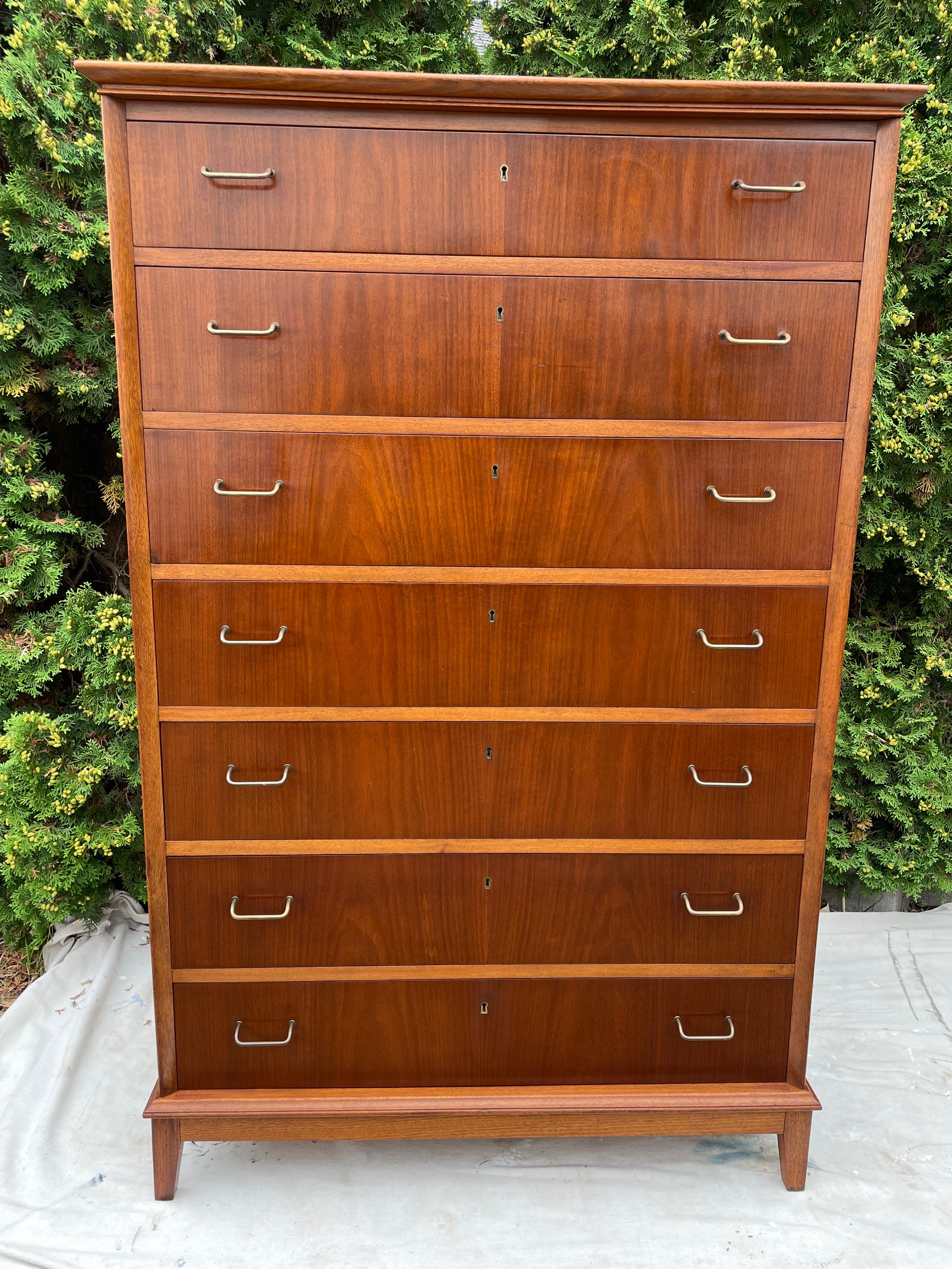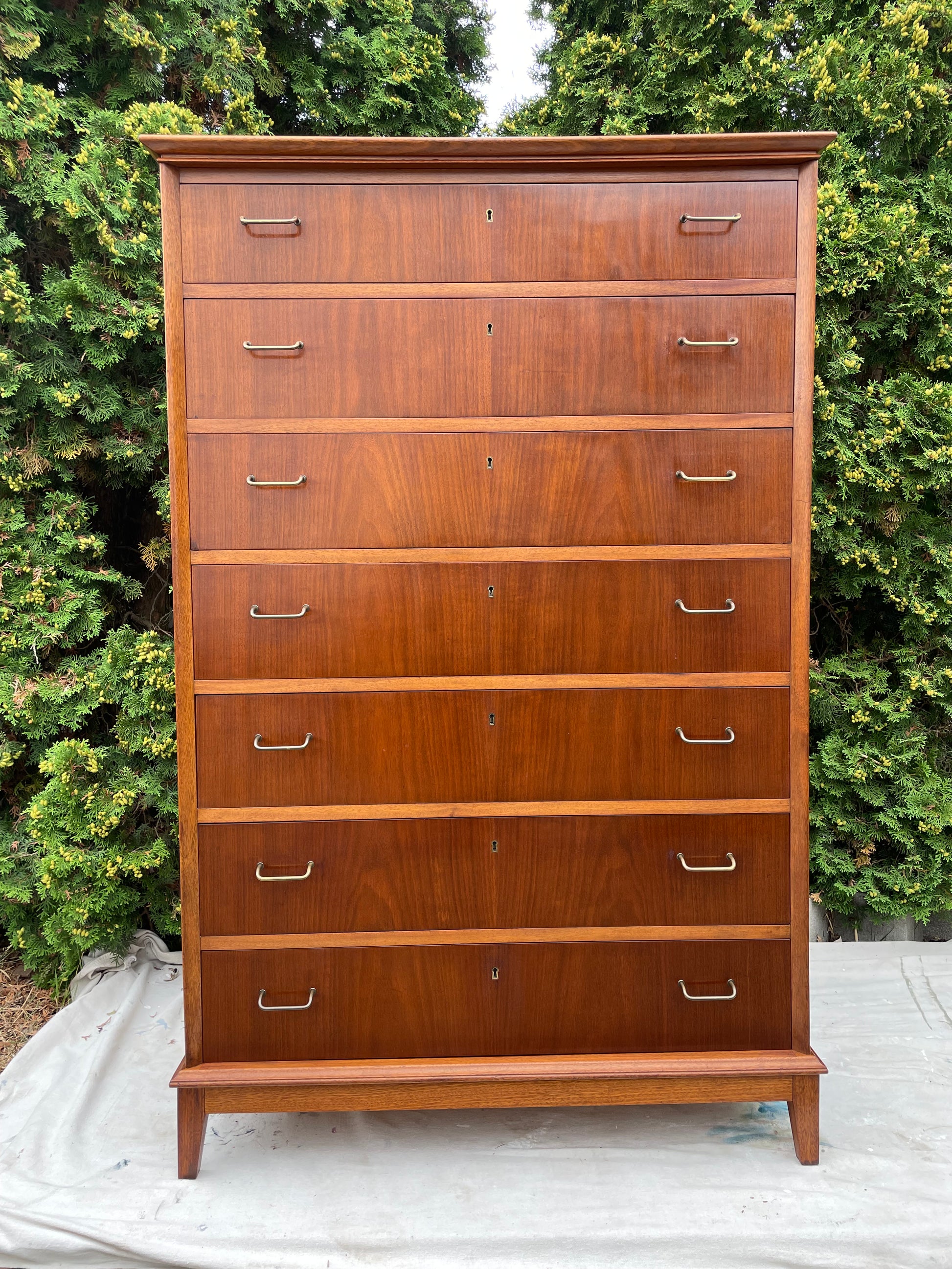An elegant Danish highboy dresser designed by Ole Wanscher for A.J. Iversen in the 1940s. Made of walnut and red beech. This set of drawers or tall boy features understated traditional classical styling, seven drawers, and minimal modernist thin brass handles.