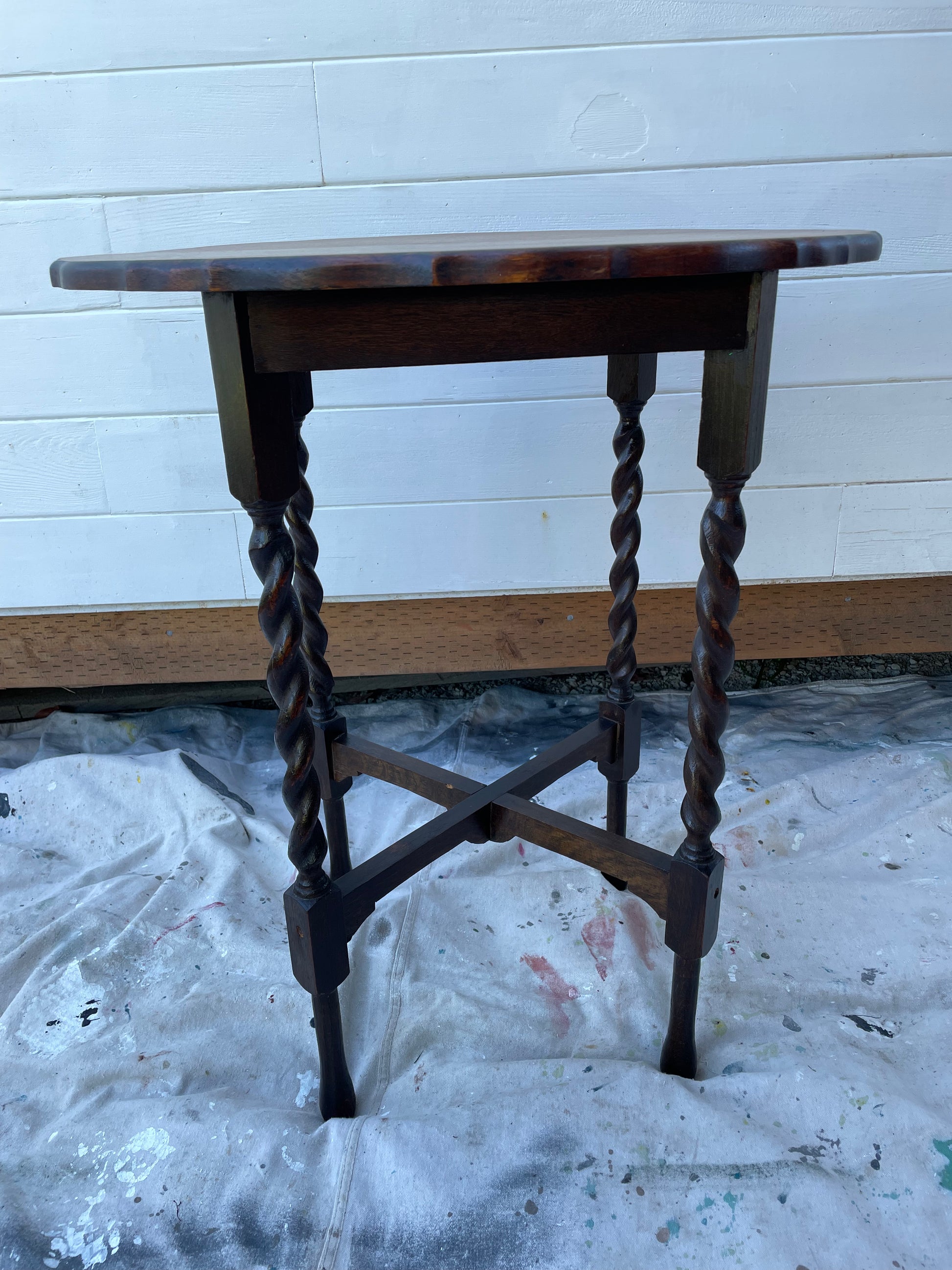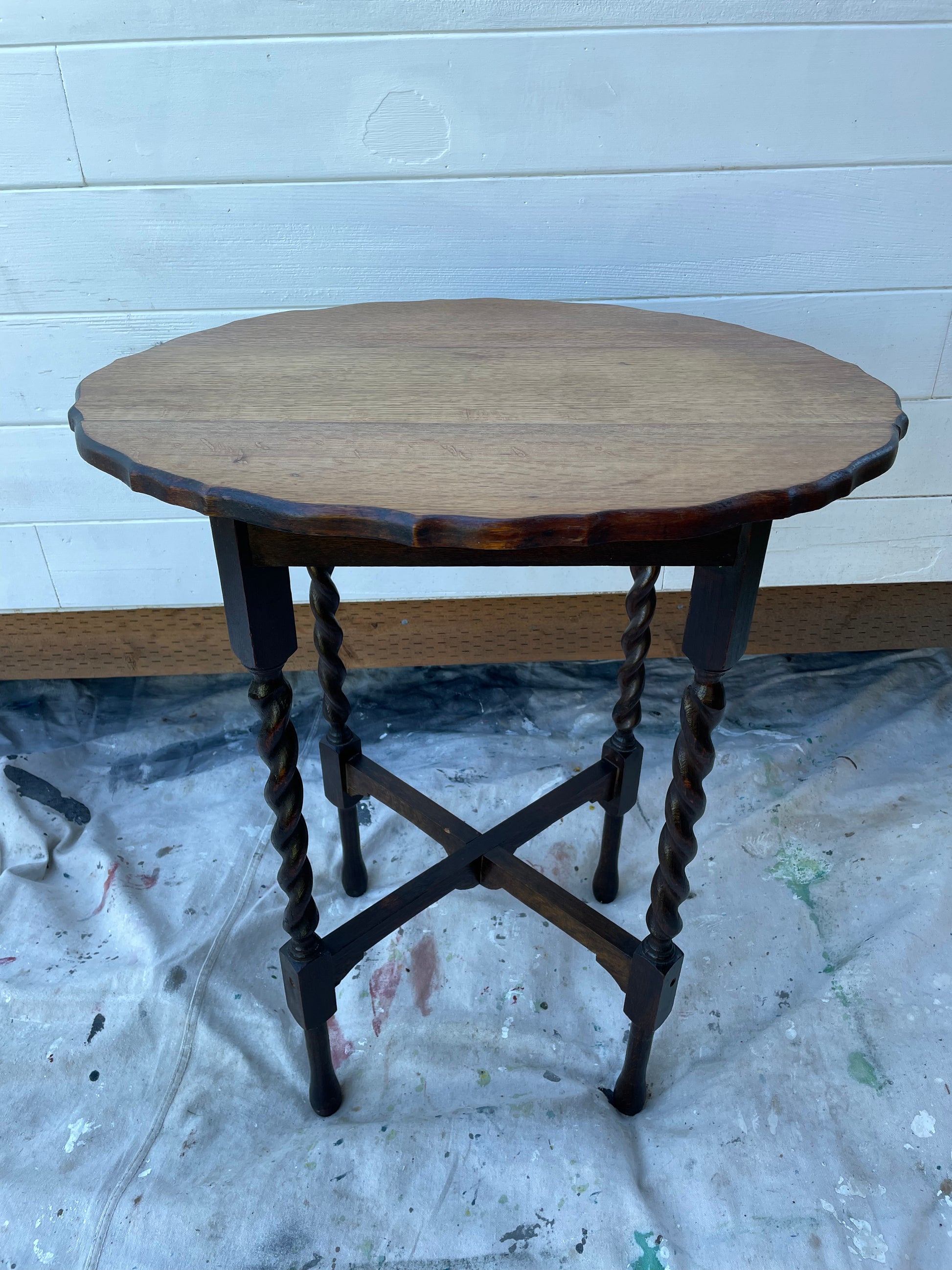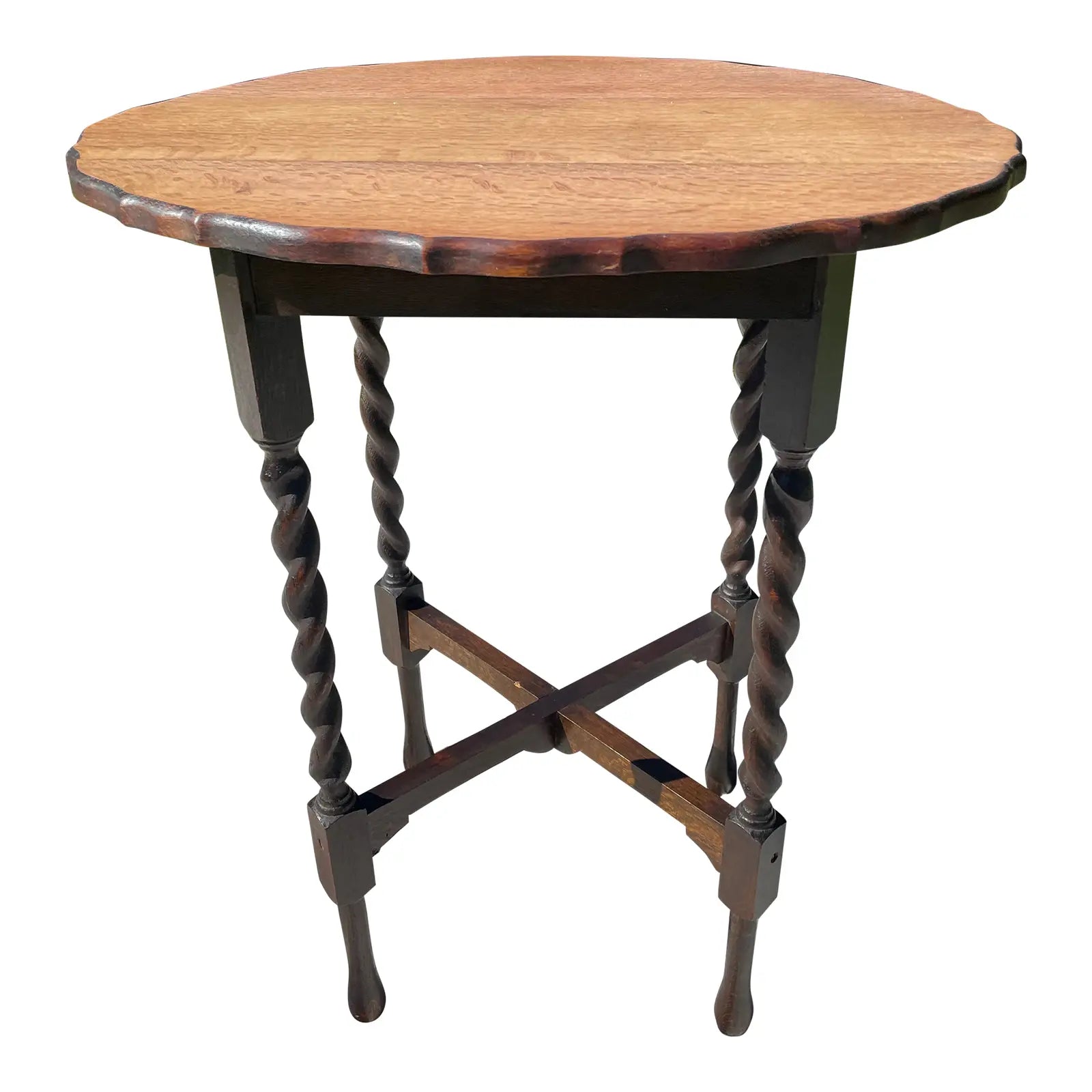 An antique solid oak side table with barley twist detail and scalloped edges. The top has been refinished to highlight the natural wood tone and the rest was left to embrace the antique dark stained patina finish.