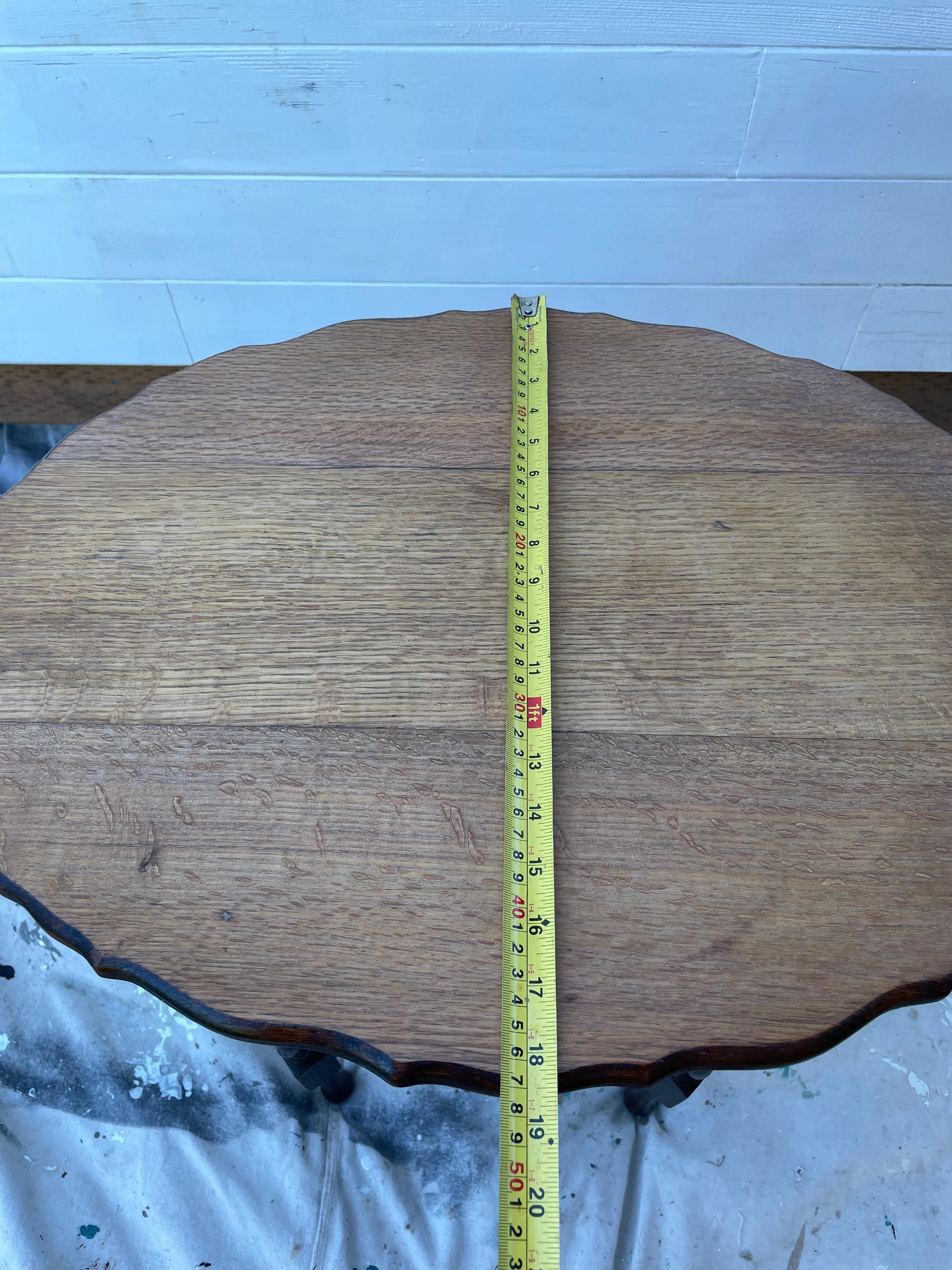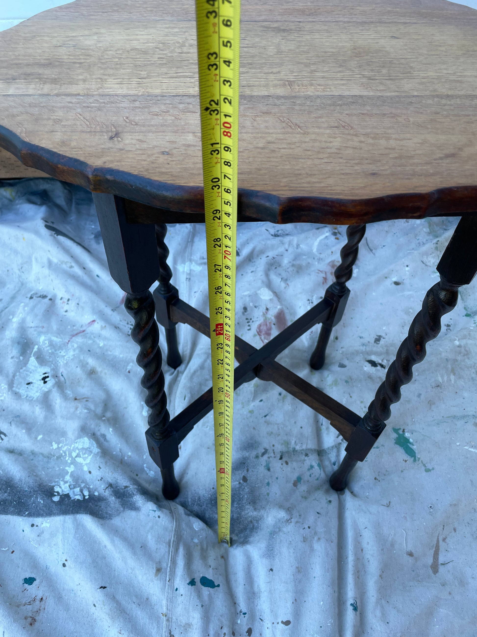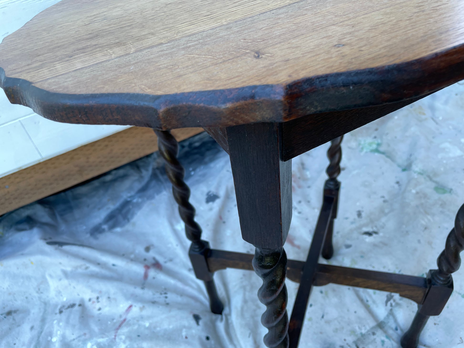 An antique solid oak side table with barley twist detail and scalloped edges. The top has been refinished to highlight the natural wood tone and the rest was left to embrace the antique dark stained patina finish.