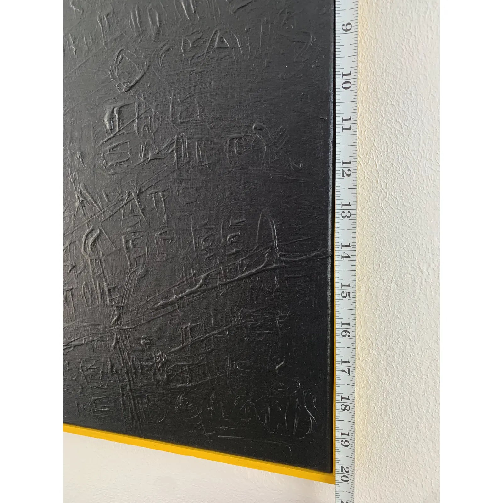 Original acrylic on canvas. The painting features a layered and textured composition covered in deep black. The painting is framed by the artist in a thin yellow-painted oak wood frame.