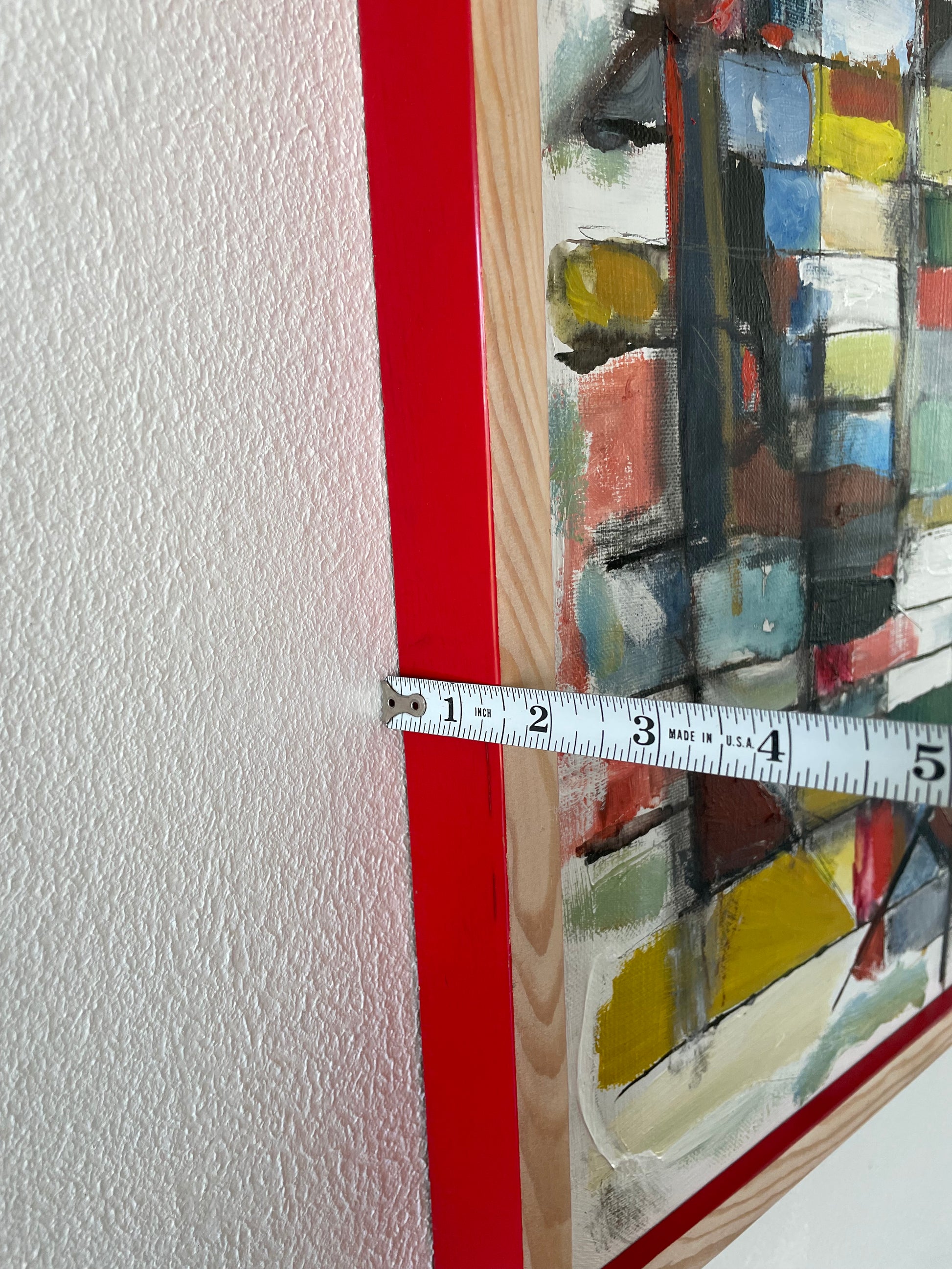 A framed abstract painting with a loosely gridded composition. The piece features vibrant colors and movement through the piece. The work is framed in a vintage frame with a red lacquer finish and a natural wood front. The piece is signed in the lower right. This piece was completed in 2025.