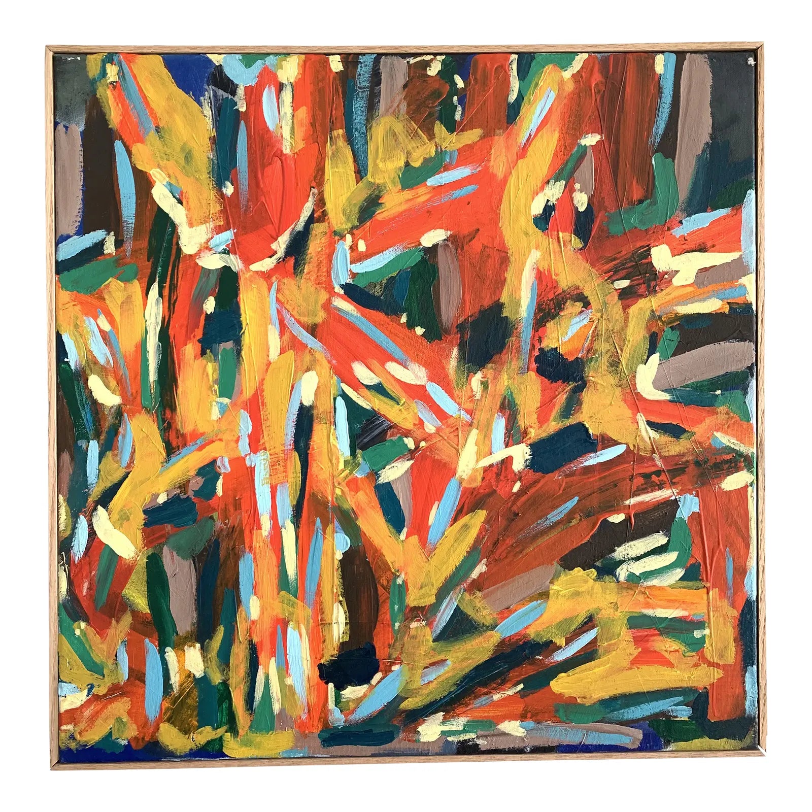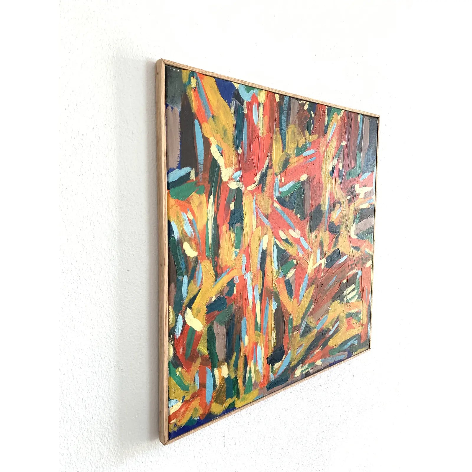 Abstract expressionist acrylic on canvas. The painting features brilliant layered colors in short energetic strokes. Framed in a simple thin red oak wood frame.
