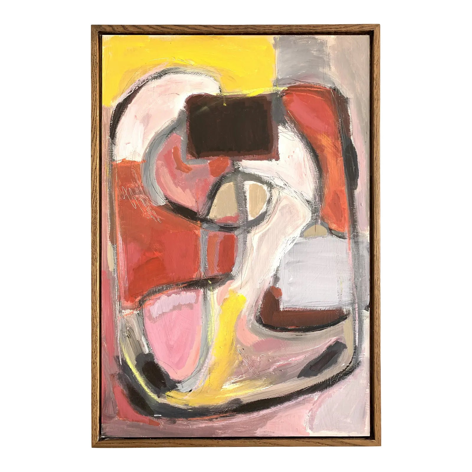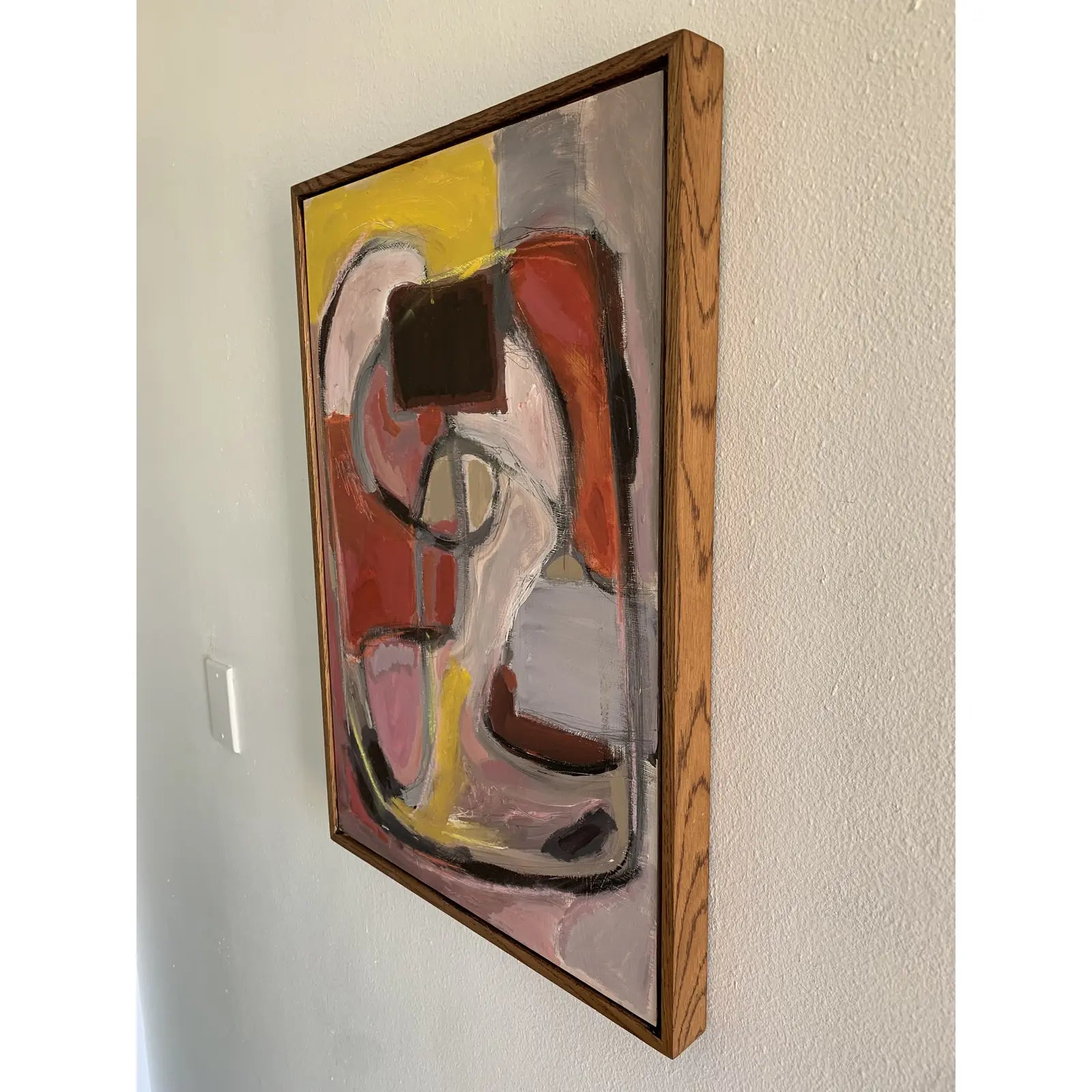 Framed abstract on board. The painting features flowing forms in reds, yellows, and grays. Framed by the artist in a walnut stained wood frame.