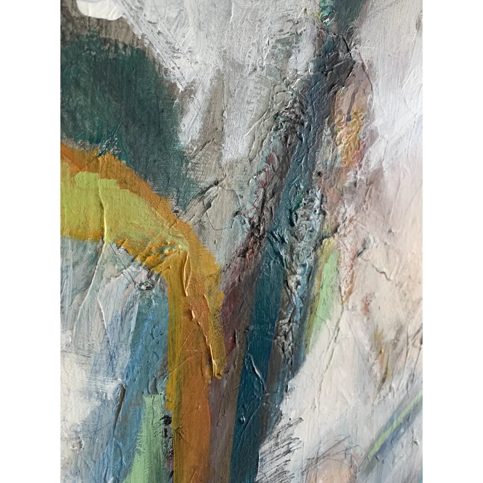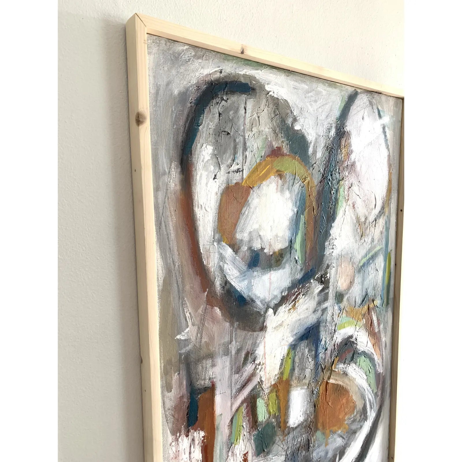 Abstract acrylic painted on a vintage canvas. The painting features a textured surface with depth added by the use of different sheens and layers of color. Framed by the artist in an unfinished light reclaimed wood.