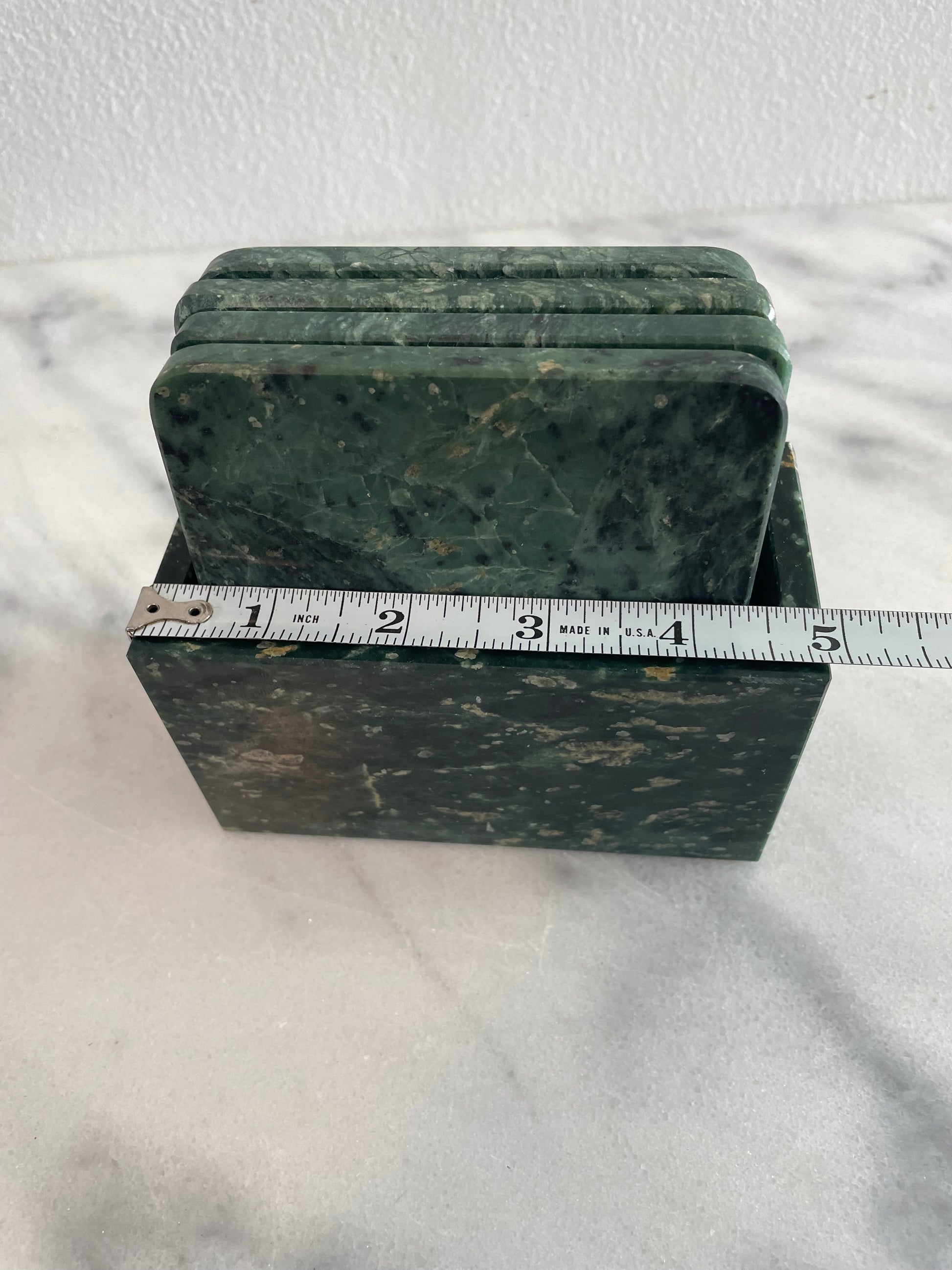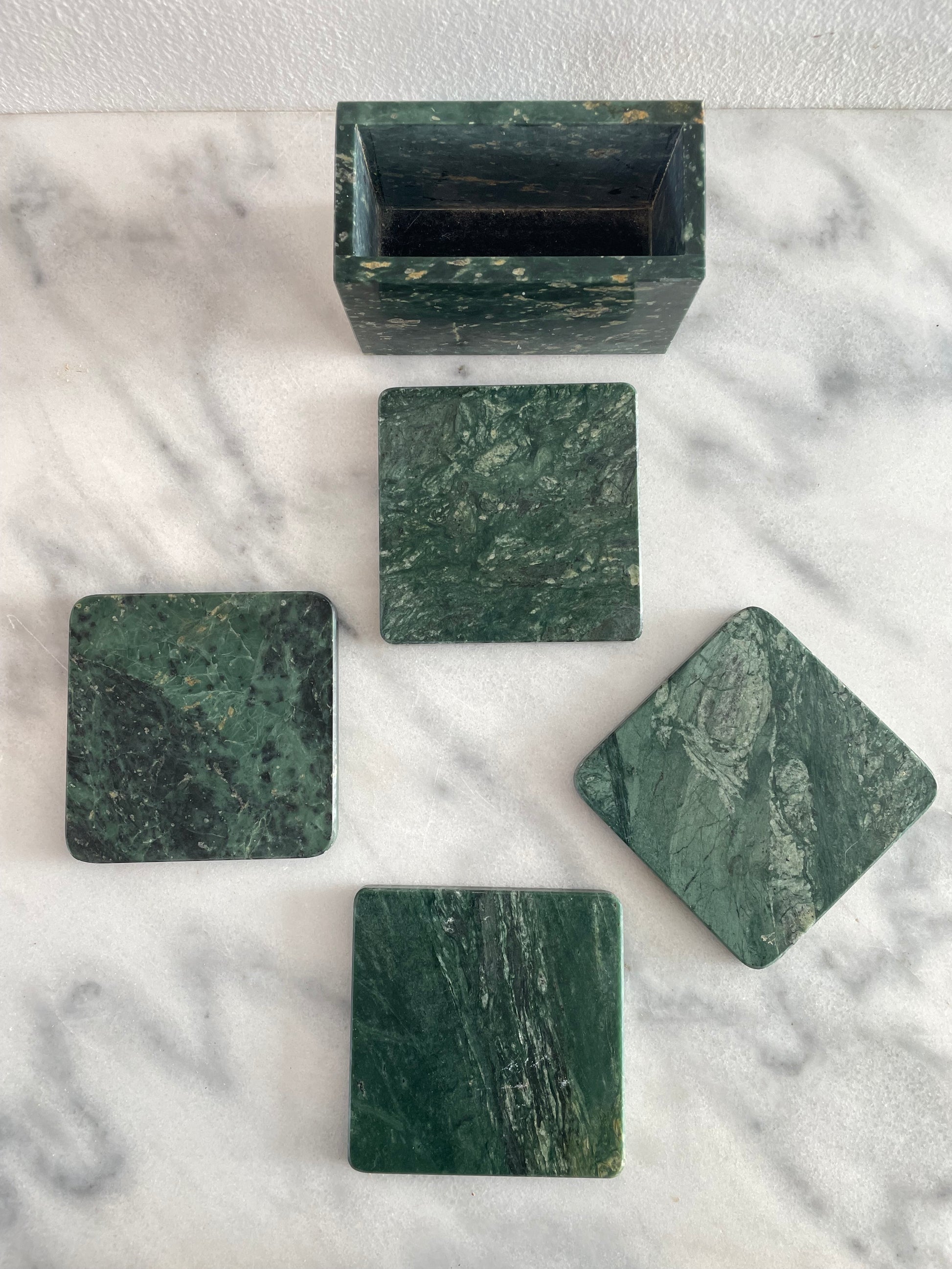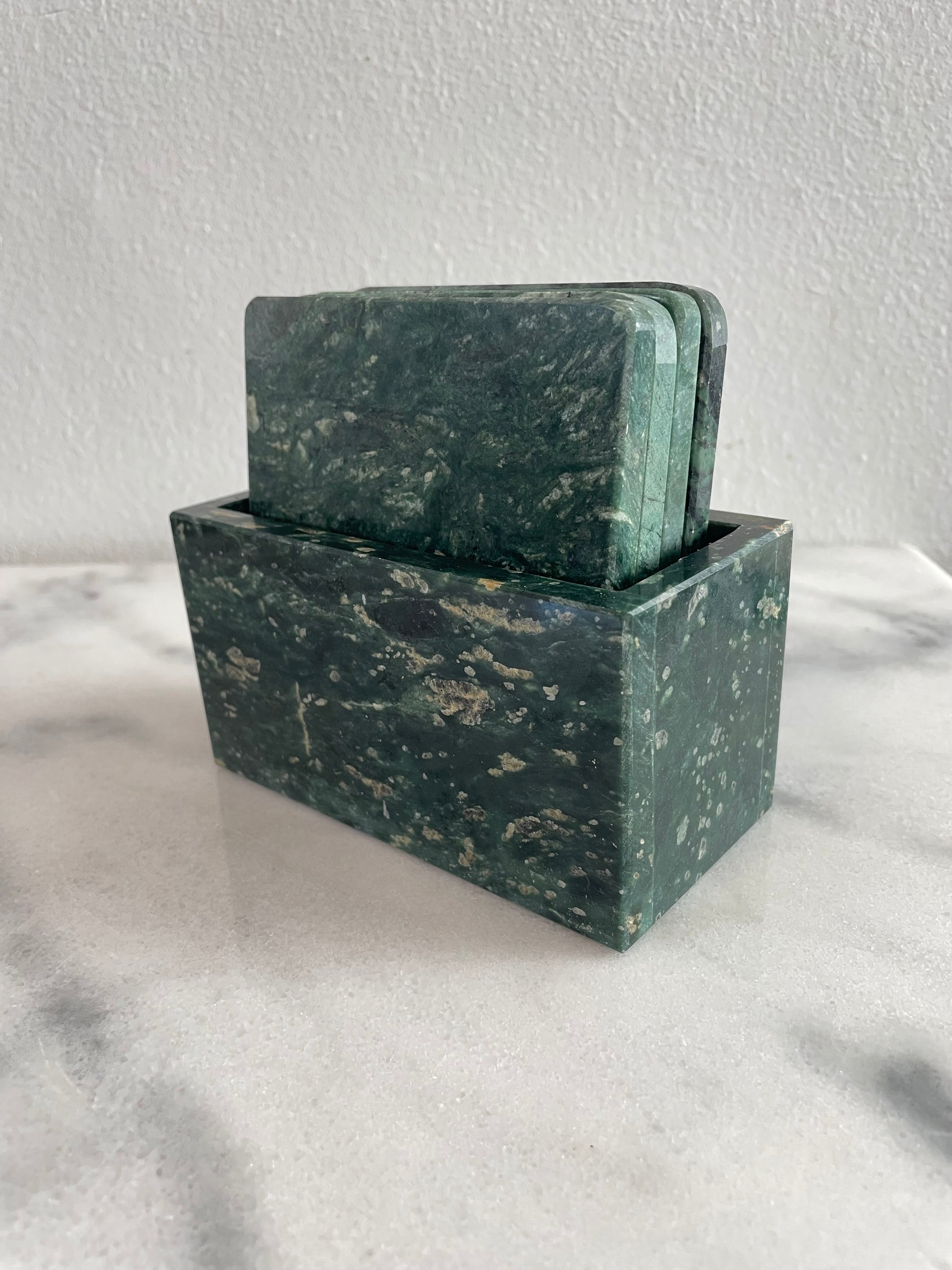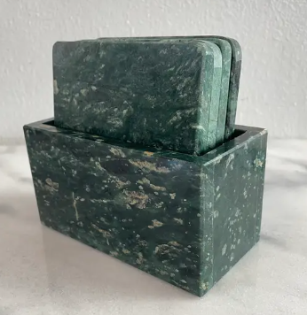 Protect your surface without compromising style with this set of naturally beautifully green marble coasters. The coasters come with a matching box for tidy storage.