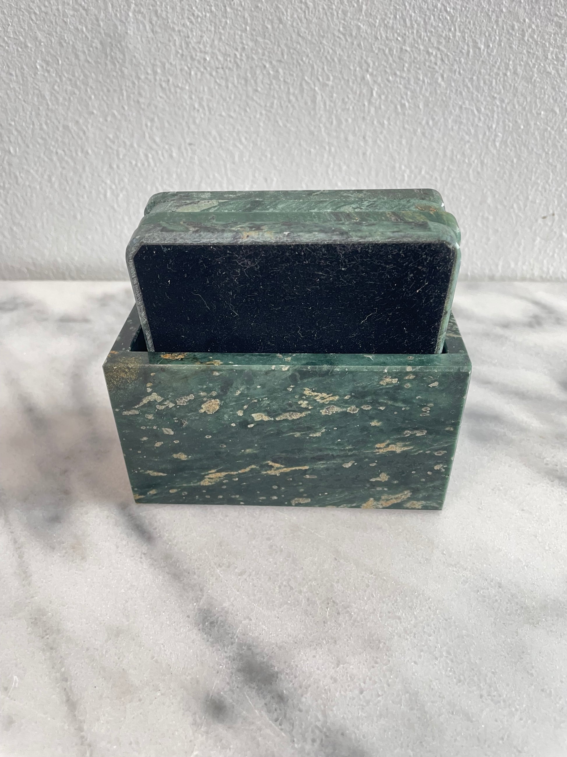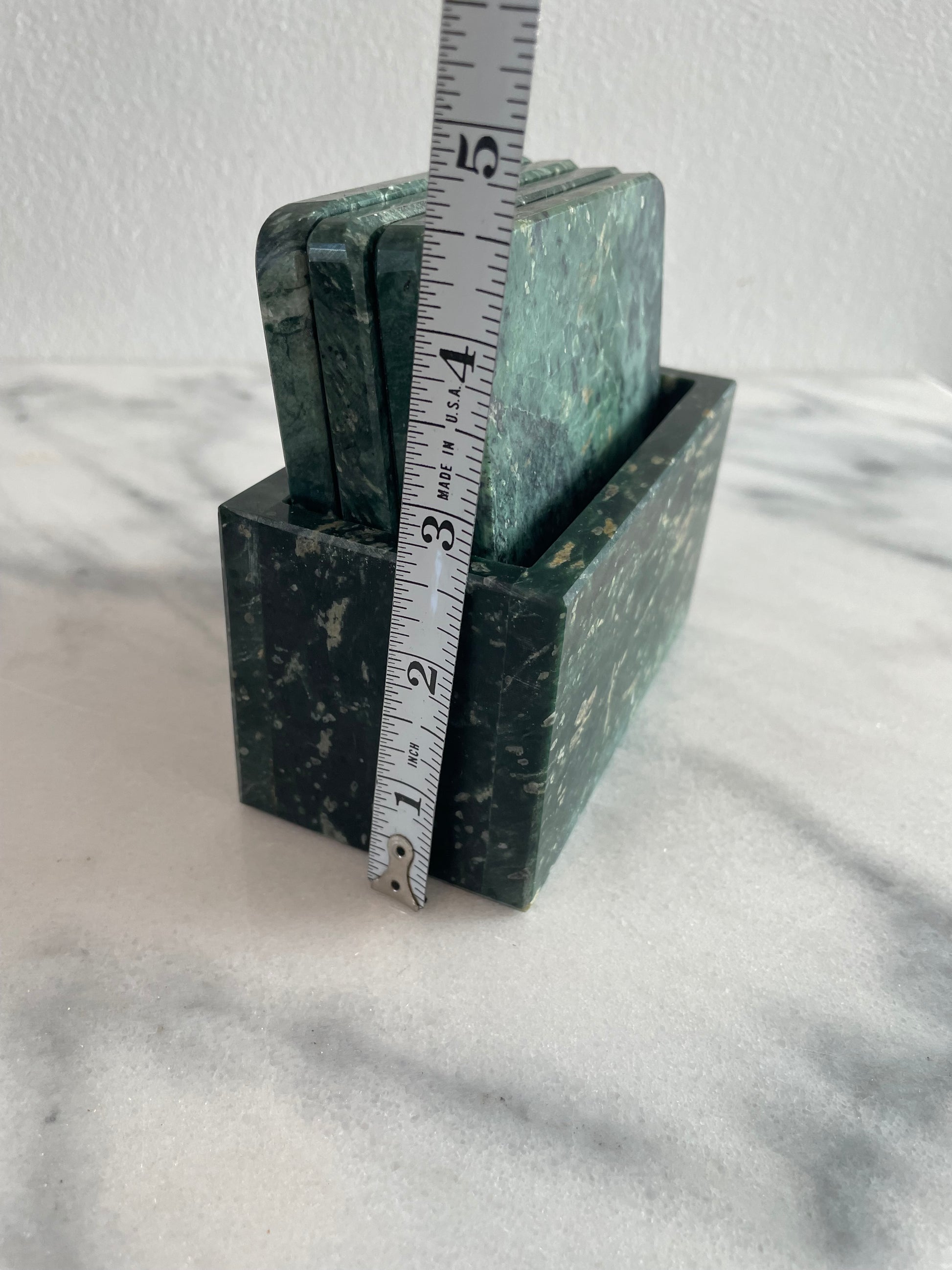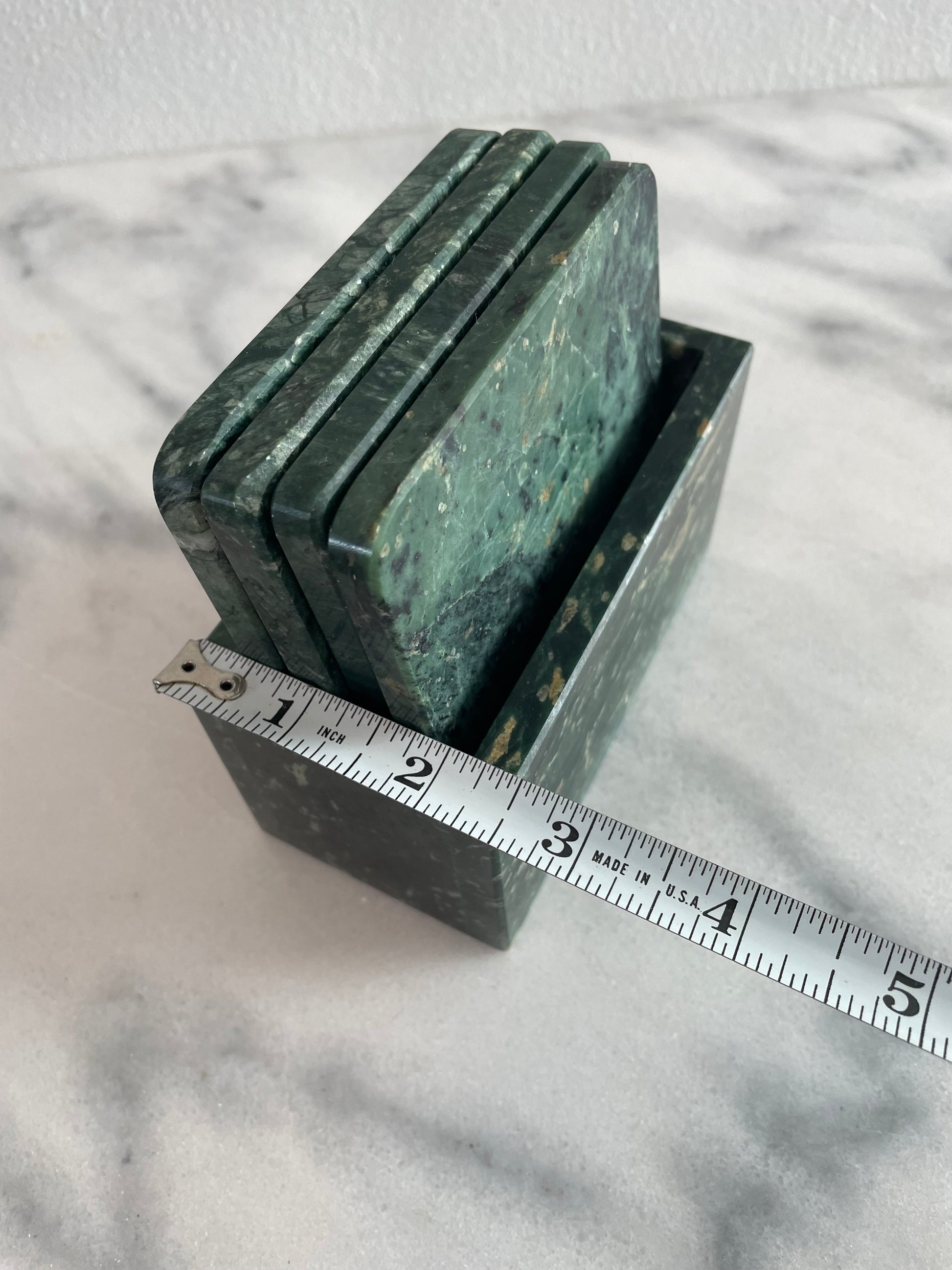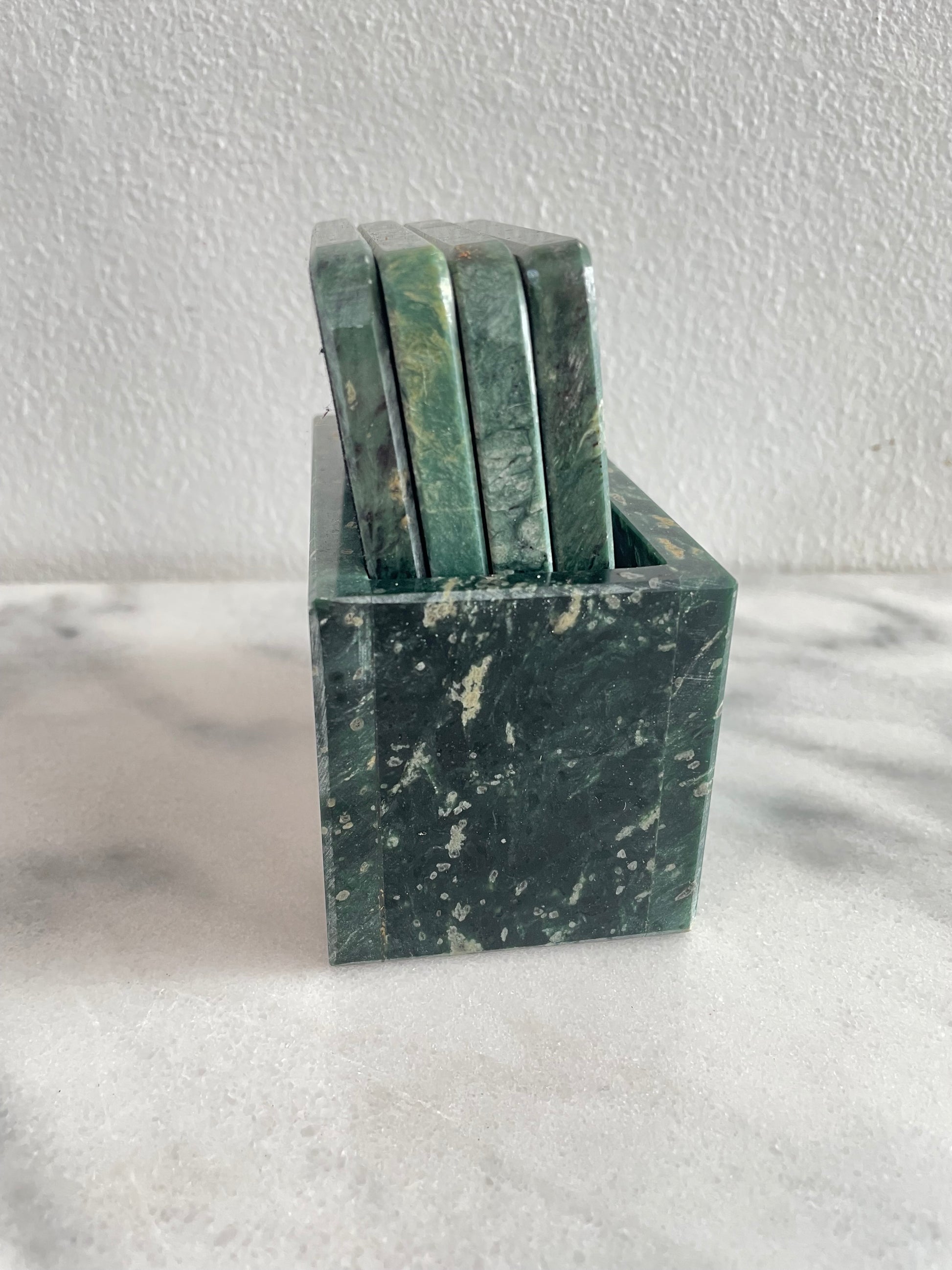 Protect your surface without compromising style with this set of naturally beautifully green marble coasters. The coasters come with a matching box for tidy storage.