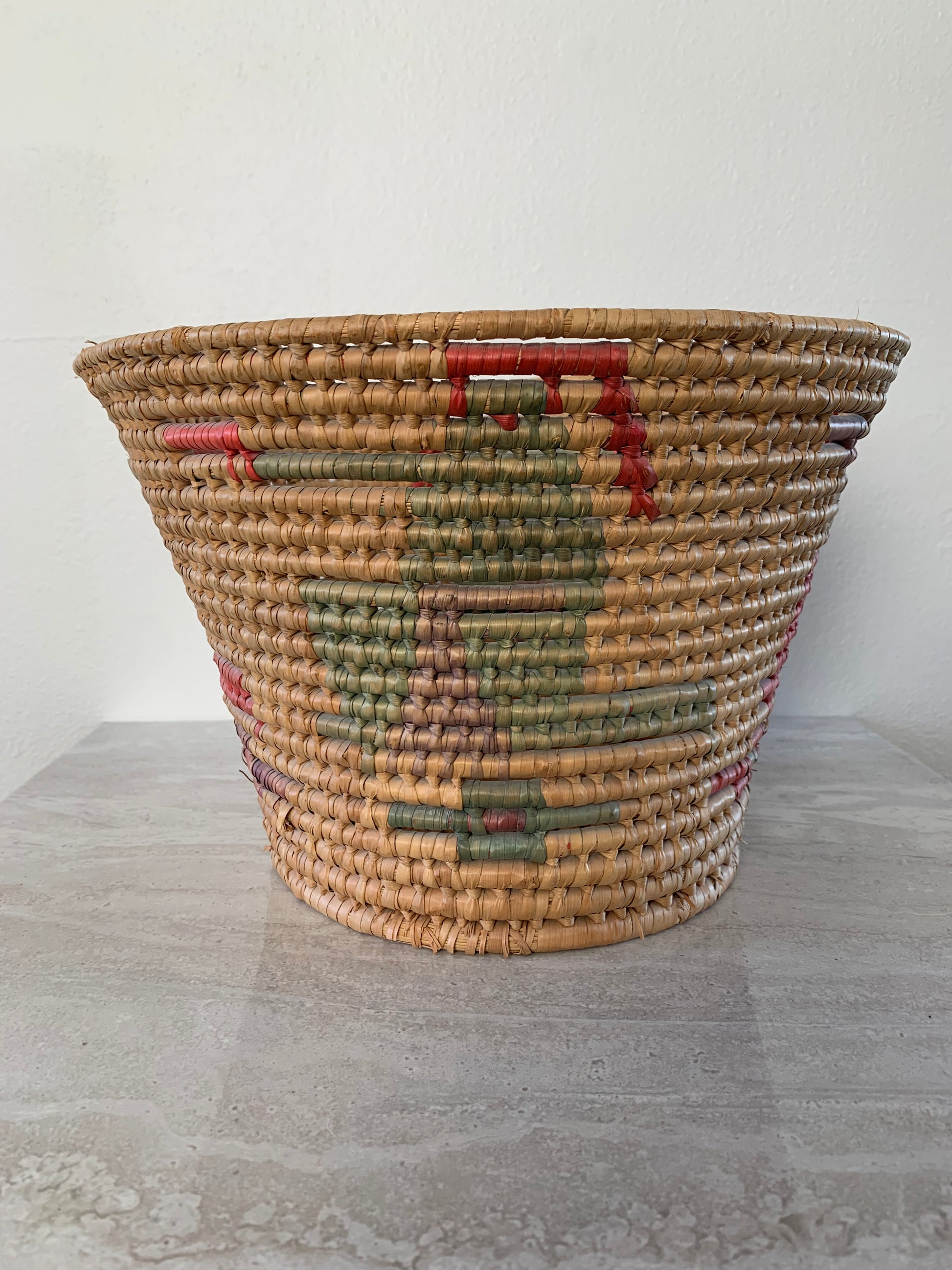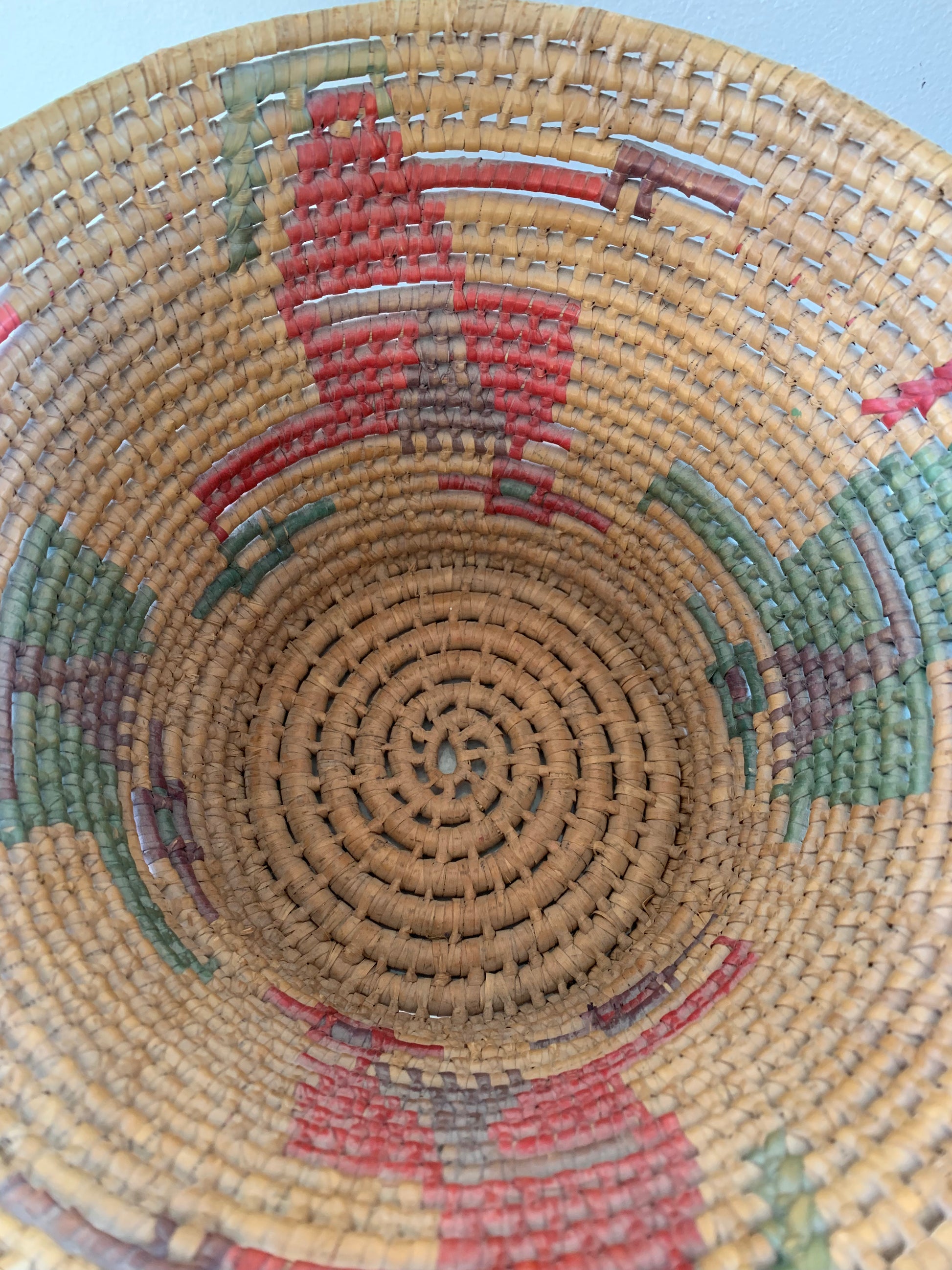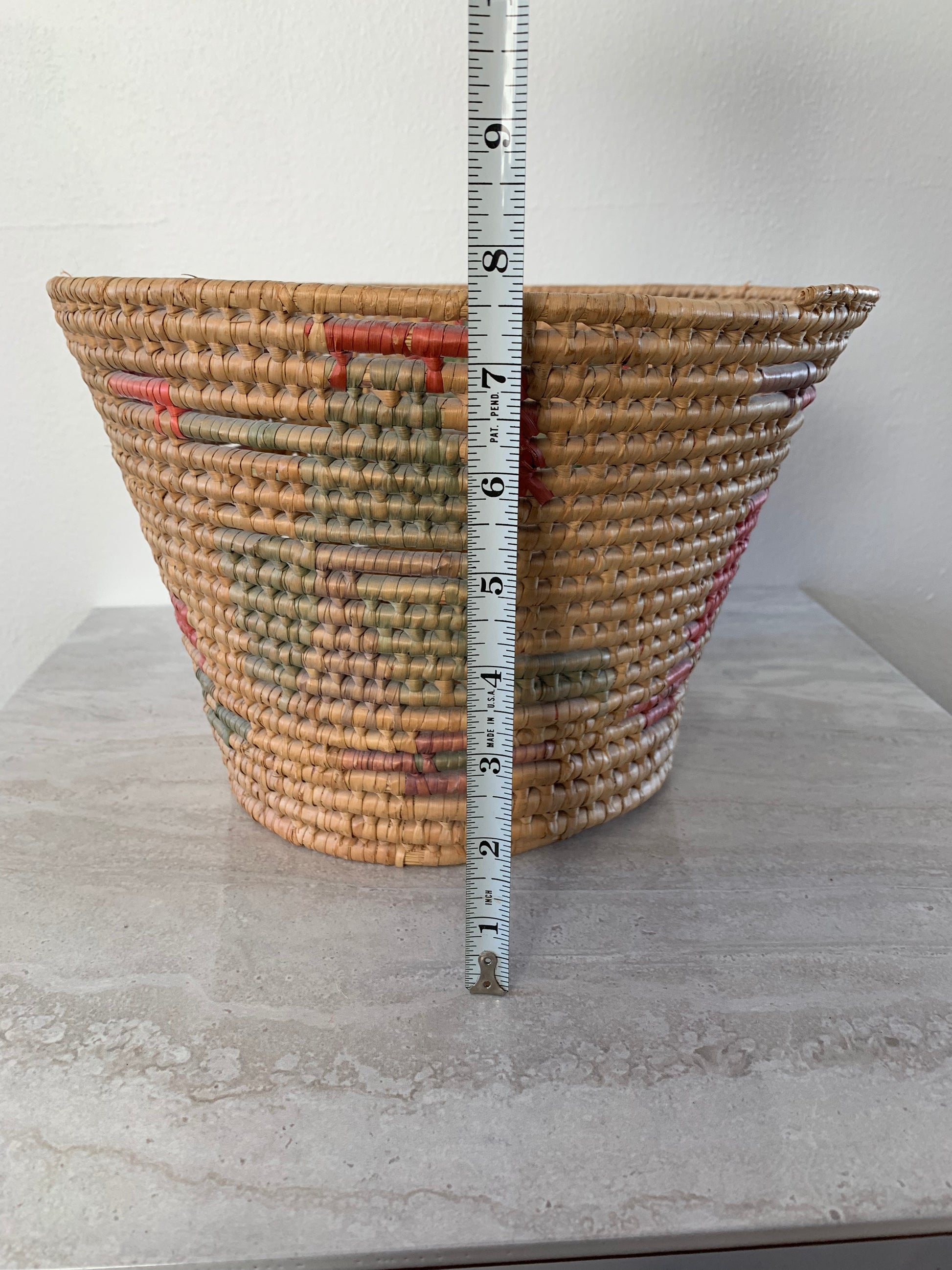 Compelling hand made tribal art woven basket. No idea of origin. Great piece to add in with many decor styles. Organic fibers, likely some type of rope made with straw or hay