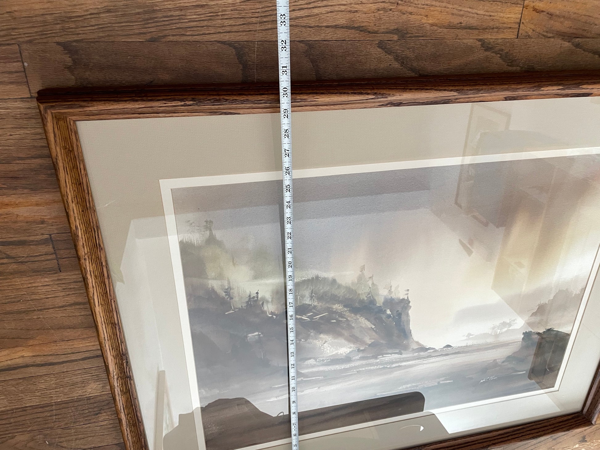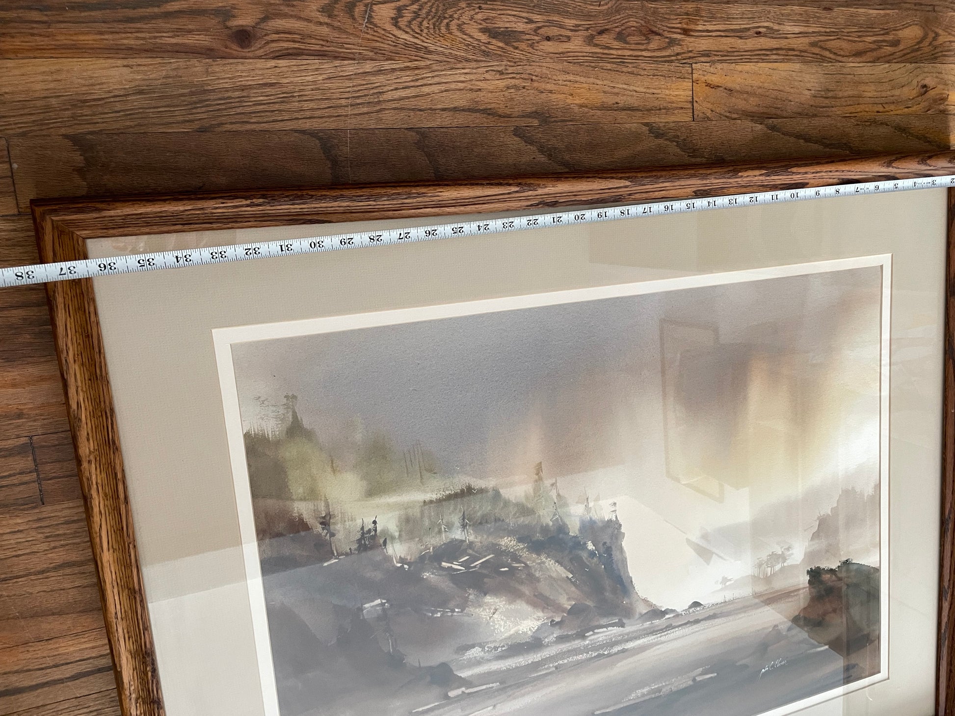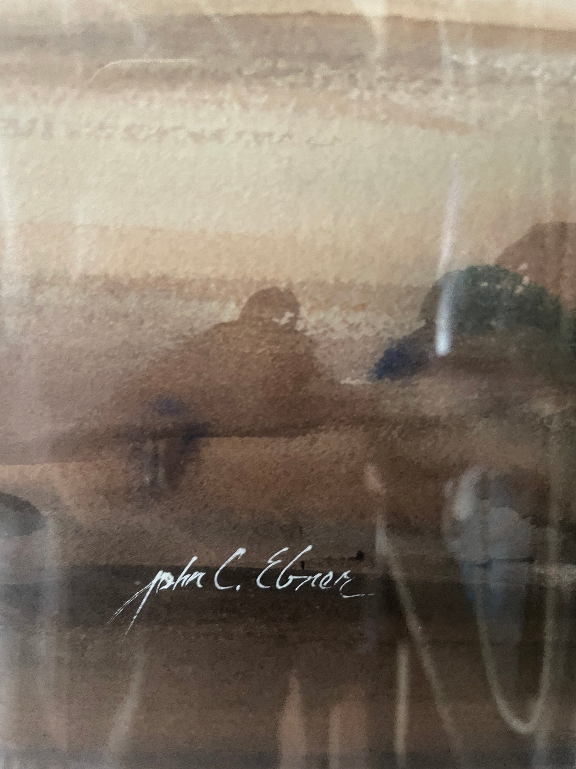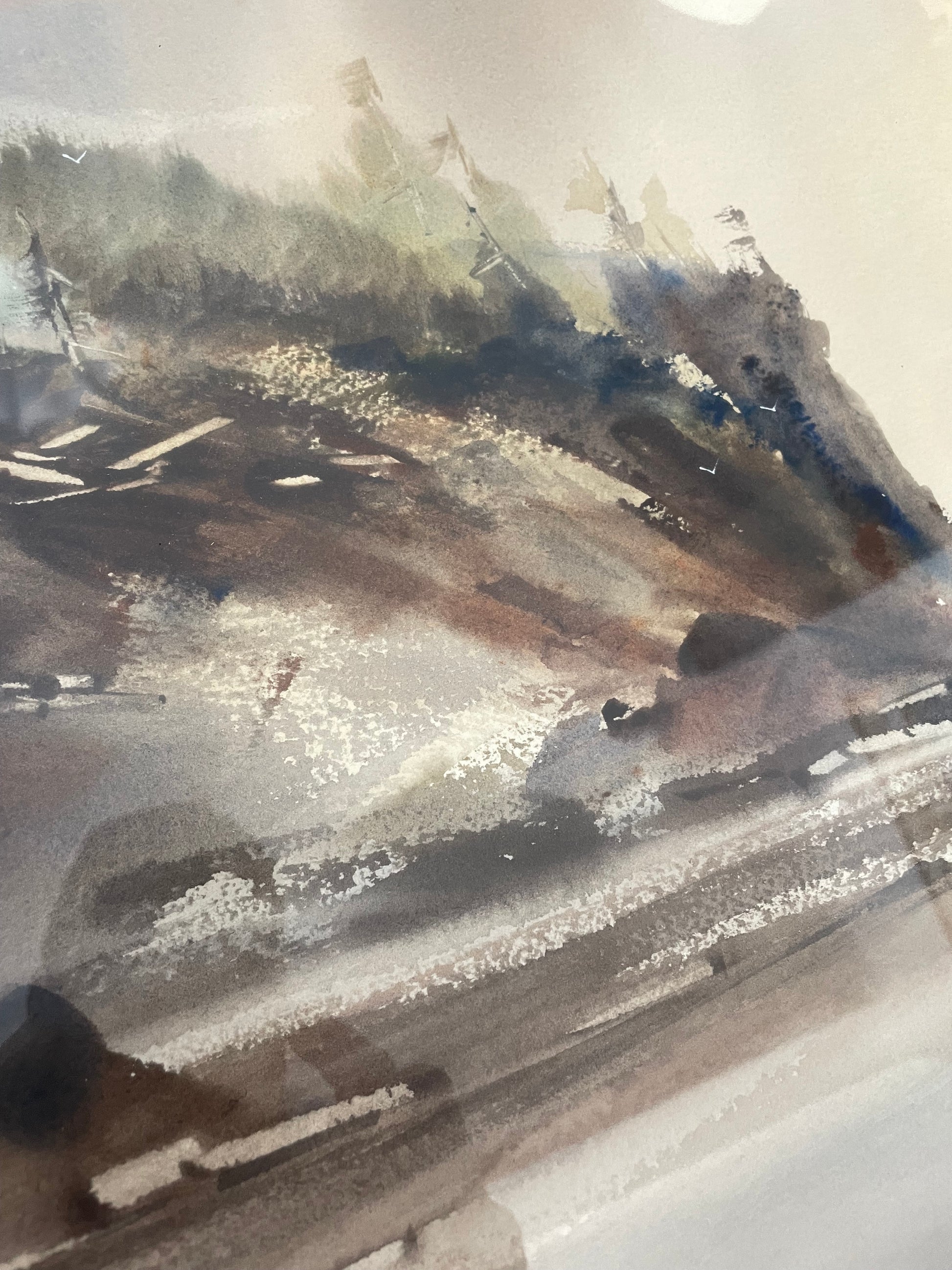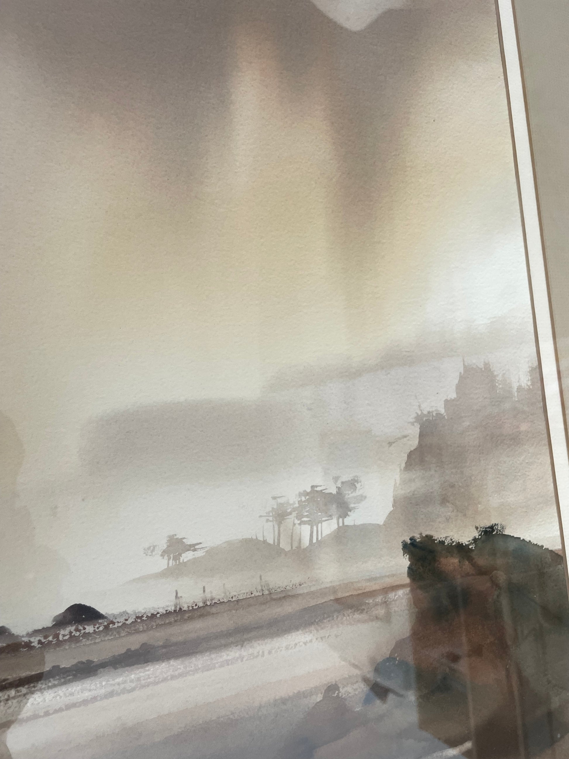 This is a watercolor painting by American artist John Ebner. The painting depicts a seaside landscape, likely a Pacific Northwest coastal scene, with a muted color palette and a misty, atmospheric quality. John Ebner is known for his watercolor paintings that capture the mood and essence of the Pacific Northwest. His work often features elements like misty mountains, beaches, and water. The artist's style is characterized by a contrast of soft and hard edges, as well as warm and cool colors. Ebner's work is considered highly collectible in the Northwest.