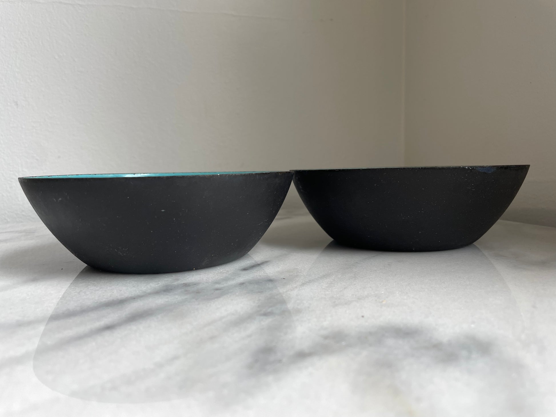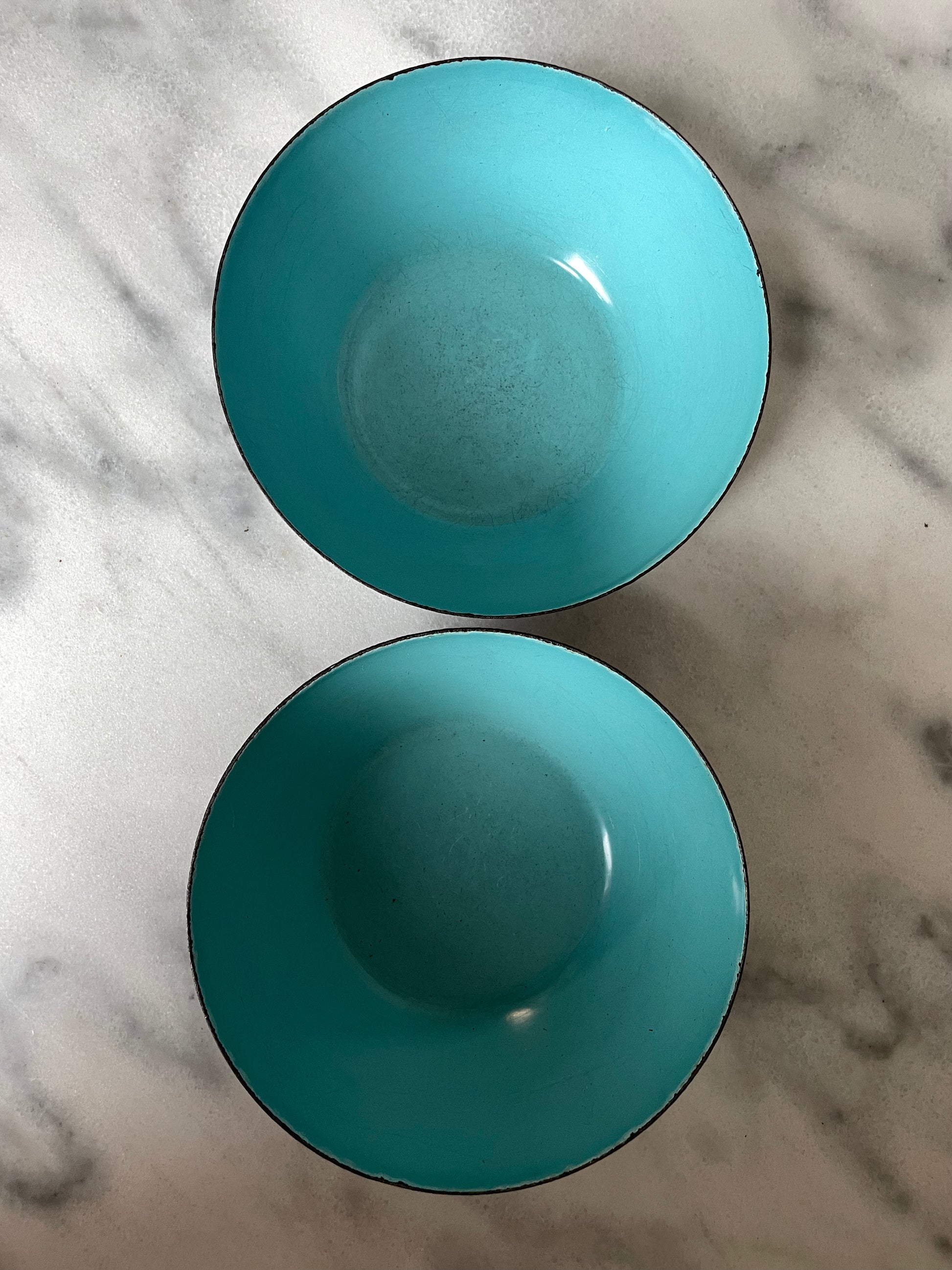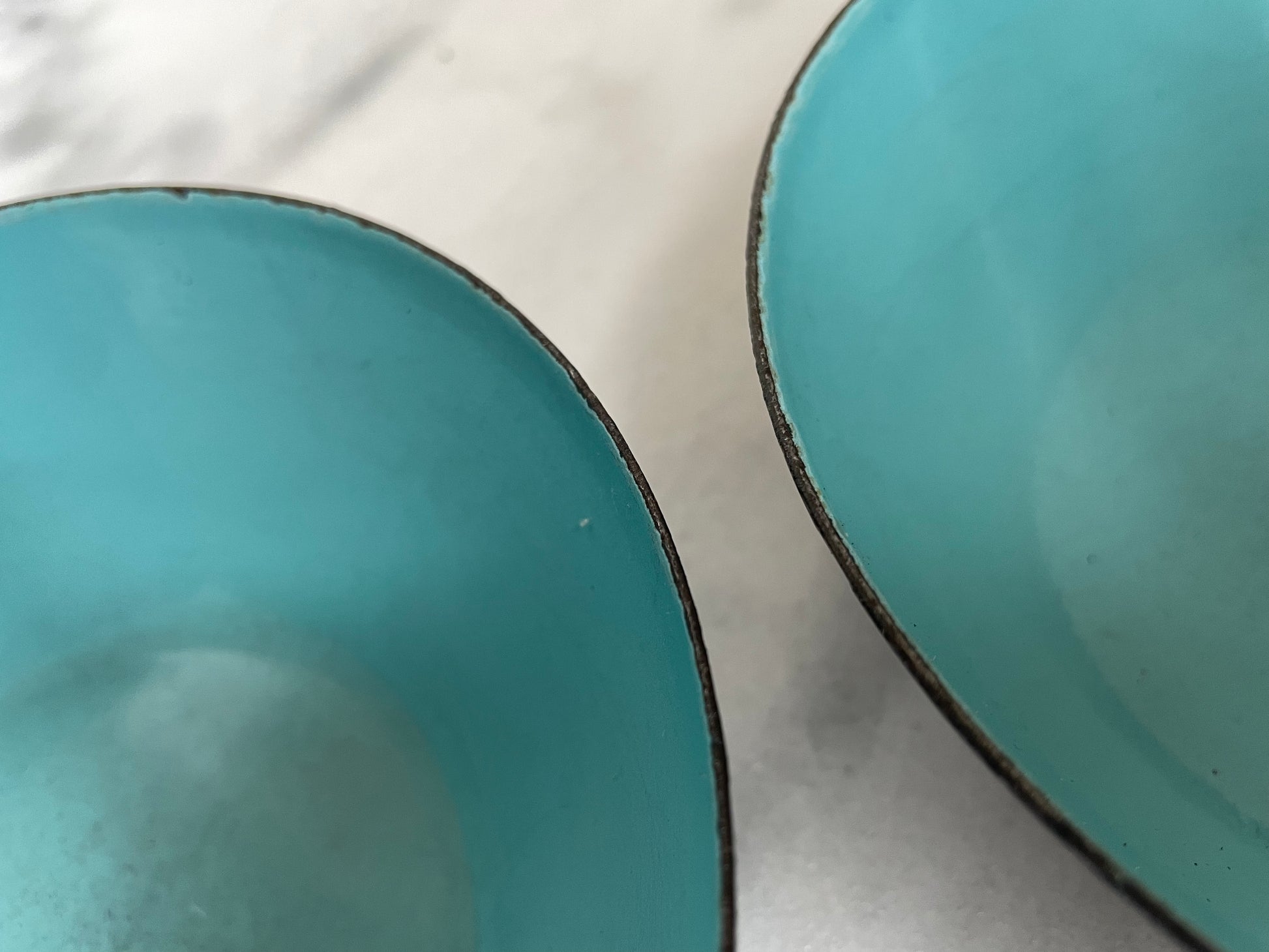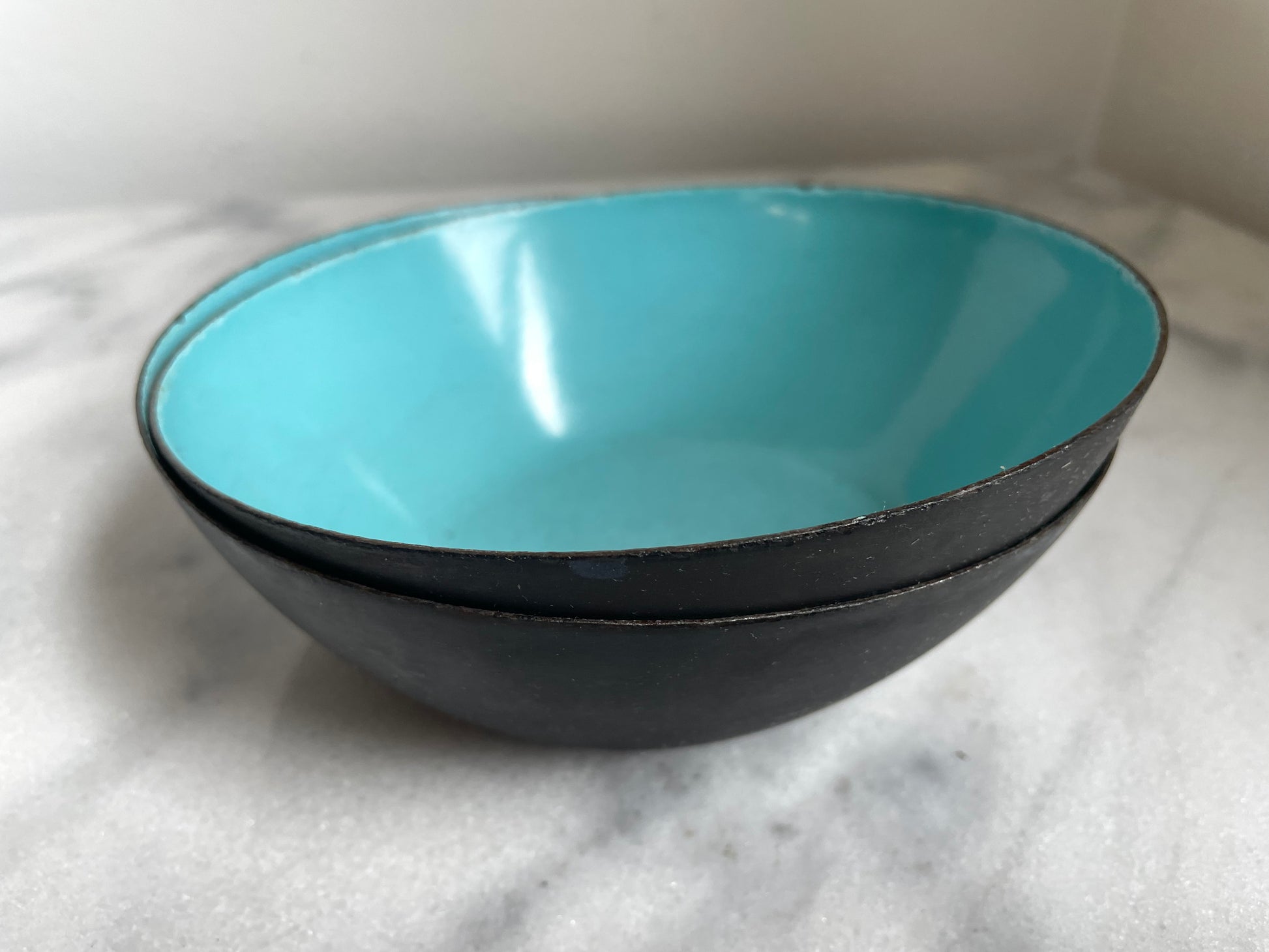 Set of 2 bowls in metal and blue enamel. Designed by Herbert Krenchel and made by Torben Ørskov. Great original condition.