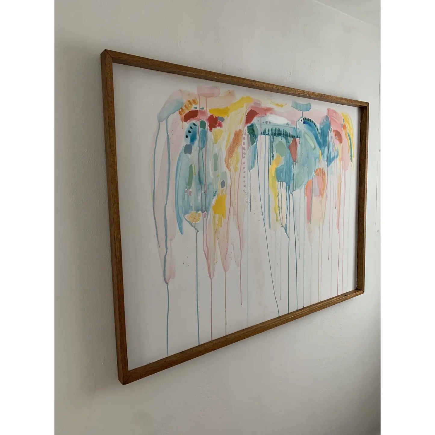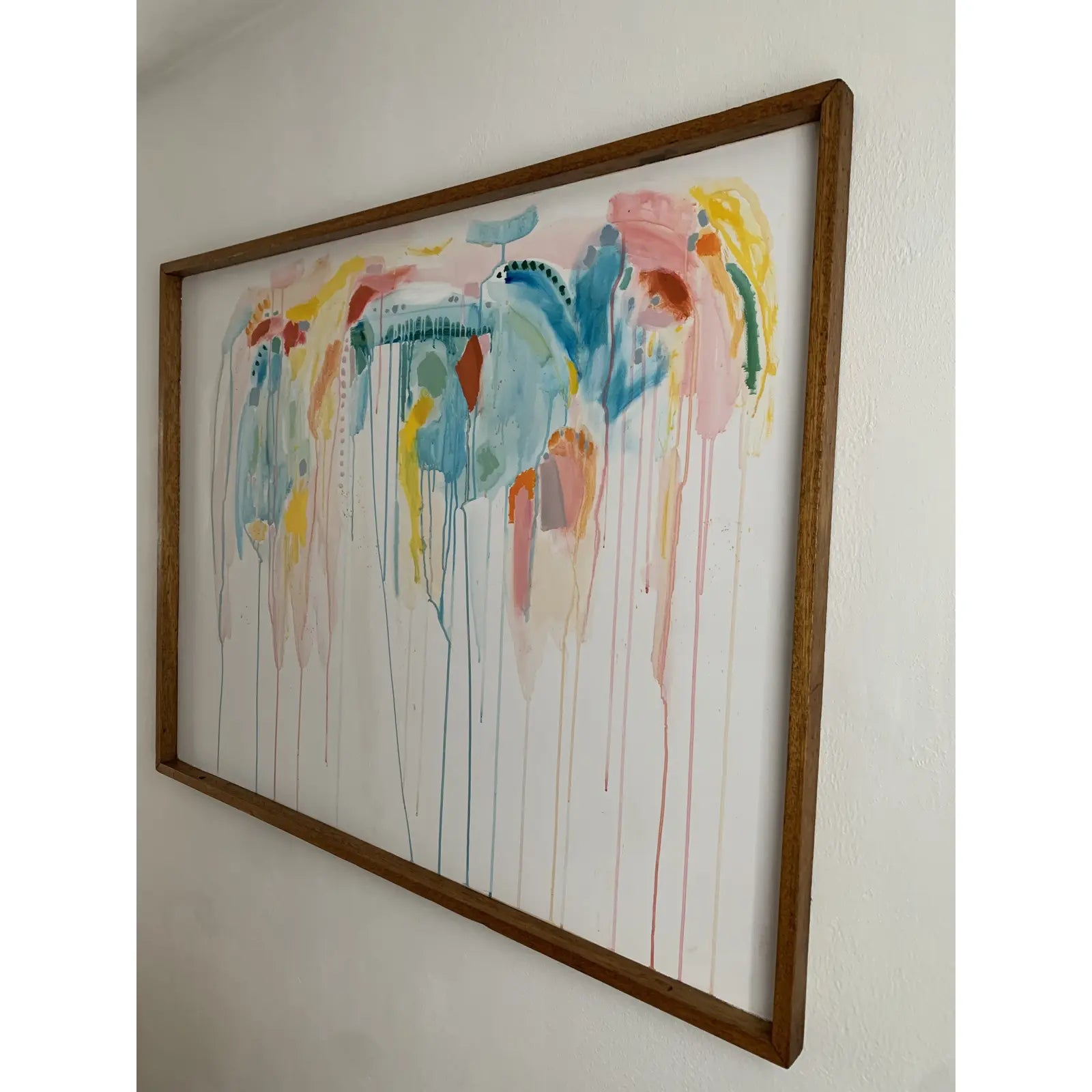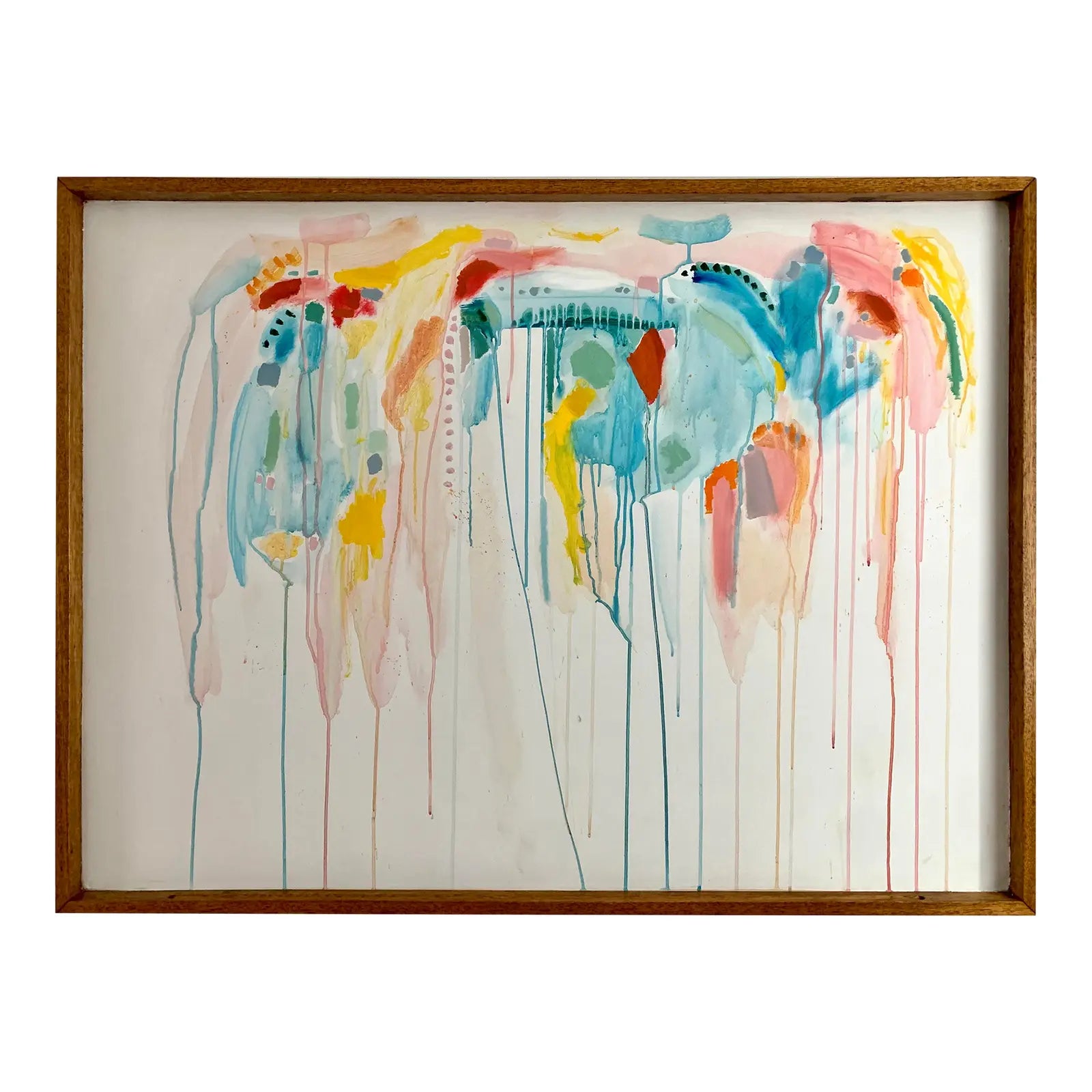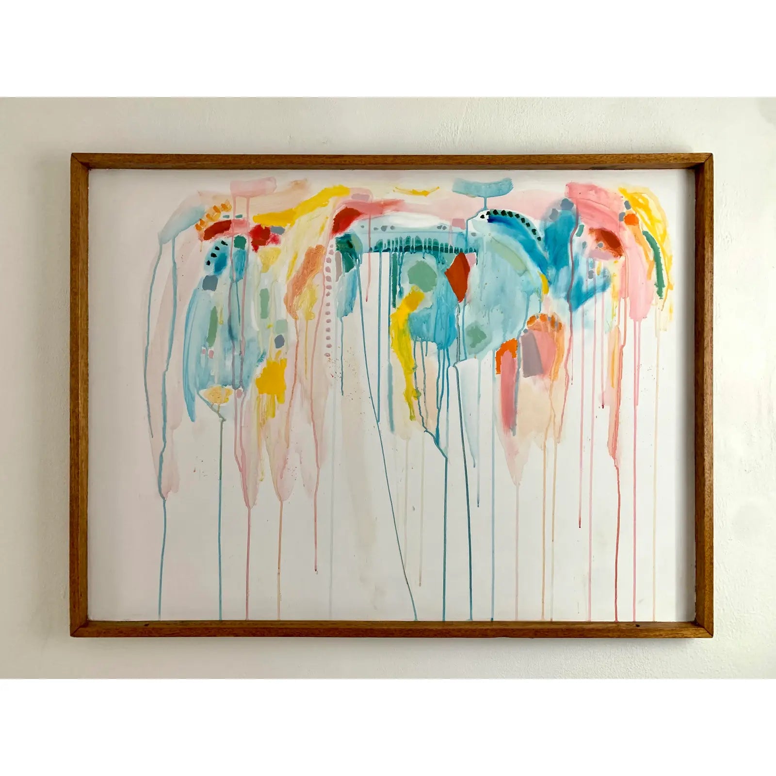 Large scale contemporary abstract acrylic on board featuring layers of pastel transparent drips, and opaque bright accents. Painted on an a vintage solid oak framed school display board.