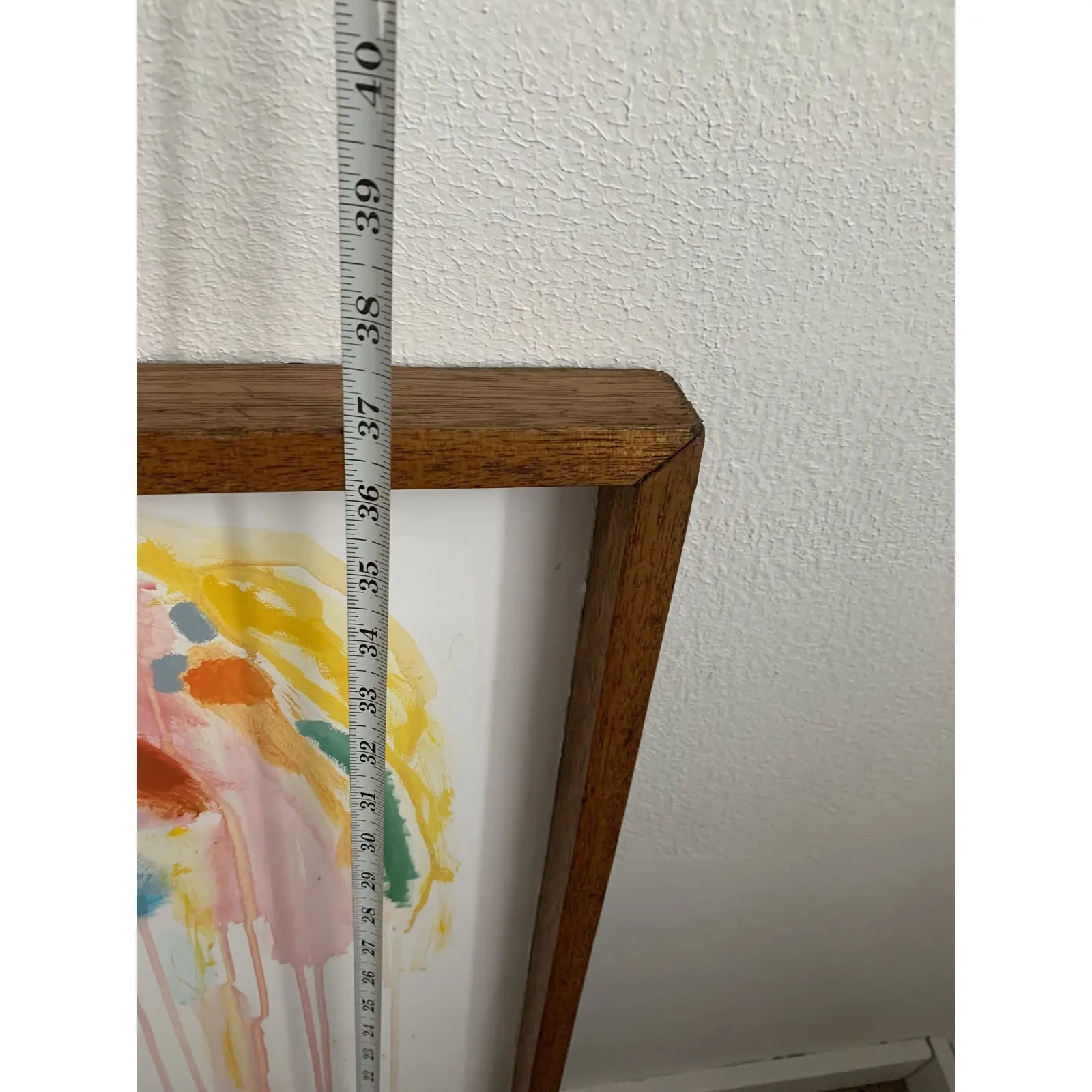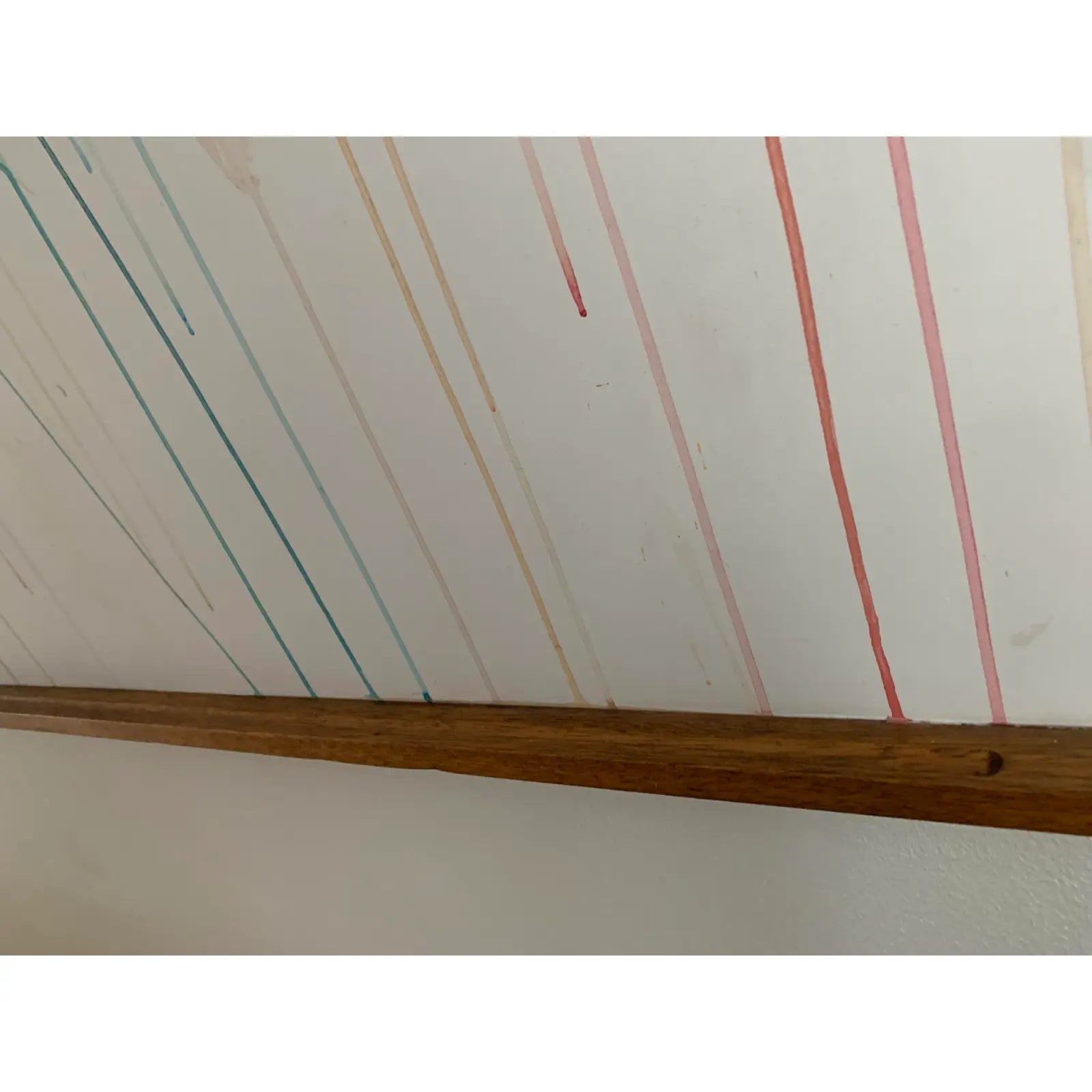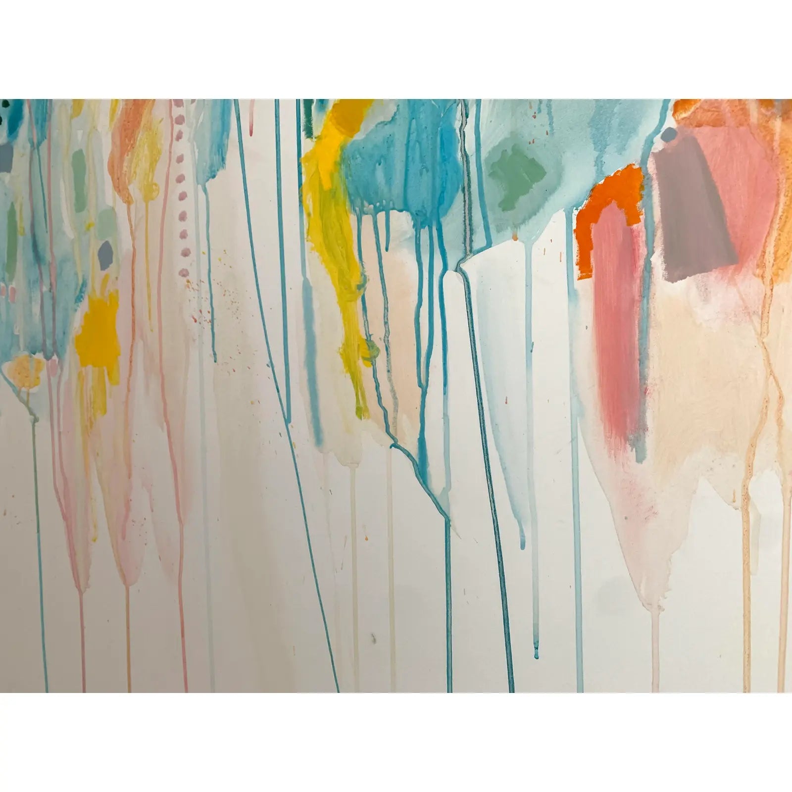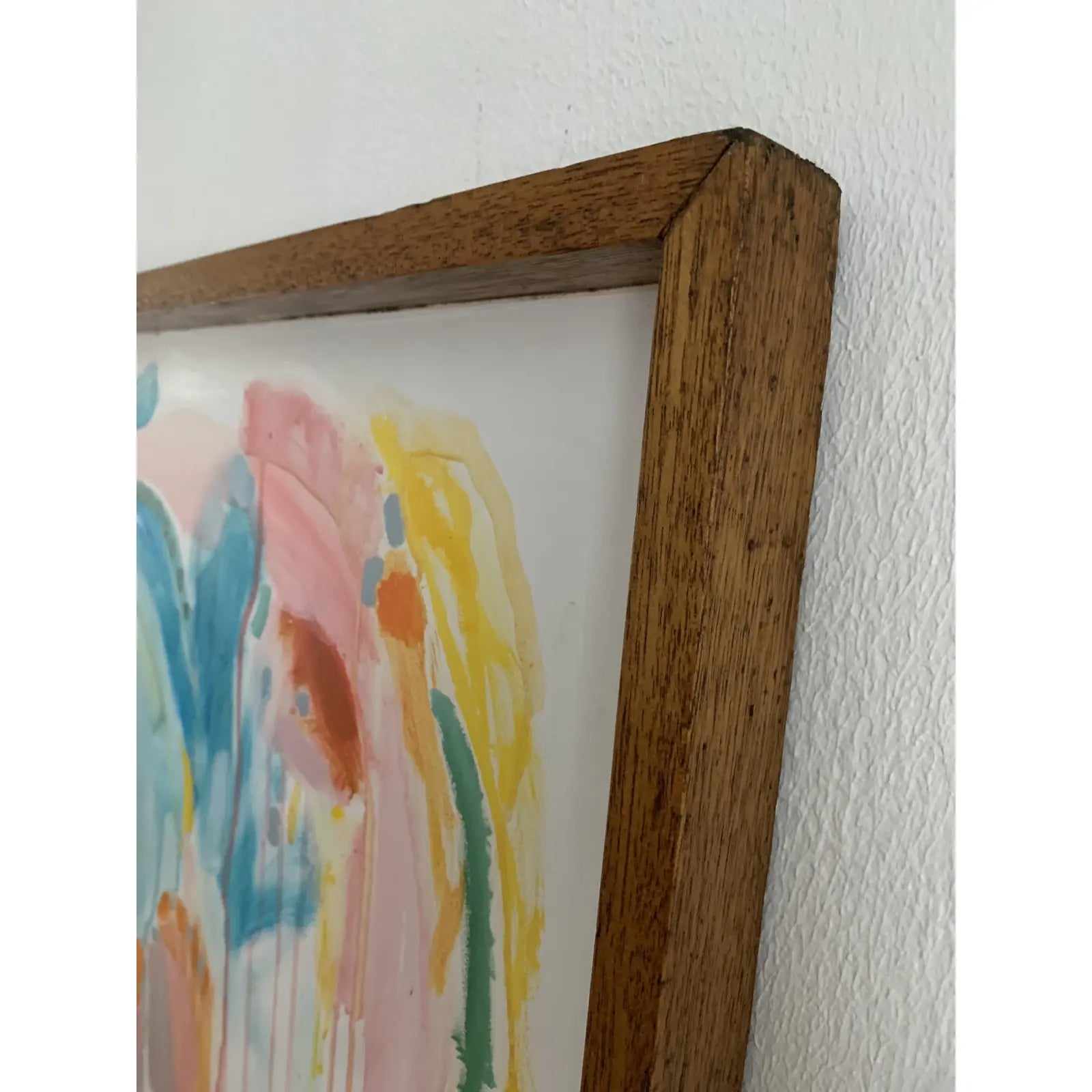 Large scale contemporary abstract acrylic on board featuring layers of pastel transparent drips, and opaque bright accents. Painted on an a vintage solid oak framed school display board.