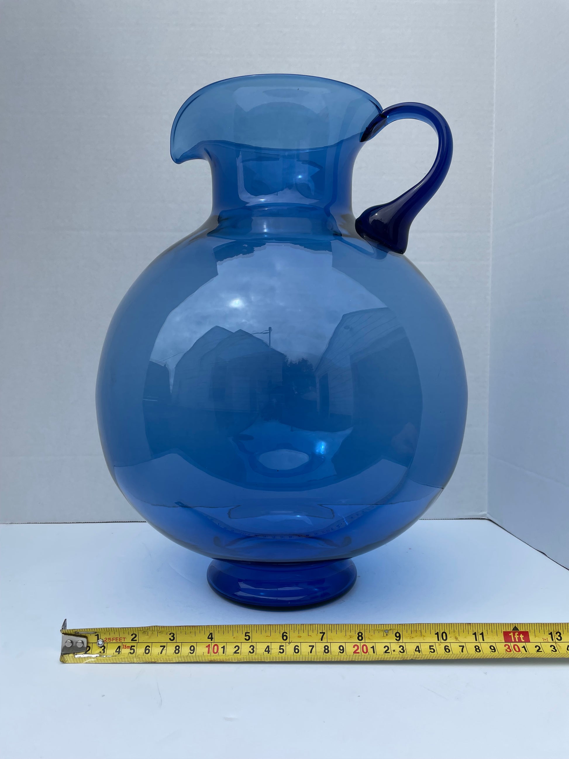 Rare elegant large scale, 12in W x 16in H, hand blown blue pitcher form glassware for Tiara Exclusives, circa 1970s, and comes with its original box. Brand new in box; No chips, cracks, or breaks.