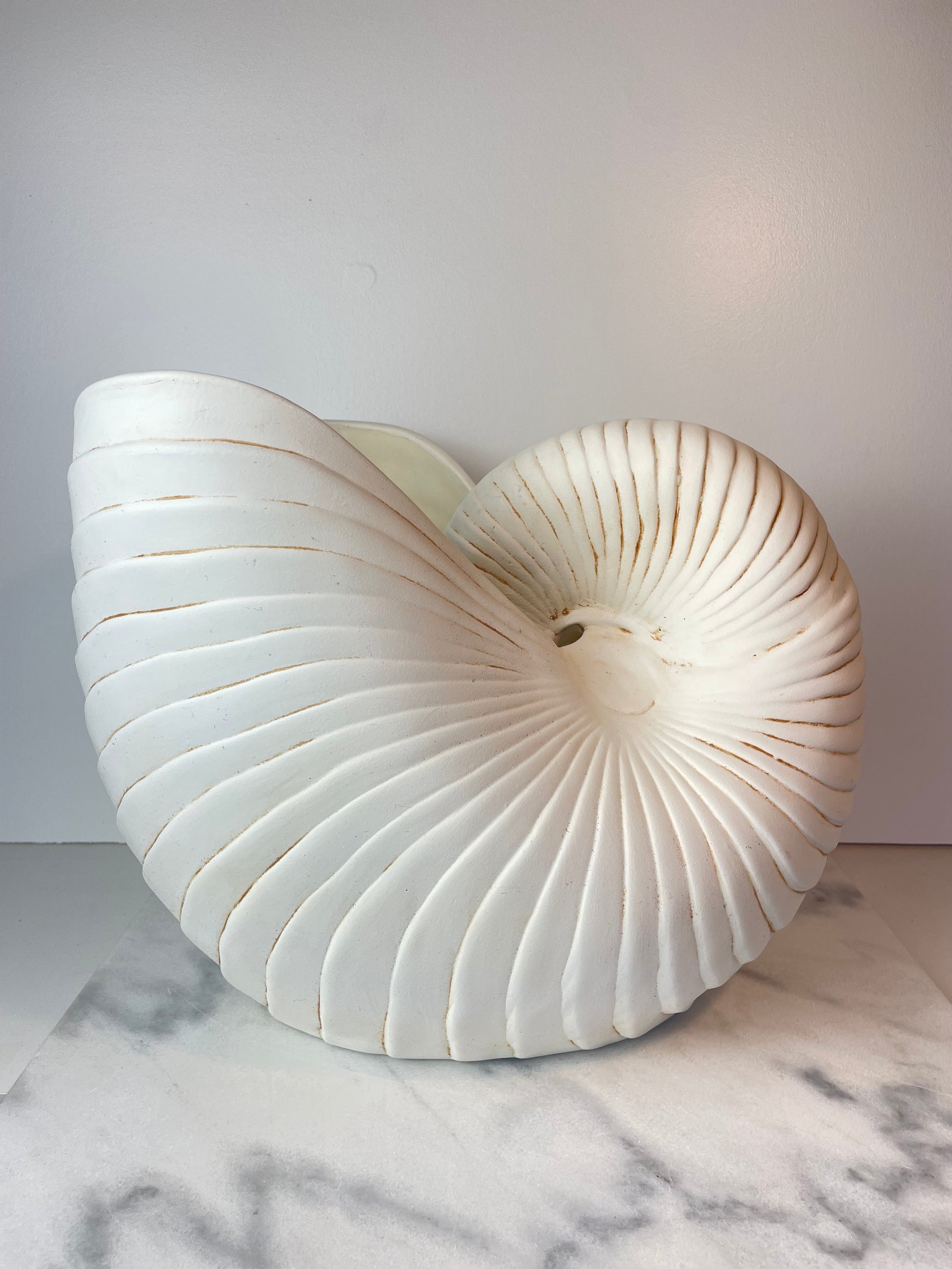 Stunning extra large ceramic nautilus shell sculpture that doubles as a decorative pot or vessel. This sculptural piece captures the natural beauty of the sea with its flowing organic curves and glossy ceramic finish, making it a striking focal point for coastal, modern, or minimalist interiors. Perfect as a statement centerpiece, planter, or artistic accent in any sophisticated seaside or contemporary home.