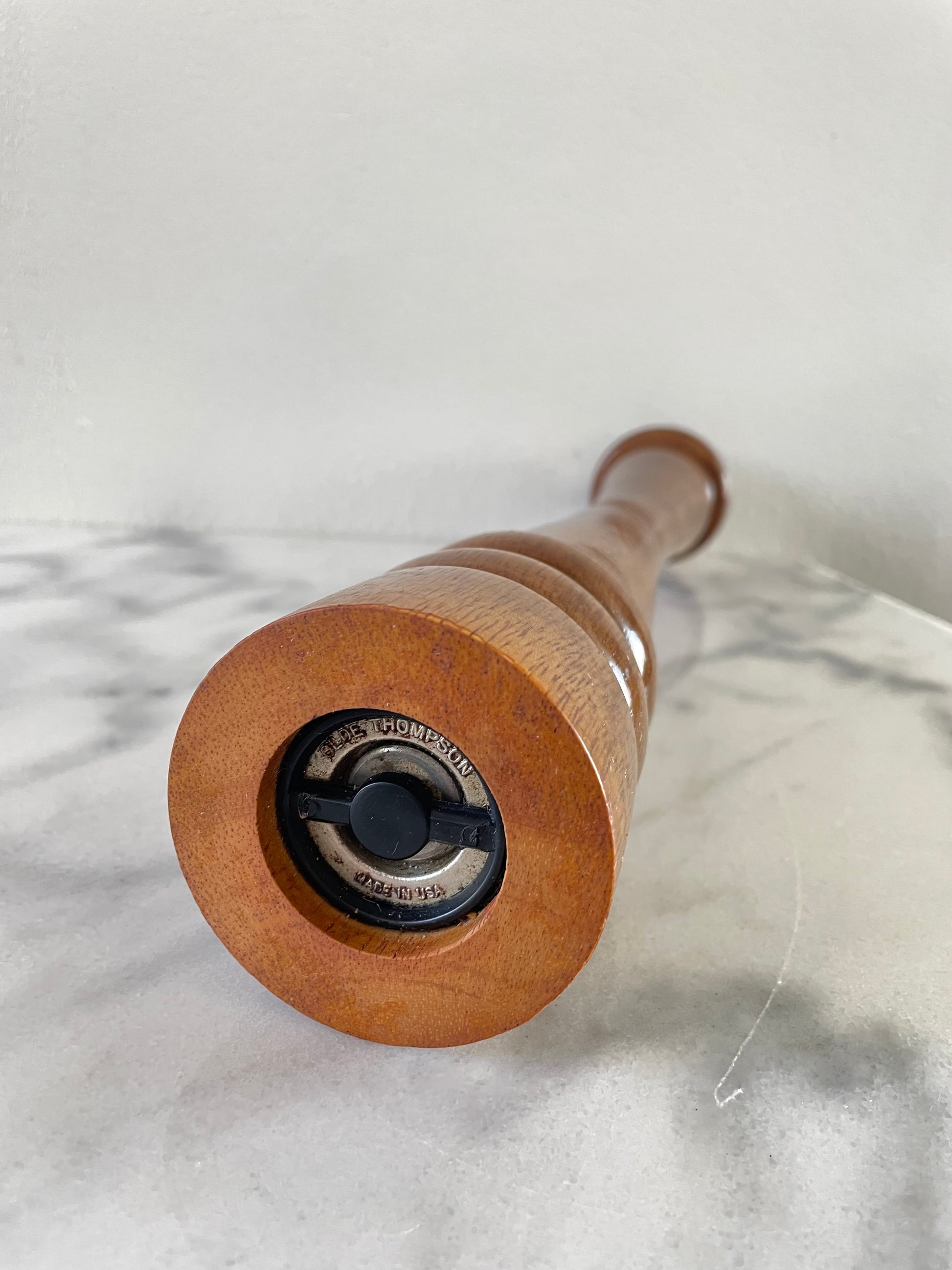 Add a dash of style to your serving experience with this statement pepper shaker. This tall solid hardwood pepper grinder with it's tall 17" turned wood form will be a sure conversation piece at a dinner party or restaurant setting. Marked Olde Thompson. This is a vintage mill made in USA. While you can still purchase these mills new, they are now made in China.