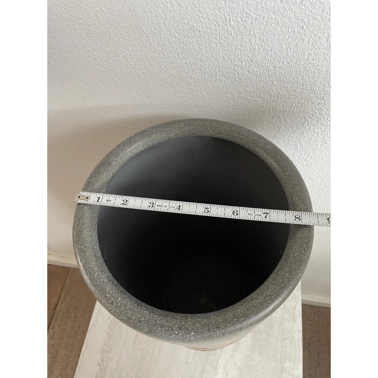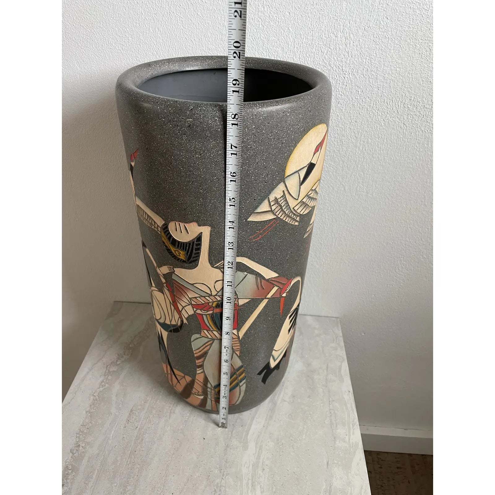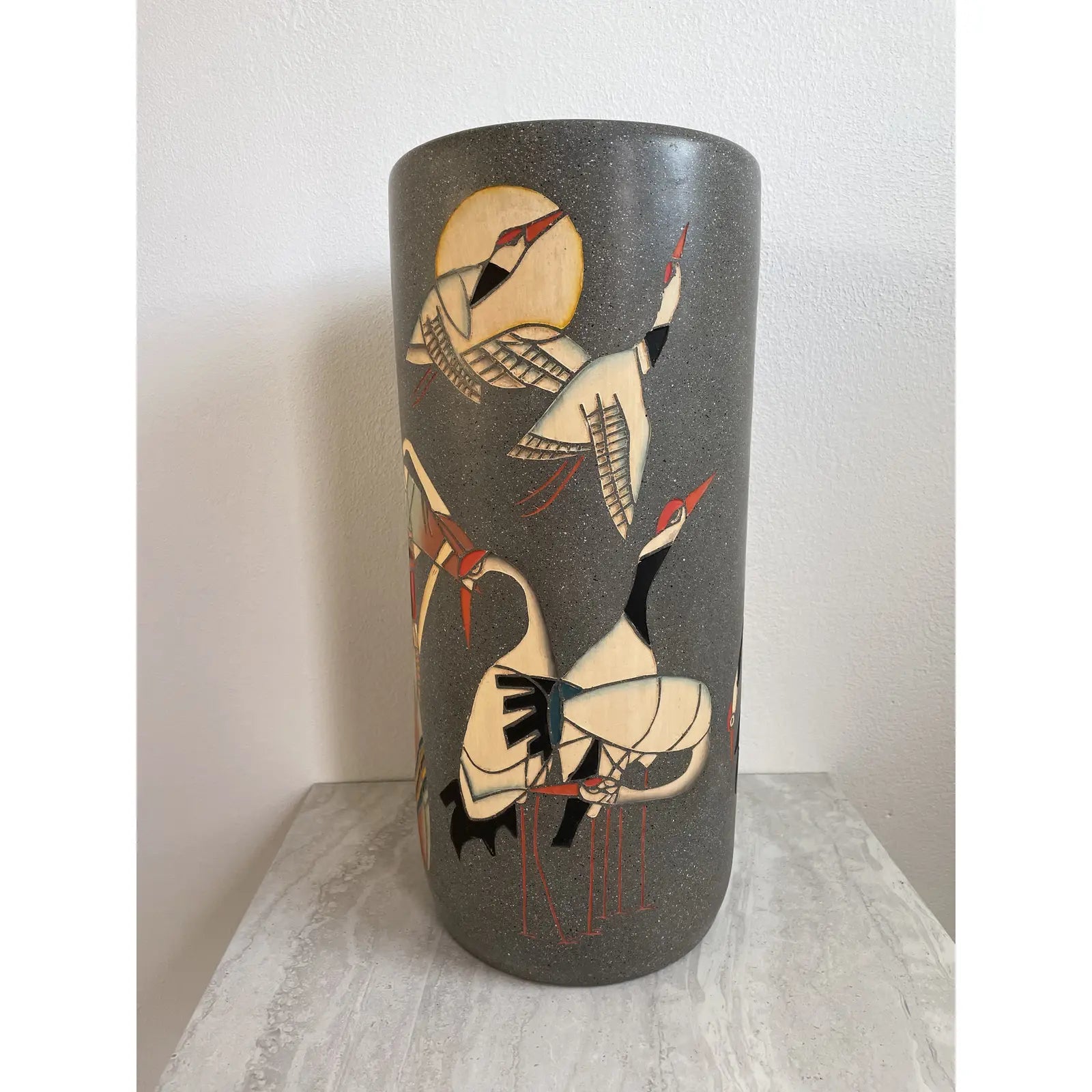 Vintage tall ceramic floor vase or umbrella stand featuring a stylized art deco Japanese motif with Geisha and cranes.