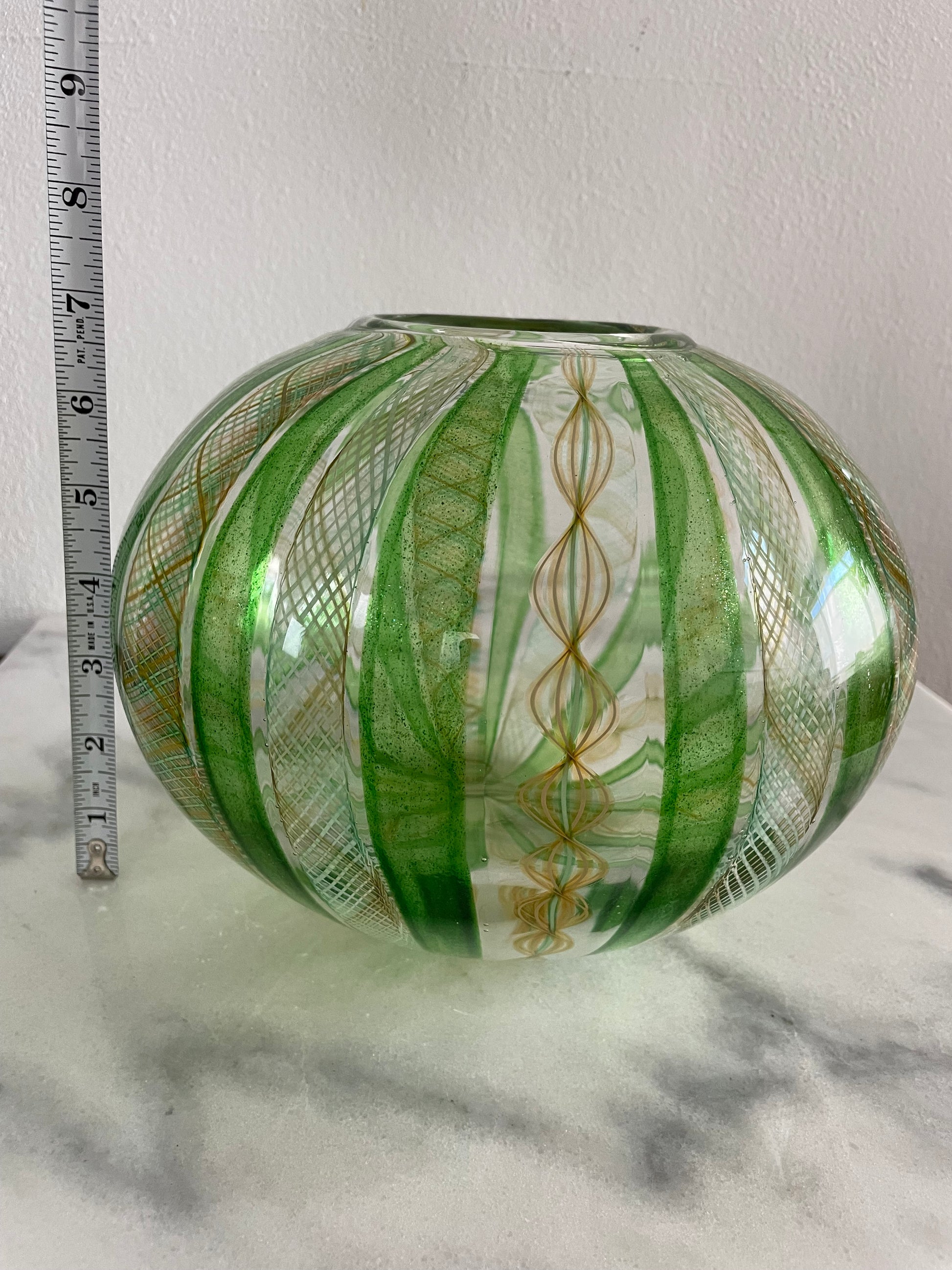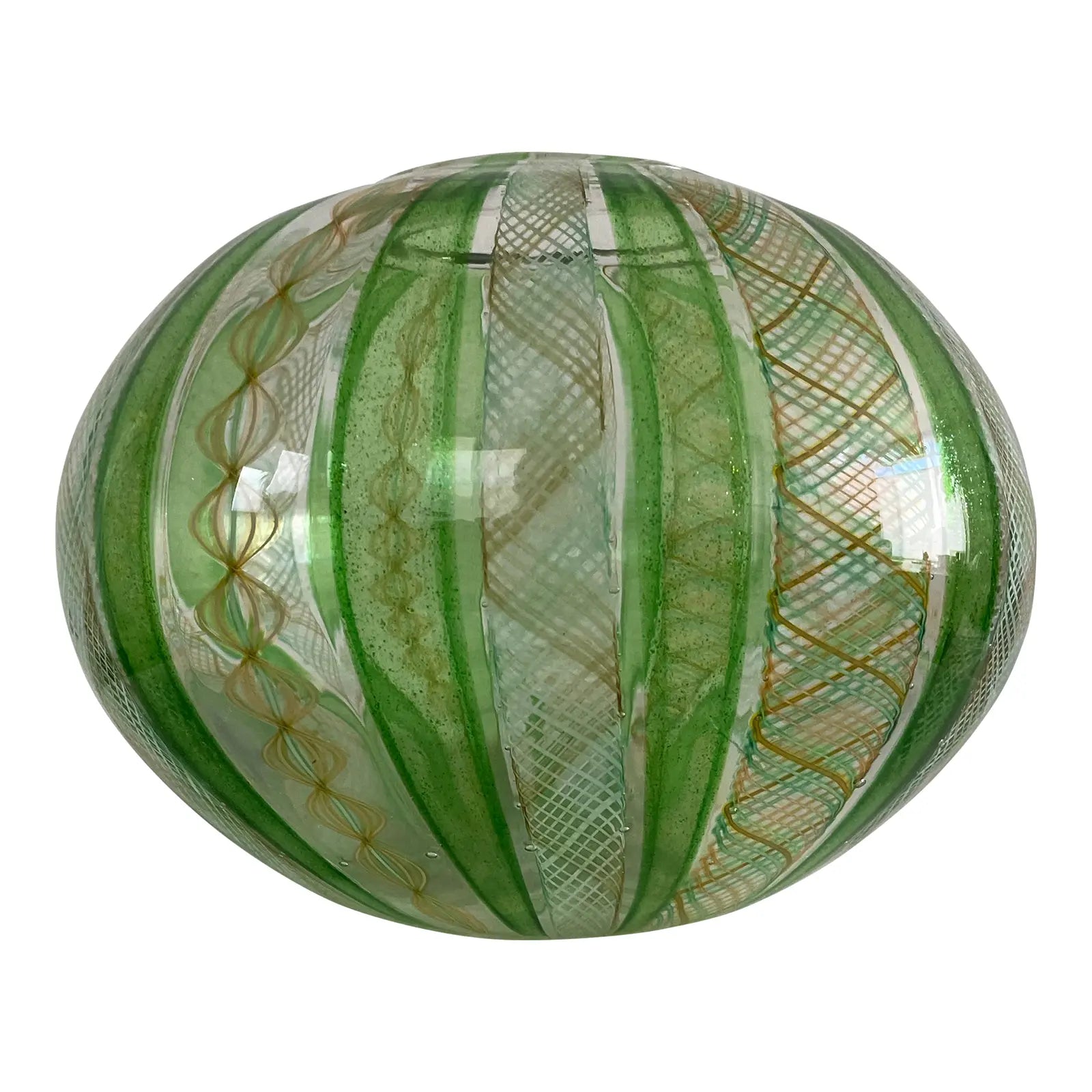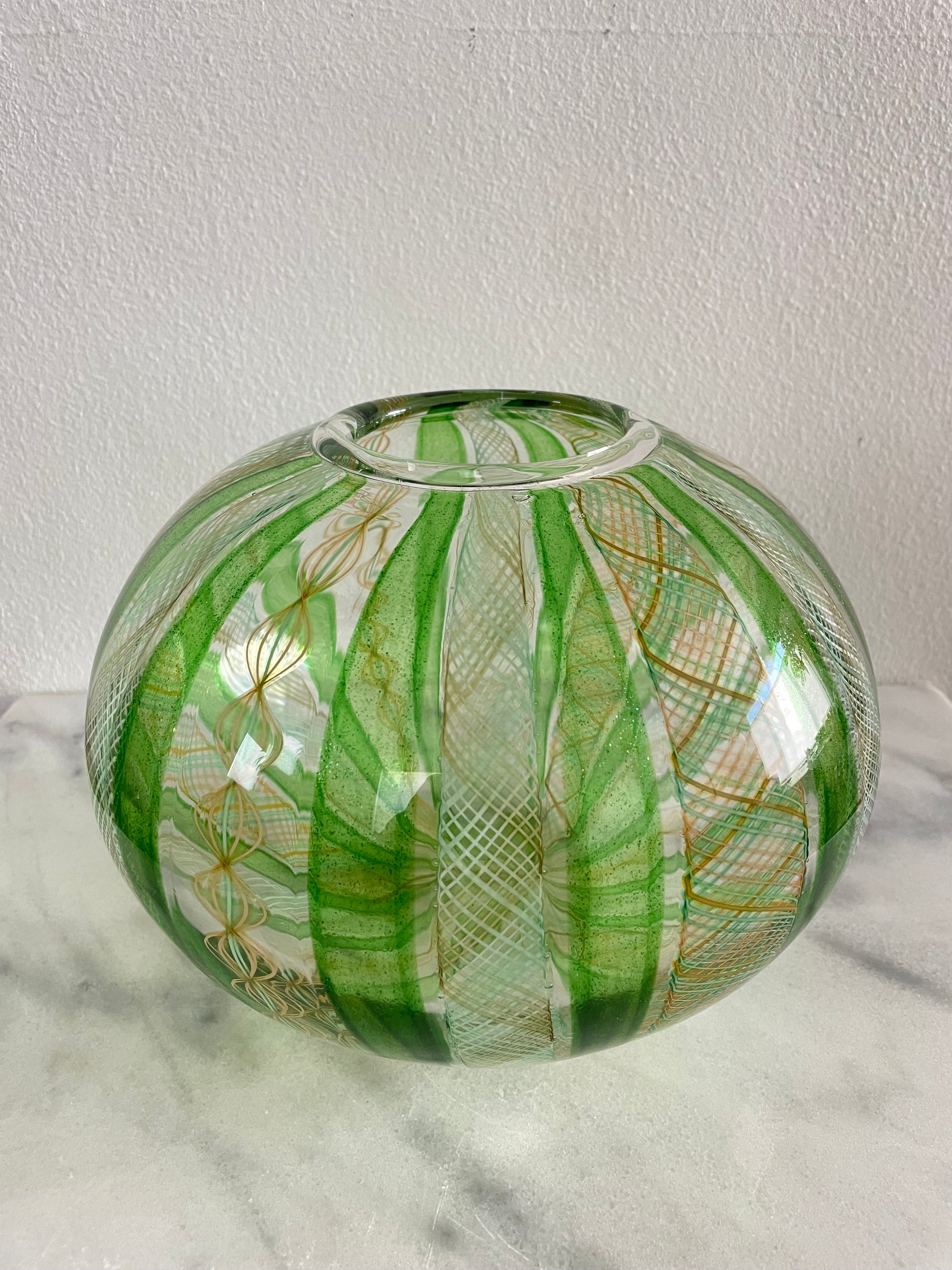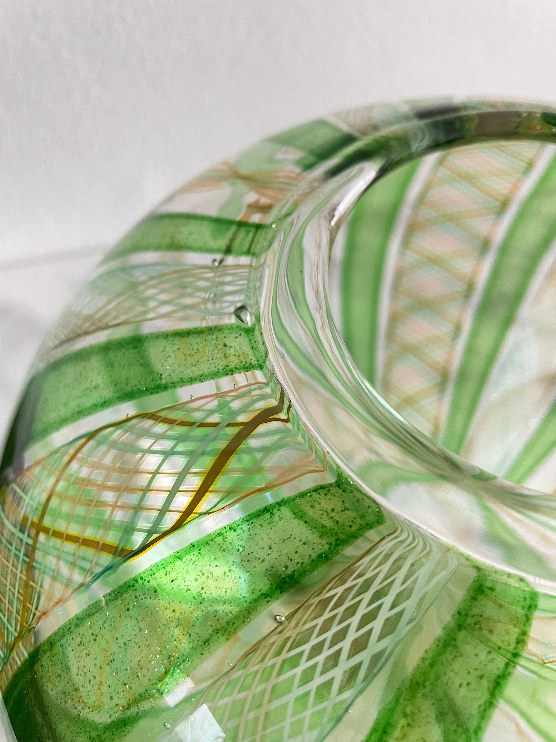 Late 20th Century Handblown Art Glass Vase in Green and Gold Stripe and Plaid Design
