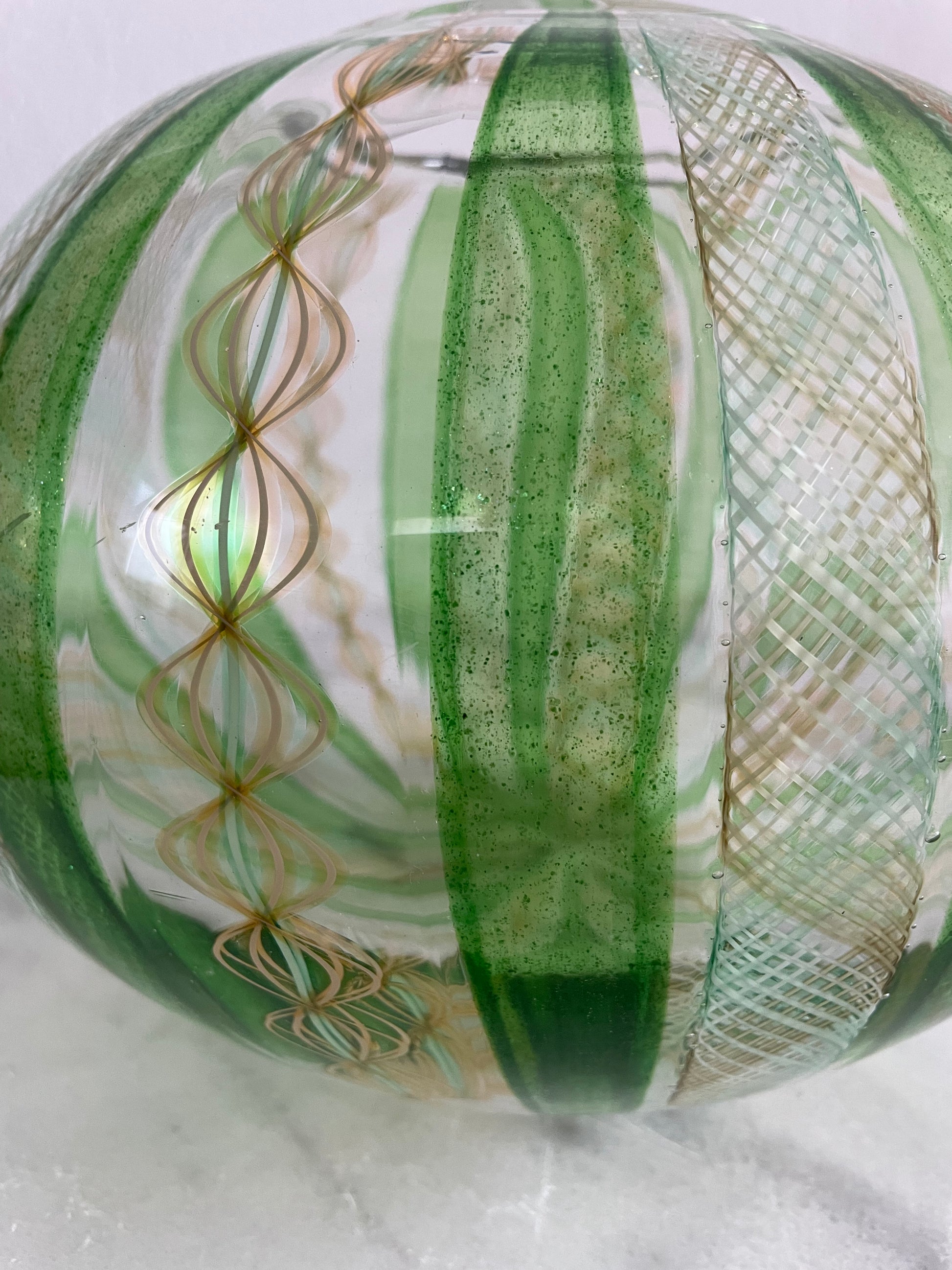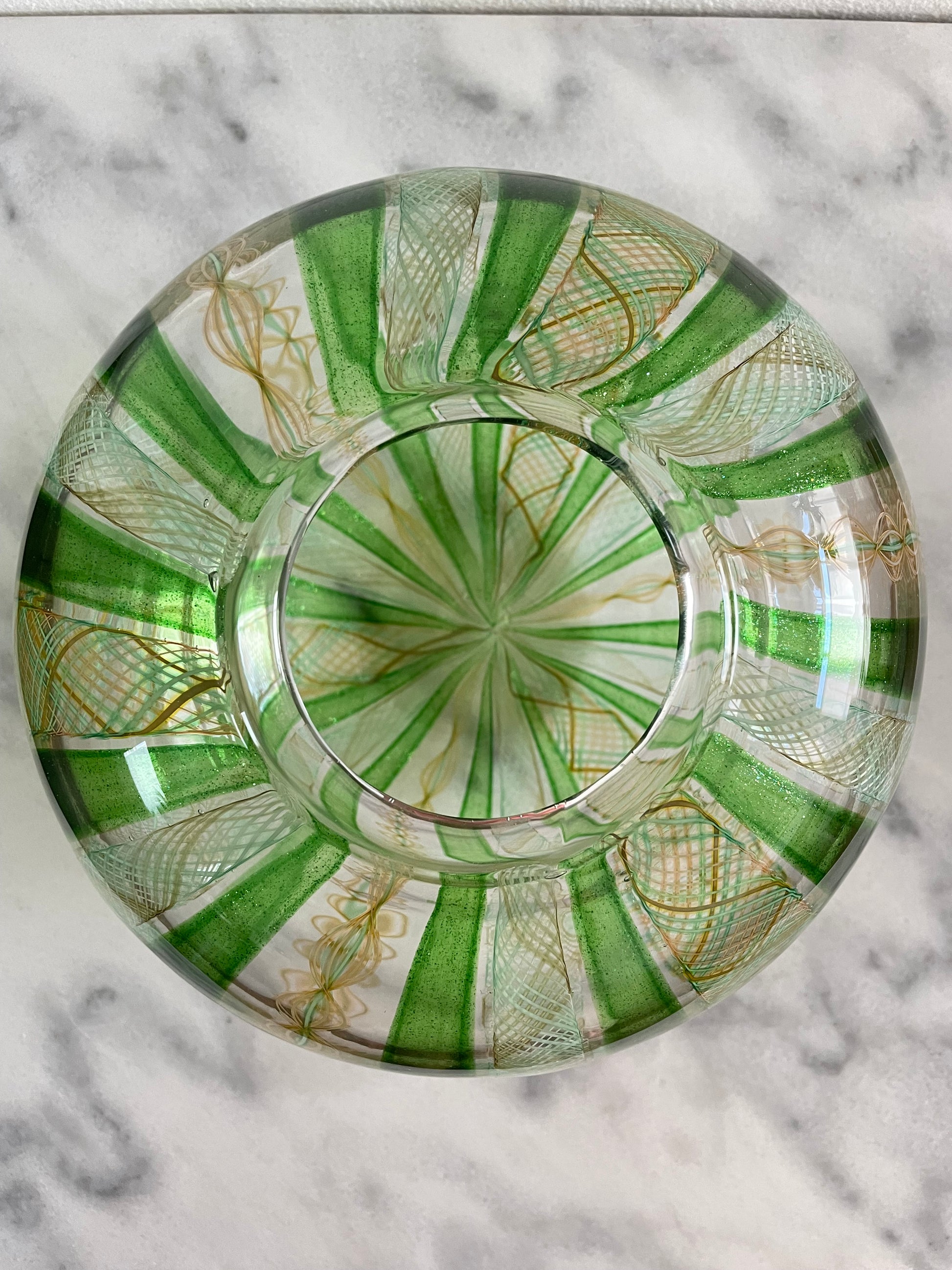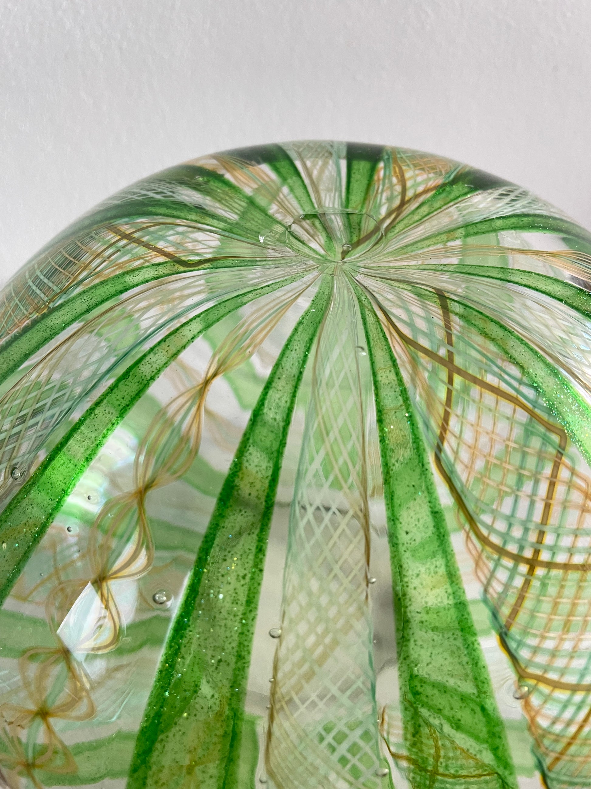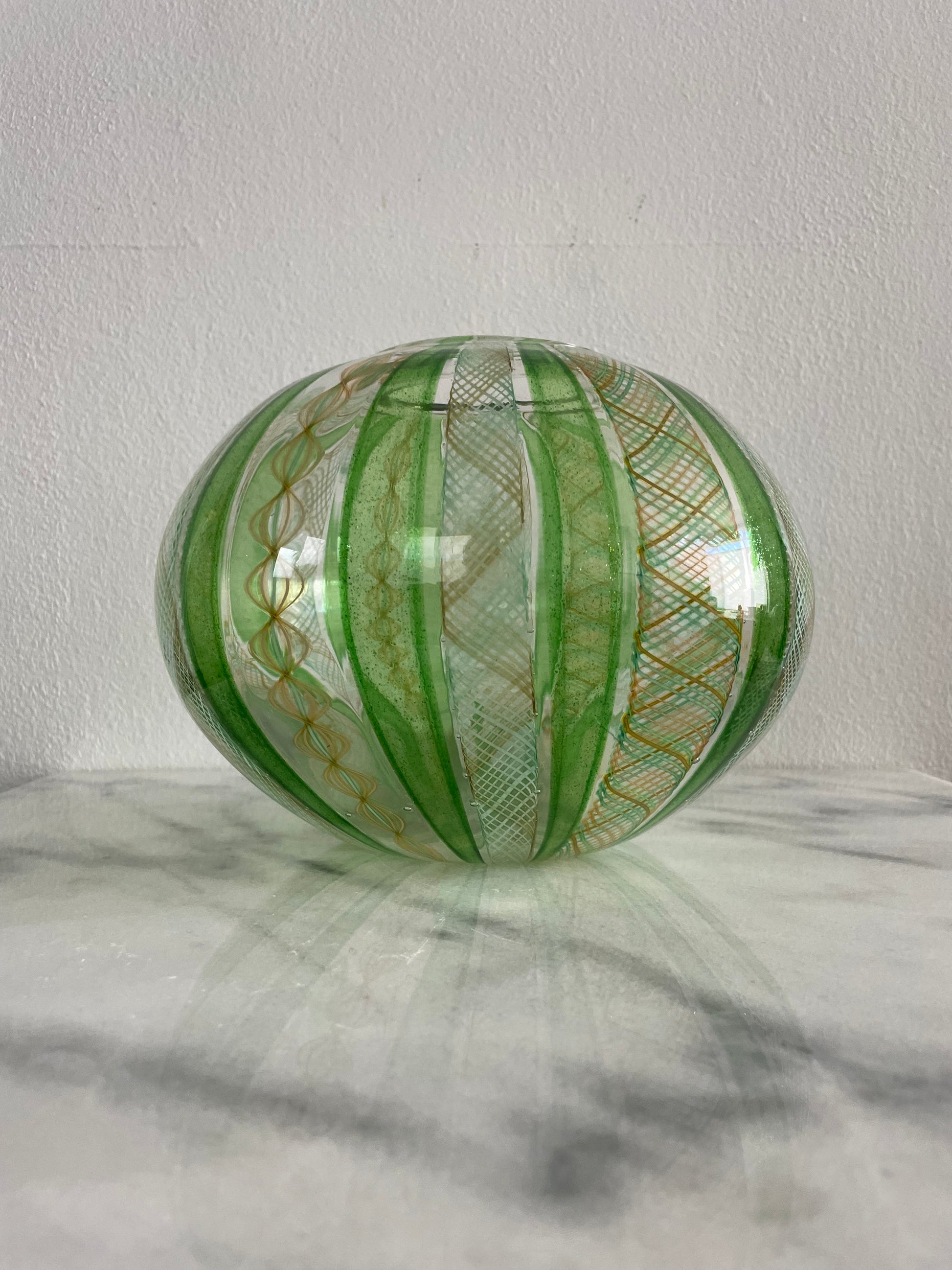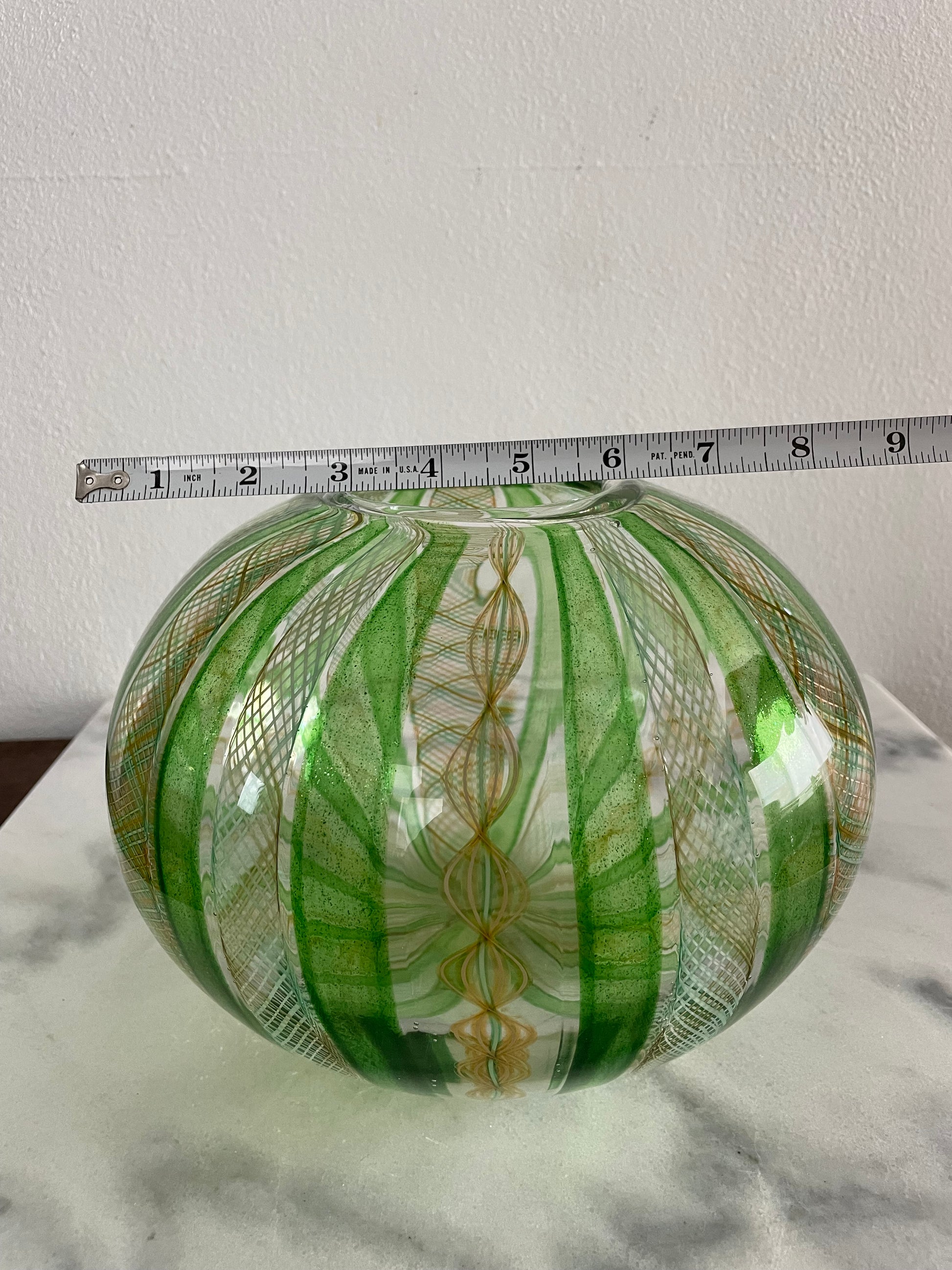 Late 20th Century Handblown Art Glass Vase in Green and Gold Stripe and Plaid Design