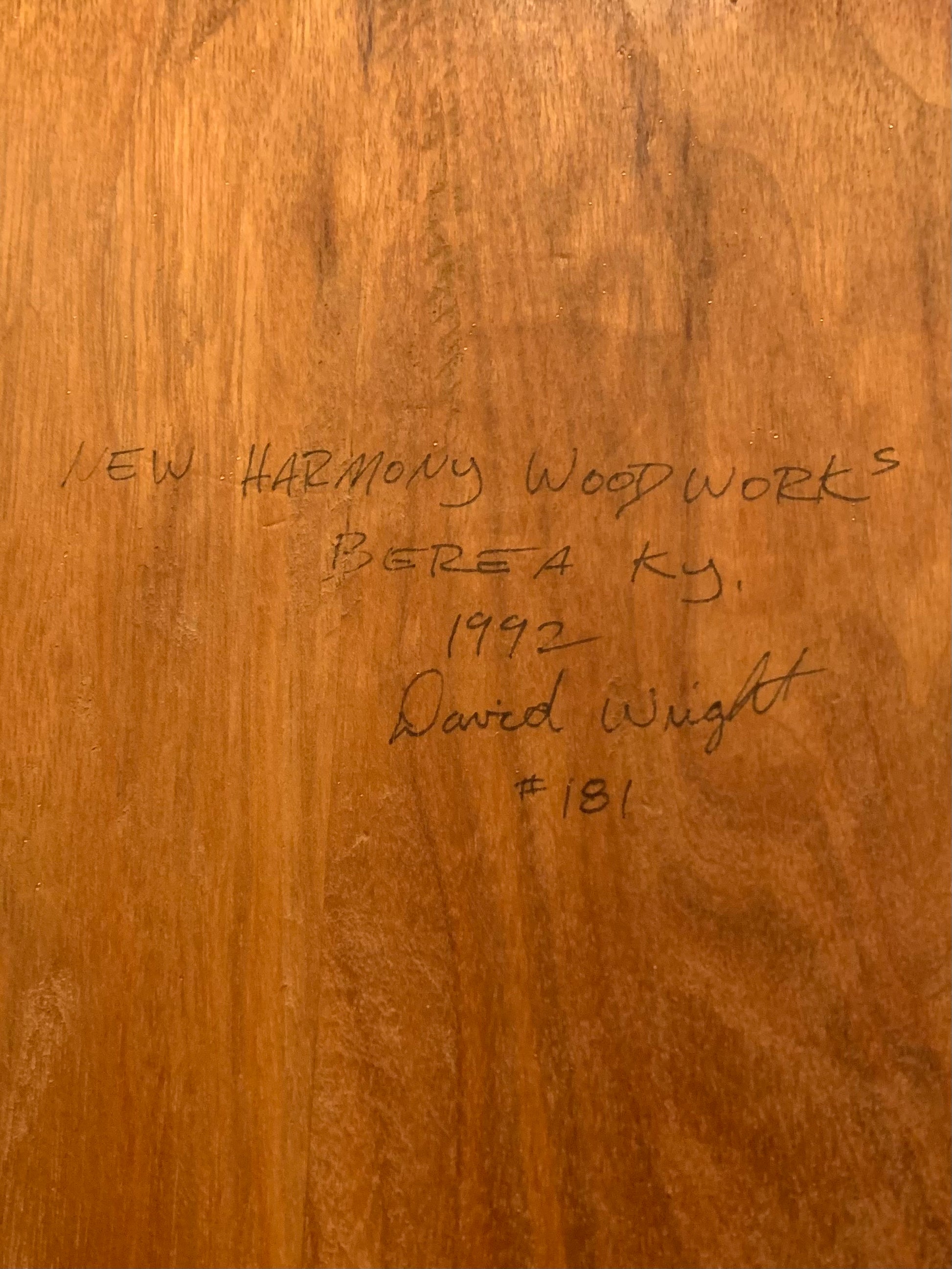 A pair of solid wood hand crafted armchairs by master craftsman David Wright. Wright uses the traditional hand tools, methods, and joinery used by 18th century chair makers. The chairs are signed and dated on the bottom.