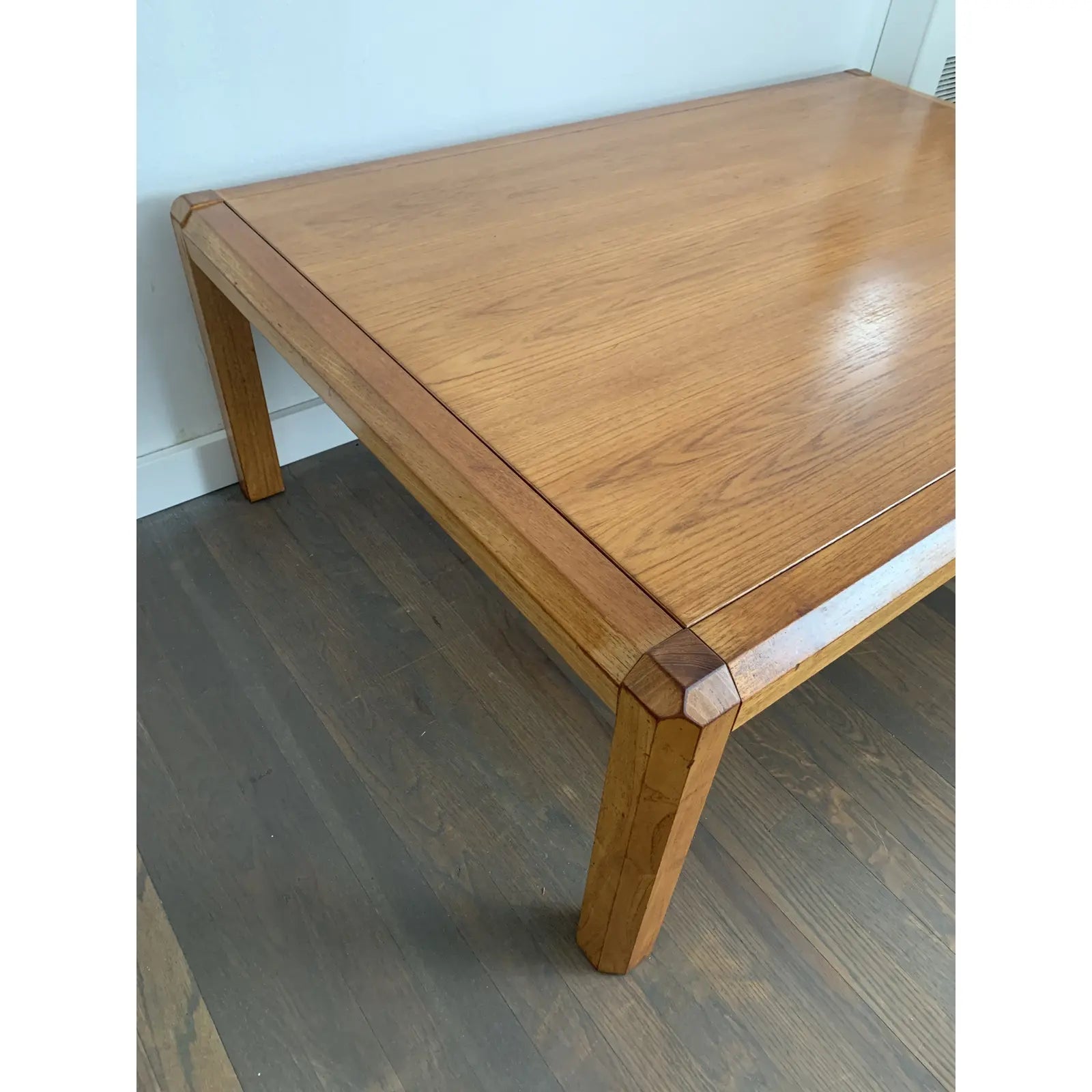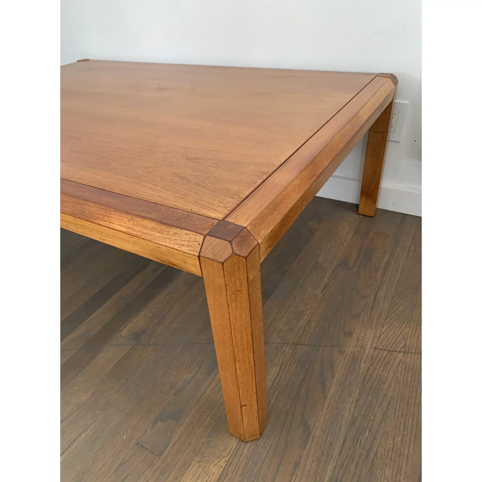 This large scale Danish Modern teak coffee table features richly grained teak wood and chamfered corners highlighting the end grain. The table is marked on the bottom, Made in Denmark.
