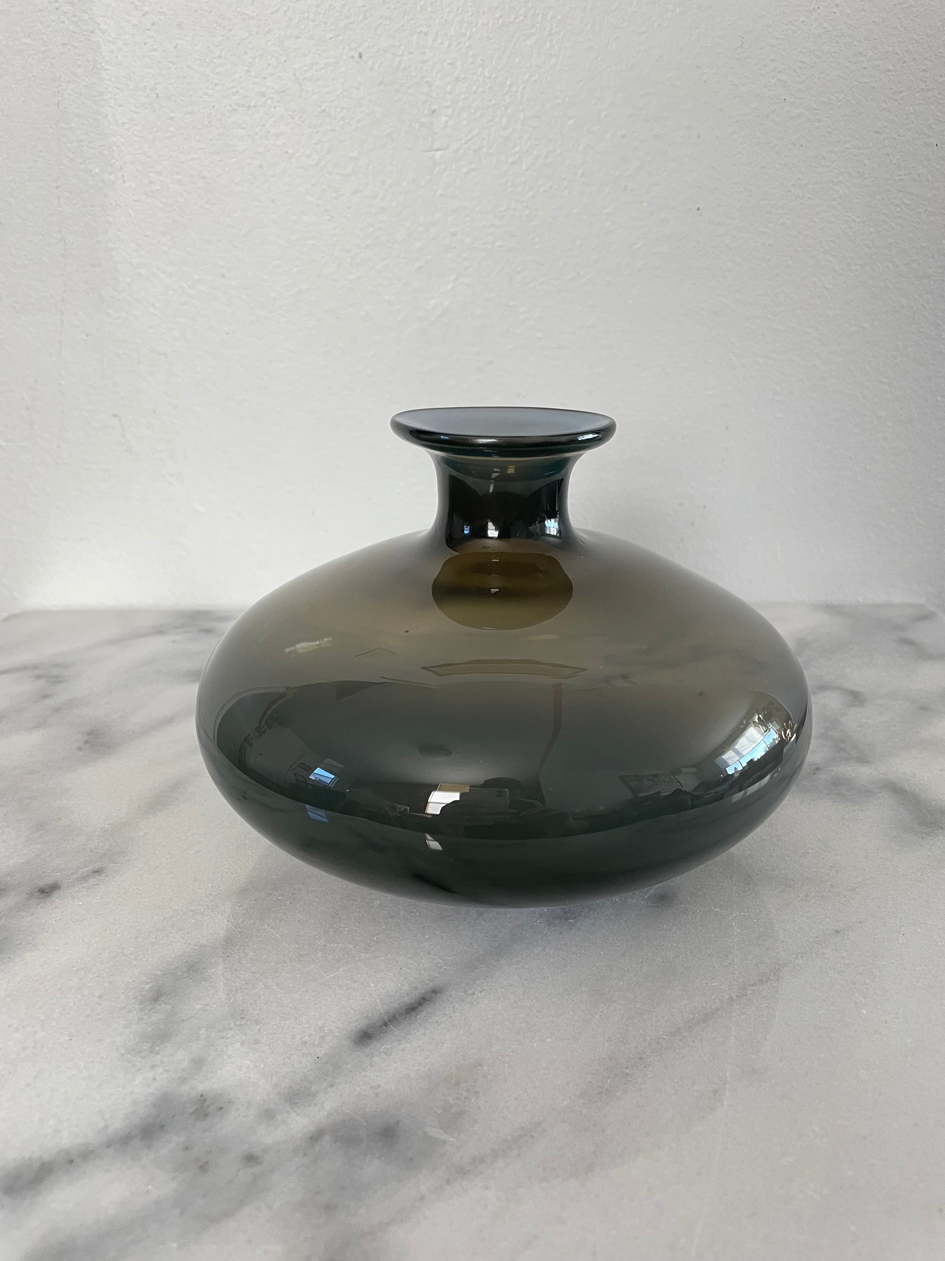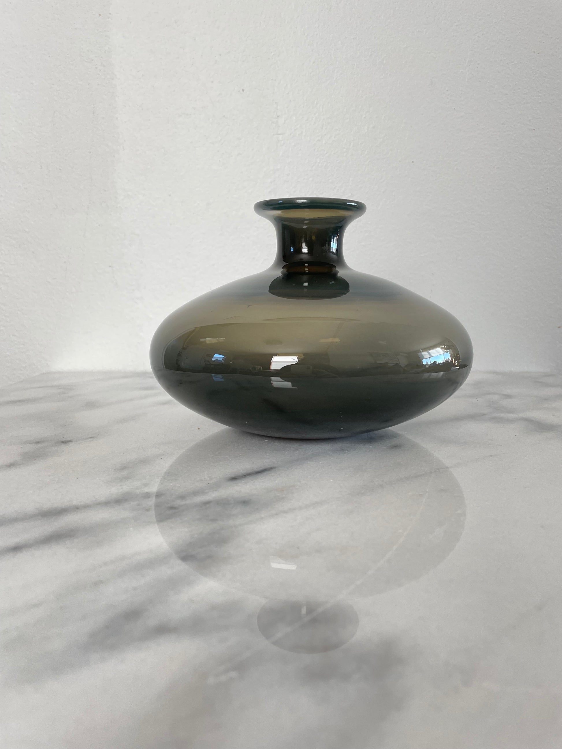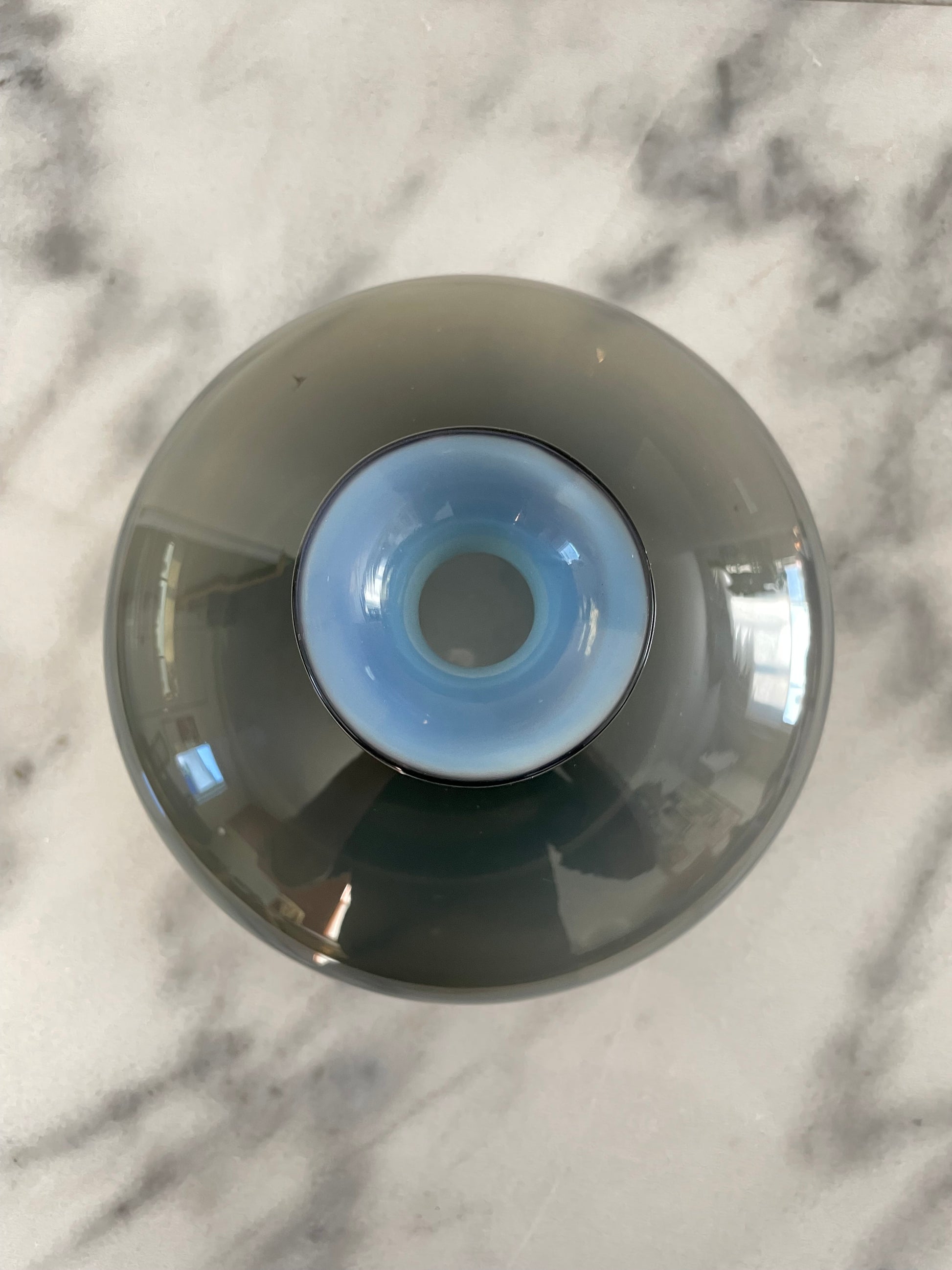 Mouth blown studio glass vase in rich grey green tone with internal opalescence. Reminiscent of moonlight on water this gorgeous low profile oval base has with a beautifully raised neck that to reveals interior glow. Sophisticated handcrafted vase sure to bring interest and appeal to any surface, be it table or shelf.