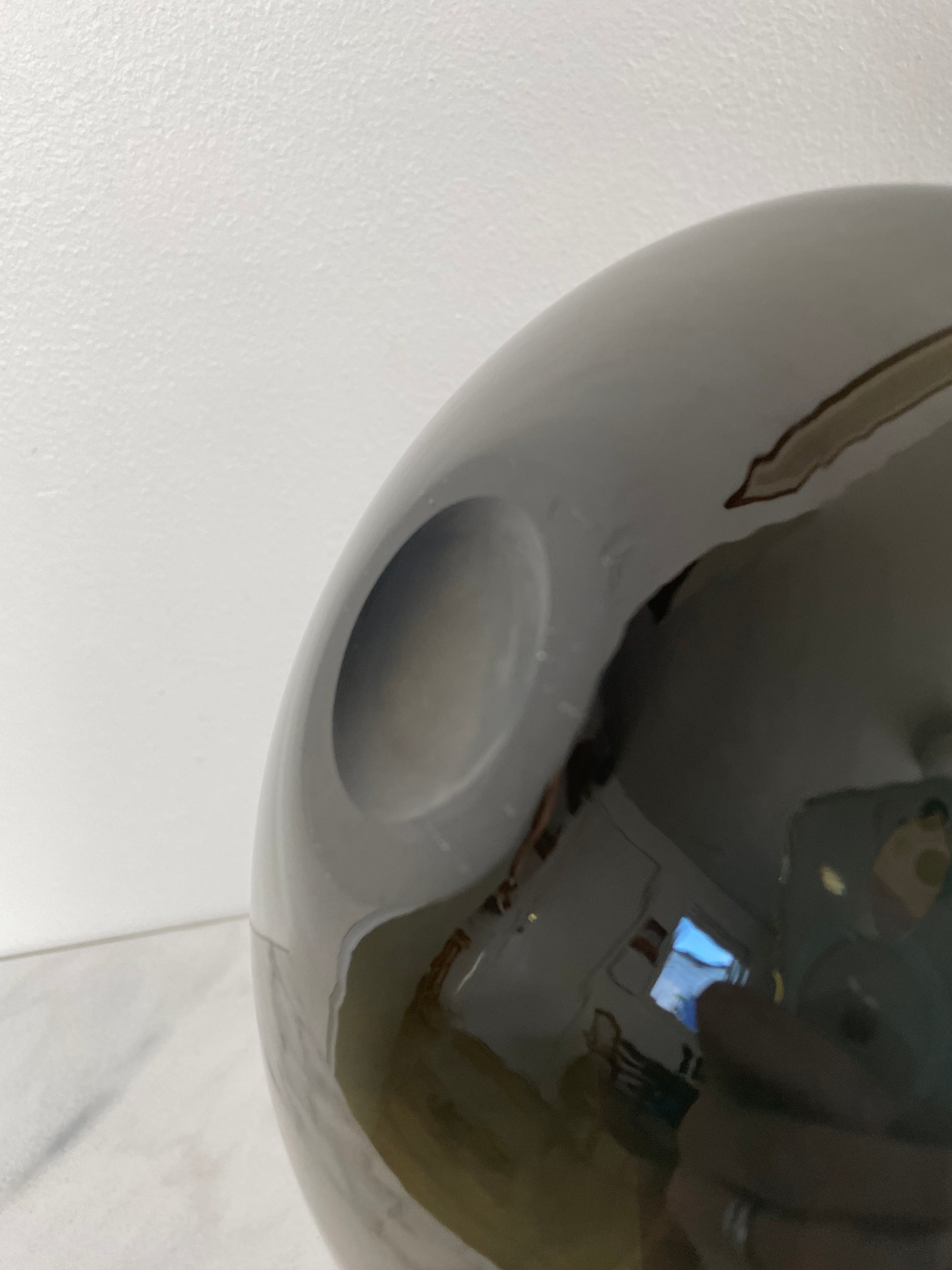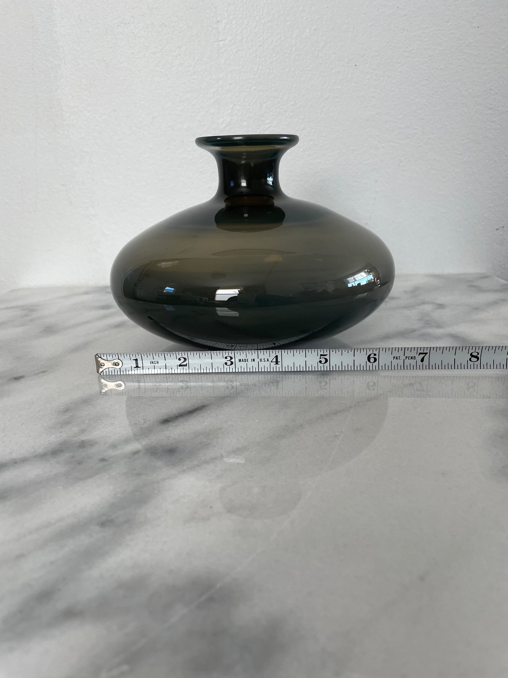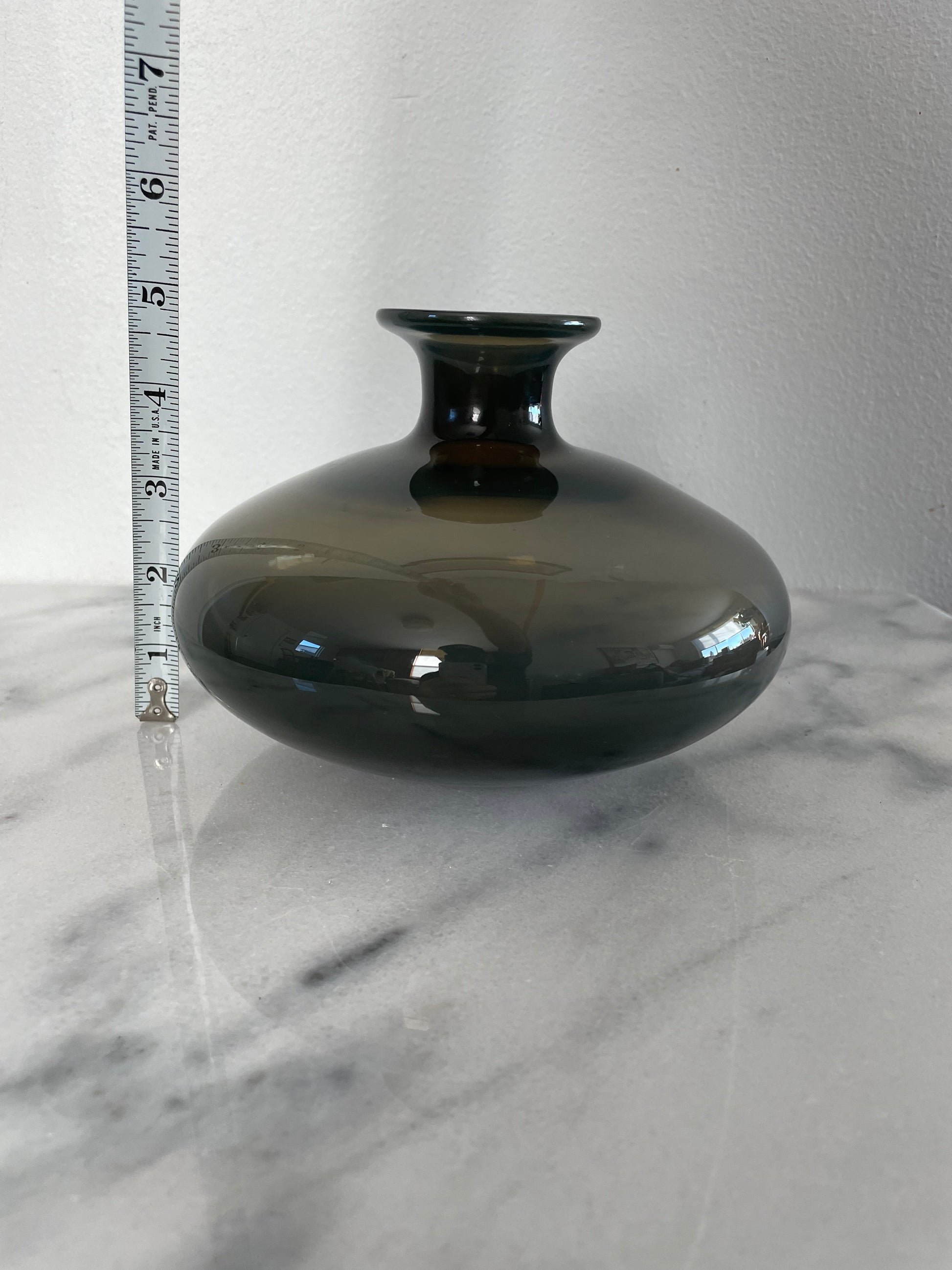 Mouth blown studio glass vase in rich grey green tone with internal opalescence. Reminiscent of moonlight on water this gorgeous low profile oval base has with a beautifully raised neck that to reveals interior glow. Sophisticated handcrafted vase sure to bring interest and appeal to any surface, be it table or shelf.