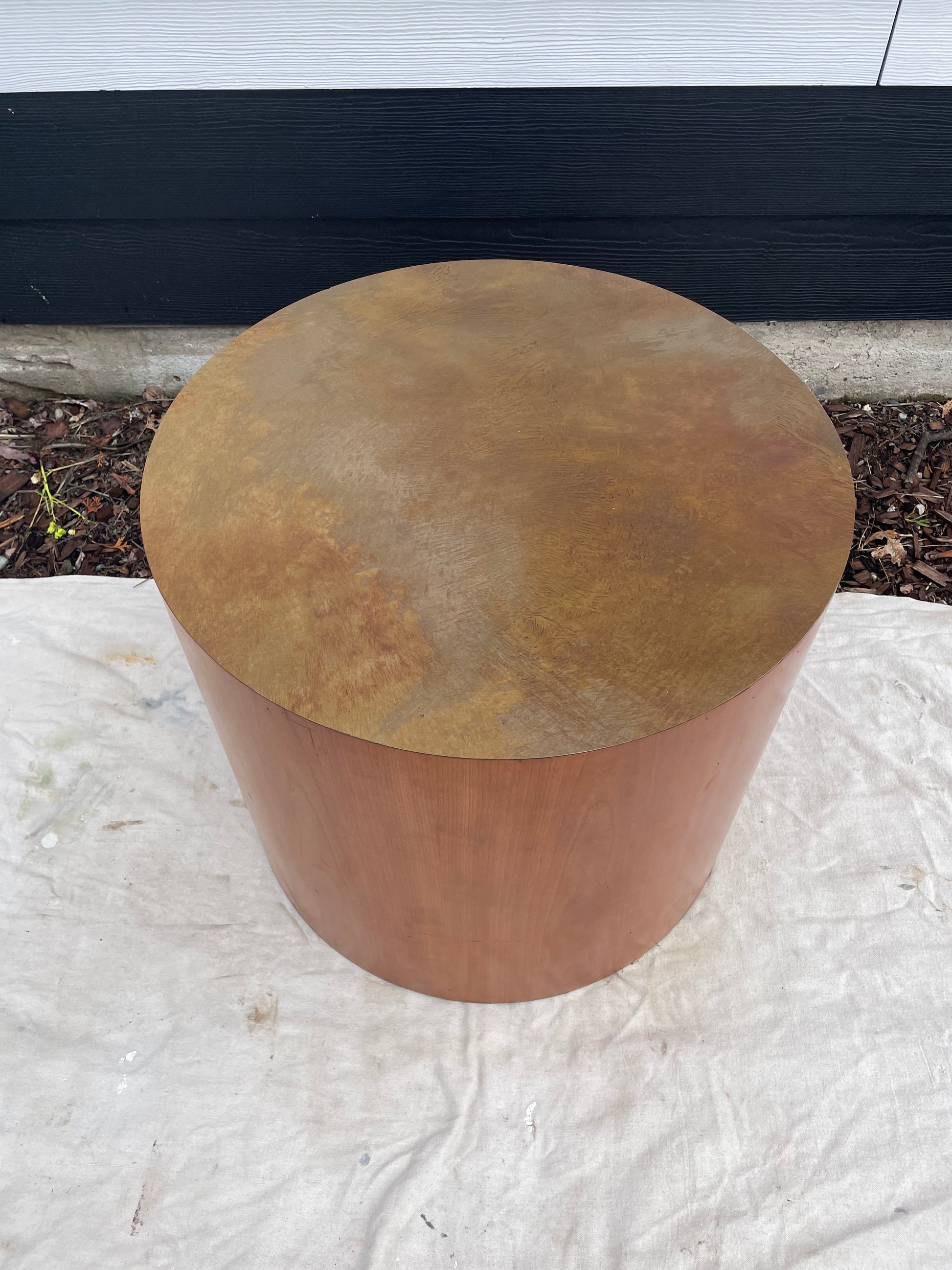 A striking Paul Mayen–style drum table, wrapped in rich cherry wood and topped with an oxidized metal surface for a refined, industrial-modern look. Its sculptural silhouette and warm patina make it a standout accent piece for contemporary, minimalist, or mid-century interiors. Perfect as a side table, statement pedestal, or unique foyer piece, this vintage gem brings both artful presence and timeless design appeal to any room.