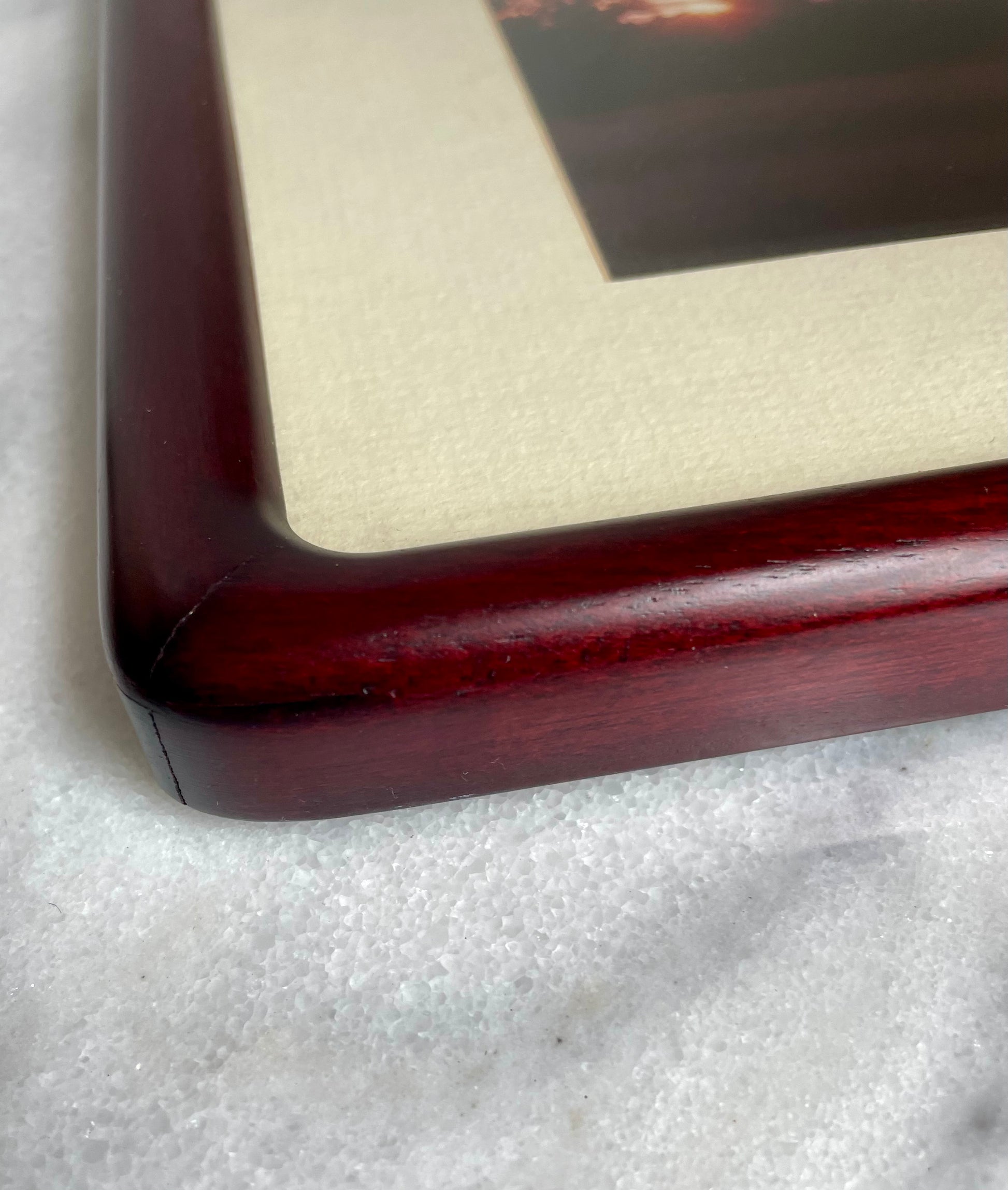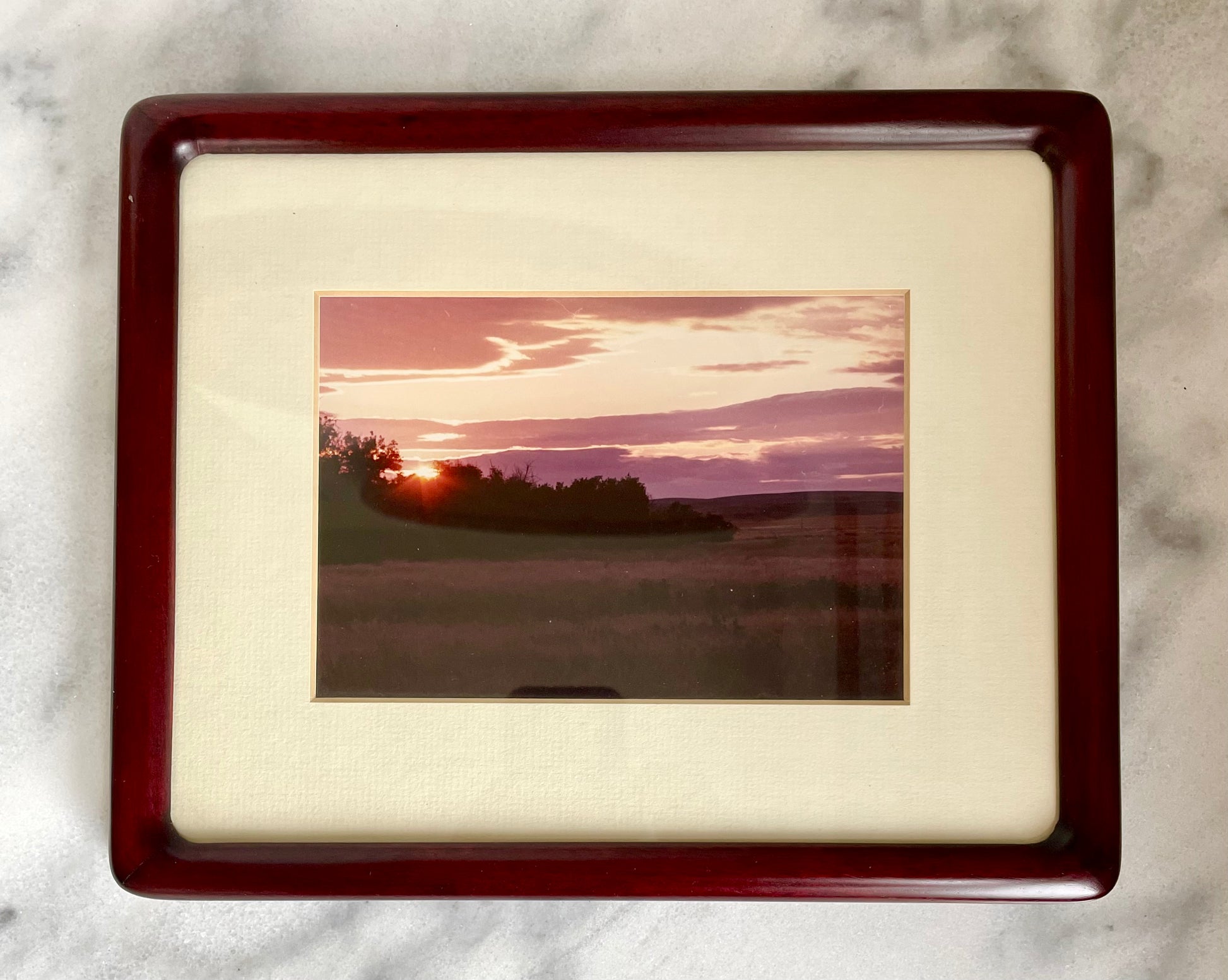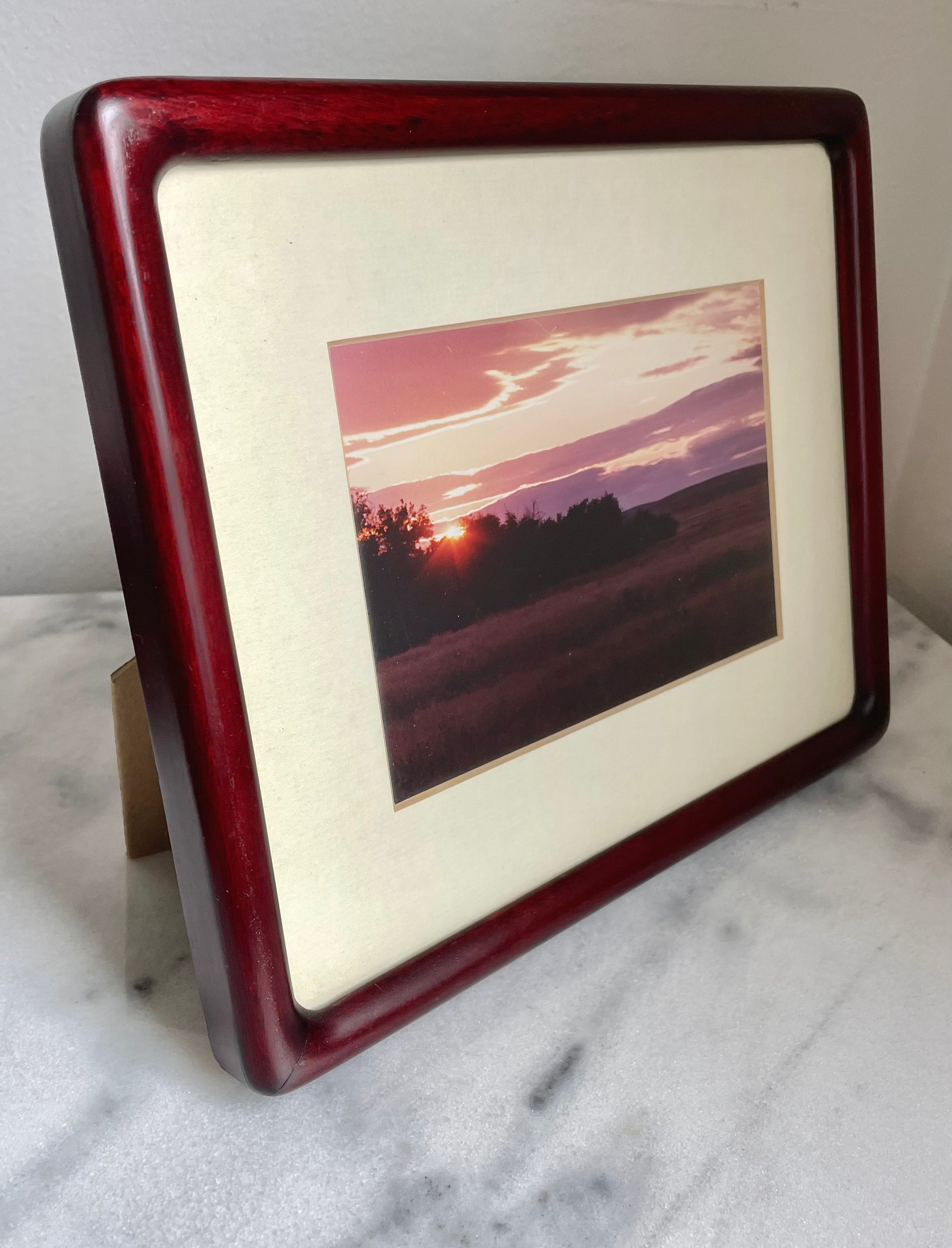 A vintage rosewood picture frame with soft edges and rich red coloring, perfect for hanging or propped on a table or desktop.
